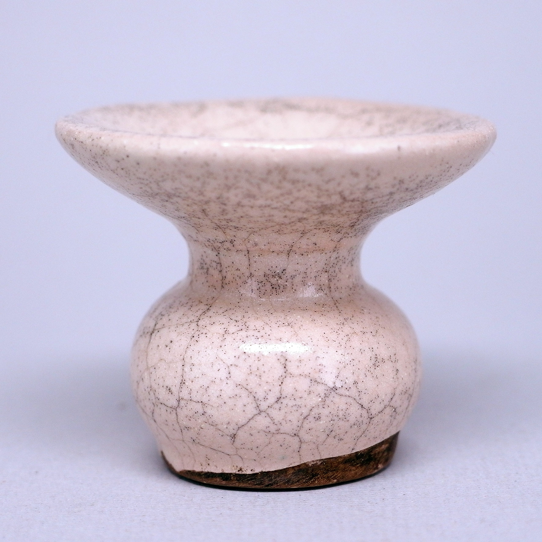 此件德化窯觀音坐像,通體施白釉,釉質溫潤如脂,隱現細密自然的開片紋理,為德化瓷高溫燒成後的典型表現。觀音結跏趺坐,身姿端莊而不拘謹,面容慈和寧靜,五官比例勻稱,衣紋線條流暢柔和,層層垂墜間富有立體感。整體造型兼具雕塑感與瓷質光澤,充分展現德化窯白瓷在人物塑造上的高度成就。 何朝宗為明代德化窯最負盛名的瓷塑大師,其觀音造像以「神情勝於形似」著稱,深刻影響後世德化人物瓷風格。此類作品融合佛教信仰與文人審美,既具宗教供奉功能,亦可作為案頭清供賞玩。其素淨無華的白瓷之美,象徵觀音的清淨慈悲,也體現明代晚期對精神性與內在修為的追求,堪稱德化瓷塑藝術的經典典範。