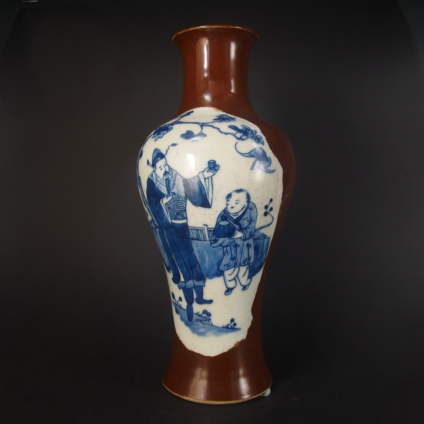 此瓶的整體造型摹仿自古代青銅壺的樣式,屬於元代龍泉窯常見的瓶式之一。其器型輪廓飽滿,具有撇口或斂口、長頸、鼓腹、圈足的特點。瓶頸兩側貼飾對稱的雙環耳(或稱貫耳),環耳下垂,使得造型更加古樸莊重。器腹可見數道凸起弦紋(即旋紋),作為主要的裝飾,這種簡潔的弦紋裝飾在宋元時期的貫耳瓶中很常見。 此瓶施有厚重的 青釉 ,從圖片中觀察,釉色呈 橄欖綠或青黃色調 ,這類釉色在 元代龍泉窯 中較為常見。元代龍泉窯為了應付內外銷的大量需求,其胎體相較於南宋時期通常更顯 厚重粗獷 。釉面可見許多均勻分佈的 細密白色斑點 ,這種現象通常是燒製過程中的特殊表現,與元代龍泉窯有時採用的 點褐彩 (或稱 褐斑 )裝飾手法相似,但此件的白色點狀更像是釉層本身氣泡或雜質的表現。瓶底圈足處通常 刮釉露胎 ,露胎部分在正常還原燒成後多呈 棕黃色或火石紅色 。