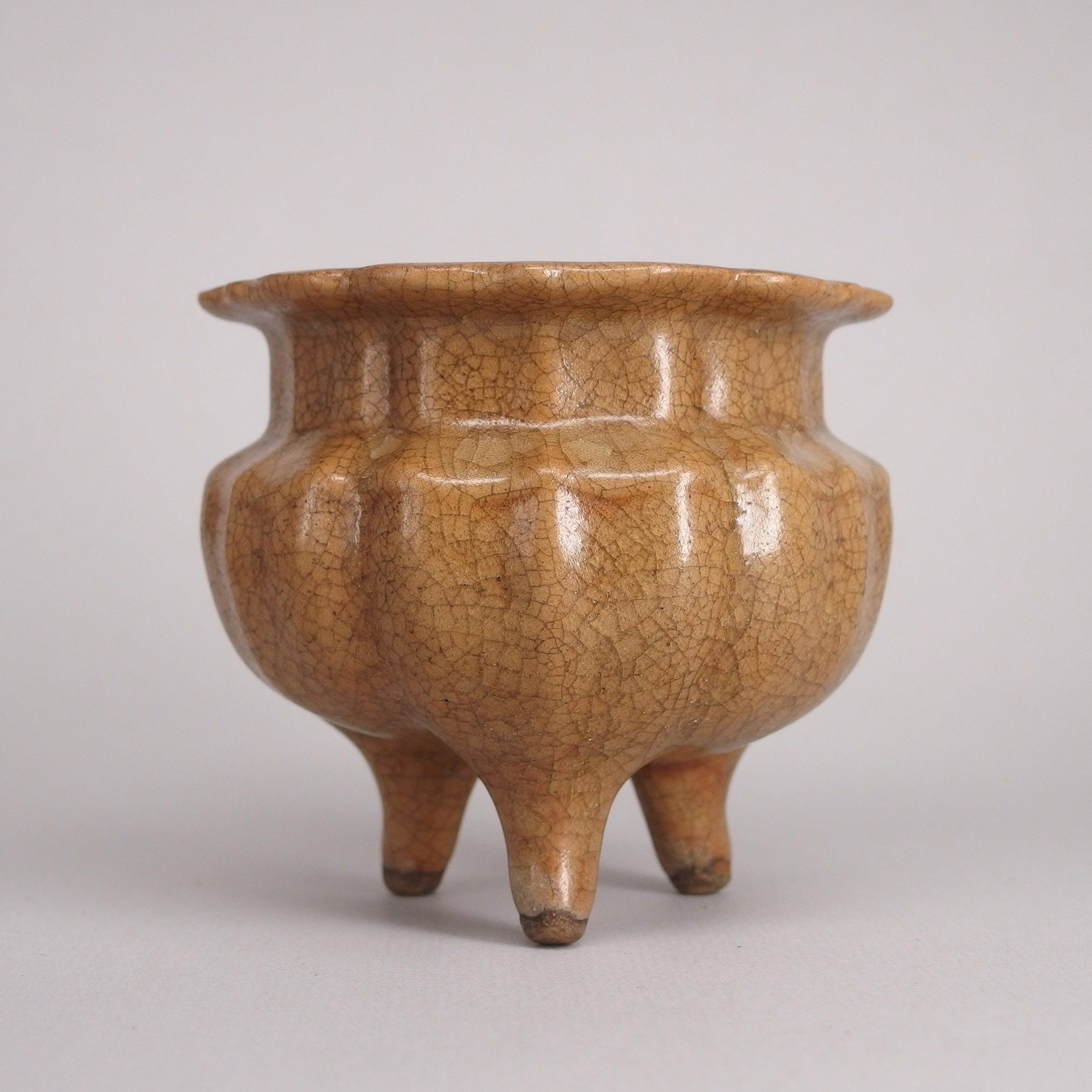 長12.1cm 寬11.6cm  高7.8cm  宋 哥窯百圾碎支釘燒弦紋三足爐此件爐形小巧精緻,三足穩健有力,通體施米黃釉,滿佈細密百圾碎開片,釉色溫潤如玉,冰裂紋間滲出金斯鐵線,通體有死亡氣泡留下的圓洞,呈現歲月古樸之美。支釘燒痕可見於底部,為宋代哥窯器特有燒造工藝,顯示其以精準支撐方式避免釉黏。 哥窯以「紋片為貴」著稱,開片層次繁複,如冰裂玉肌,散發古樸靜謐之韻。此三足爐或為文人書案香具,承載宋人清雅審美與對天工之敬意,煙氣繚繞間,似將人心引入無塵之境。