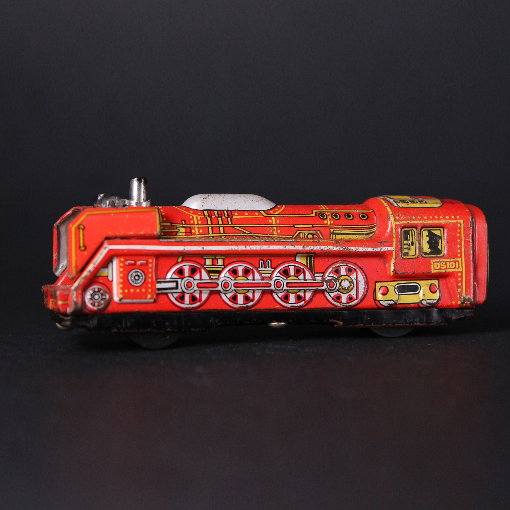 長10CM 寬2.5CM 高3CM 這是一個 民國時期 (約20世紀中期)由 日本製造 的 鐵皮玩具火車頭 。玩具材質為薄鐵皮,採用模具衝壓成型後,再進行彩印和組裝。此火車頭外觀呈現鮮豔的 紅色 為主色調,表面印有黃白線條勾勒的機械細節和車輪圖案,風格簡潔而充滿動感。玩具屬於 發條或慣性類型 的設計,通常底部配有車輪和簡單的動力裝置(圖片中為靜態展示)。火車頭側面標有「D5101」的字樣,可能參考了當時日本國鐵的D51型蒸汽機車系列,是該時期流行的玩具類型。 鐵皮玩具是20世紀中期風靡全球的兒童玩具,具有鮮明的時代特色和收藏價值。在民國時期乃至戰後初期,日本製造的鐵皮玩具因其工藝精良且價格適中,大量出口至亞洲乃至世界各地。這件火車頭體現了當時玩具設計的工業美學,它不僅是兒童玩樂的工具,更代表了該時期亞洲輕工業和製造業的發展水平。如今,這類保存完好的鐵皮玩具已成為懷舊收藏品,見證了特定歷史時期的生活文化與工業設計風貌。