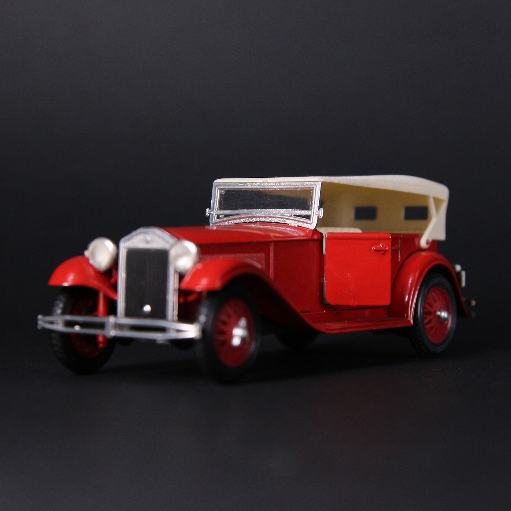 長11.8CM 寬5CM 高4CM 這是一件仿製早期經典車型的老爺車模型,推測製造於民國時期,即20世紀中期前後,產地為義大利。模型整體採用亮麗的紅色塗裝,搭配米白色的軟頂篷,呈現出復古且醒目的外觀。它屬於壓鑄(Die-cast)合金或類似金屬/塑料混合材質製成,精細地再現了老爺車的諸多細節,包括獨立的擋泥板、經典的矩形水箱護罩、圓形頭燈以及可開合的車門等。這類模型強調對真實車輛的縮小與還原,具有較高的仿真度,是當時廣受歡迎的收藏級玩具或裝飾品。 這款老爺車模型作為 義大利製造 的產品,體現了歐洲模型玩具工業的設計美學和製造水準。在民國時期,特別是戰後,這類進口模型成為了高階玩具和收藏品,代表著西方文化和工業技術的傳播。 附帶原裝盒子 (雖然圖片未顯示,但這是關鍵資訊)極大地提升了模型的完整性和收藏價值,因為原盒能提供製造商、型號、比例等重要資訊,並有助於保存。這件模型不僅是汽車歷史的縮影,也是研究20世紀中期玩具文化和跨國貿易的珍貴實物。