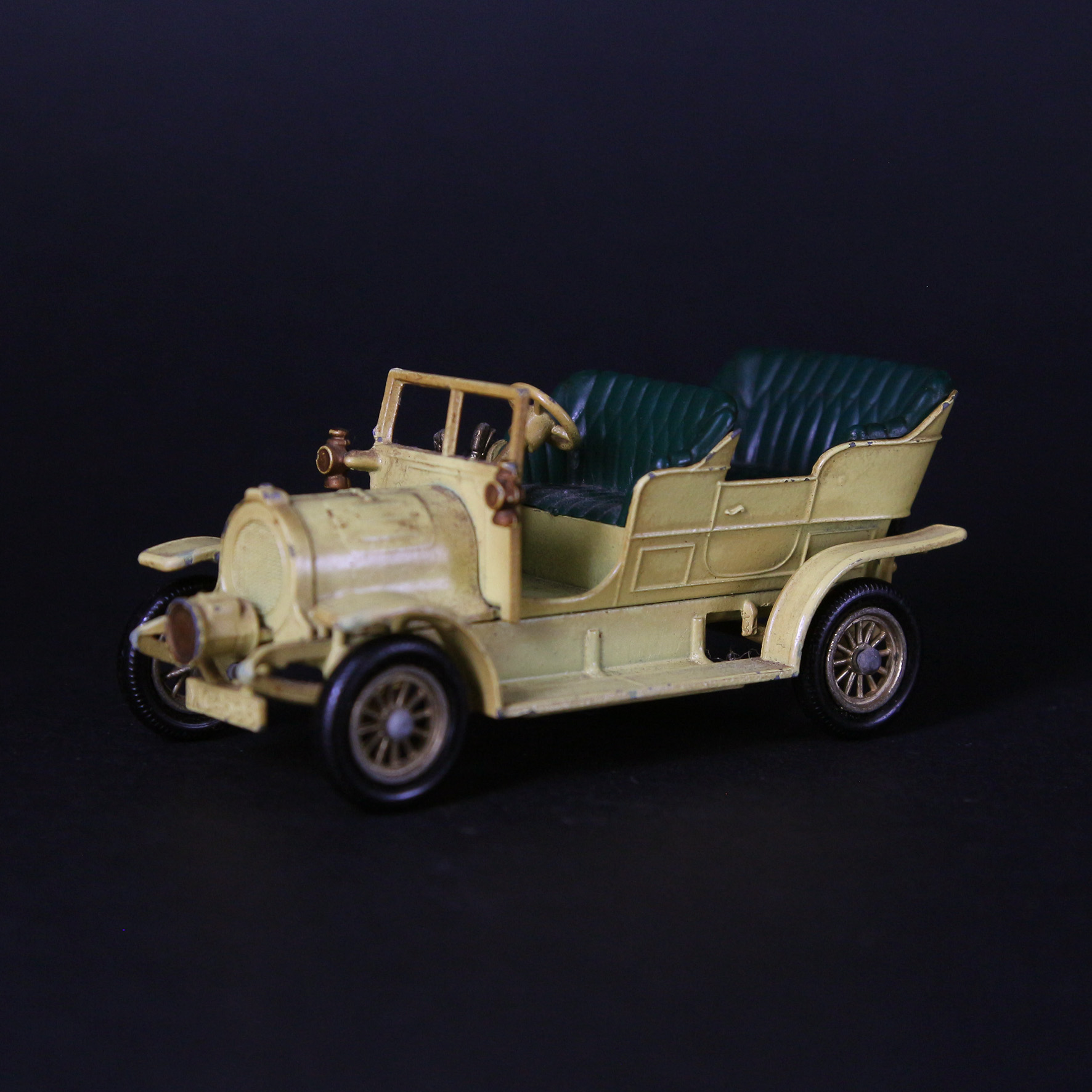 長8.5CM 寬3.7CM 高3.7CM 這是一件仿製 早期汽車 (可能為1900年代初期款式)的 敞篷車模型 ,推測製造於 民國時期 (約20世紀中期前後),產地為 英國 。模型主體呈現稀有的 淡黃色 (或稱奶油黃),搭配深綠色的模擬皮質座椅,顏色對比鮮明,富有古典氣息。該模型通常為壓鑄金屬(Die-cast)或合金材質,細節處理精緻,包括外露的頭燈、簡潔的擋風玻璃、以及車輪上精細的鋼絲輪轂(或模擬圖案)。車頭下方可見一個微小的車牌號碼「 WCA 598 」,進一步增強了其仿真度和收藏趣味。 在20世紀中期,英國是全球重要的壓鑄模型玩具製造中心,其中尤以Matchbox、Dinky Toys等品牌聞名。這類老爺車模型是當時模型收藏的熱門主題,它將工業革命早期的交通工具以精巧的比例重現,深受收藏家喜愛。這款黃色敞篷車模型在當時作為進口商品進入中國市場,不僅代表了英國製造業的工藝水平,也反映了民國時期上層社會對西方休閒文化和模型的興趣。作為一件保存至今的老舊模型,它具有重要的懷舊價值和歷史意義,是研究特定時期玩具設計與國際貿易的實物例證。