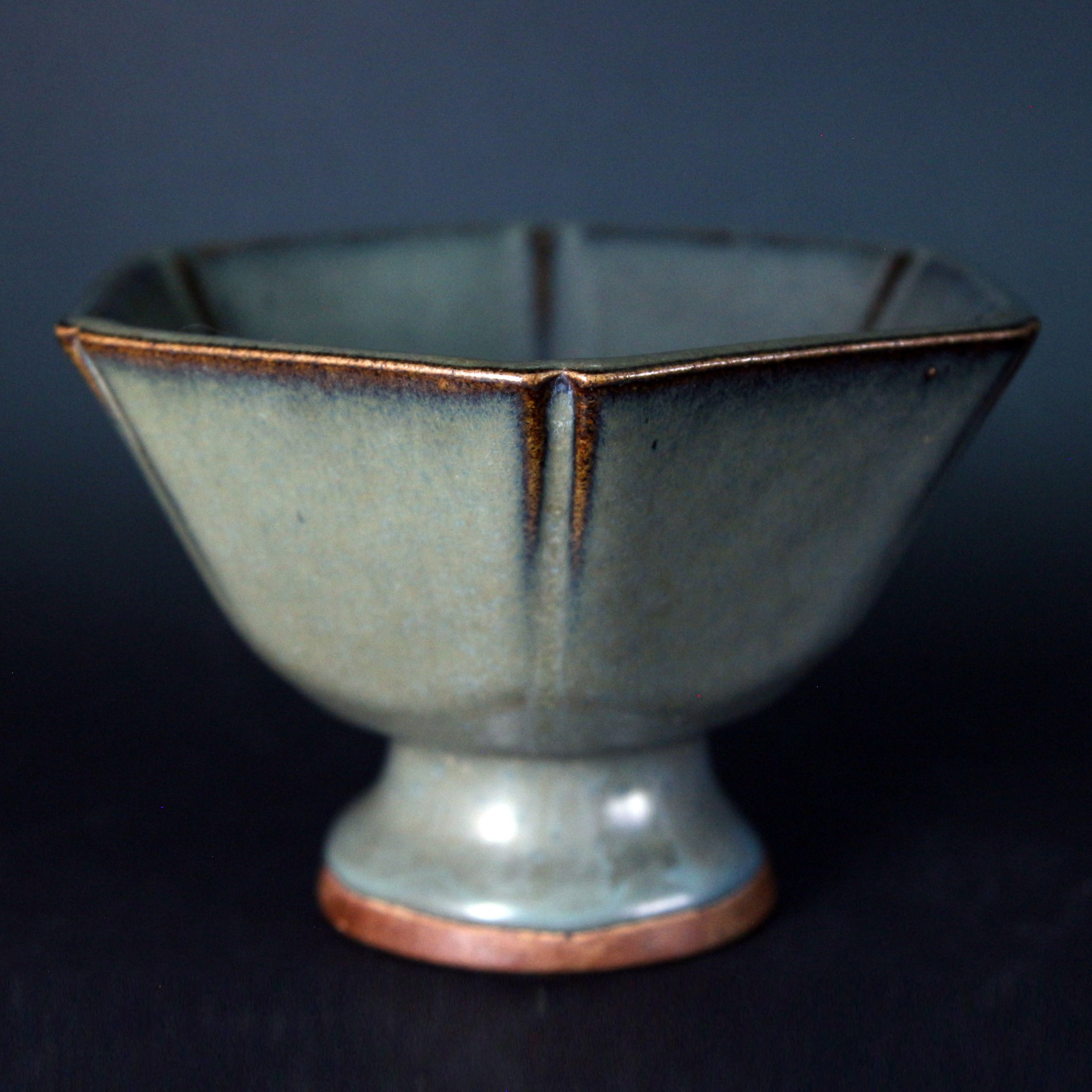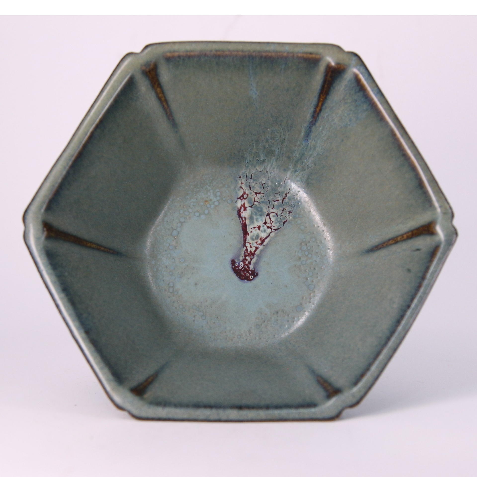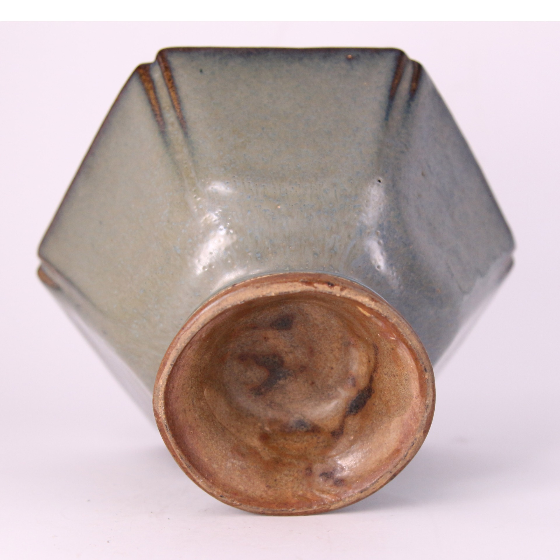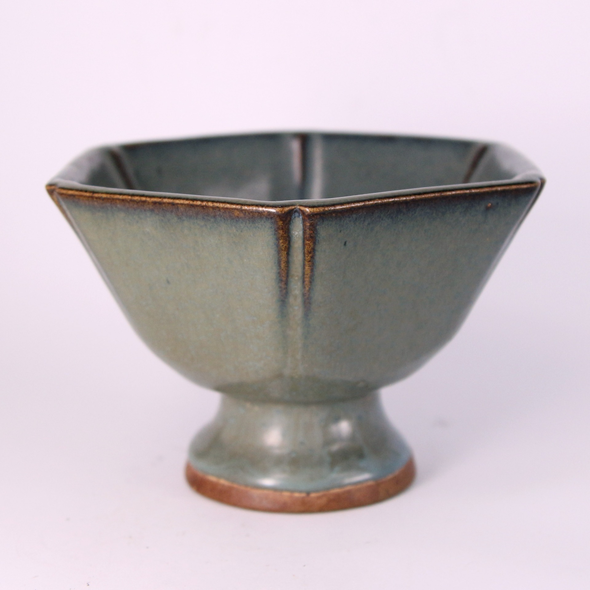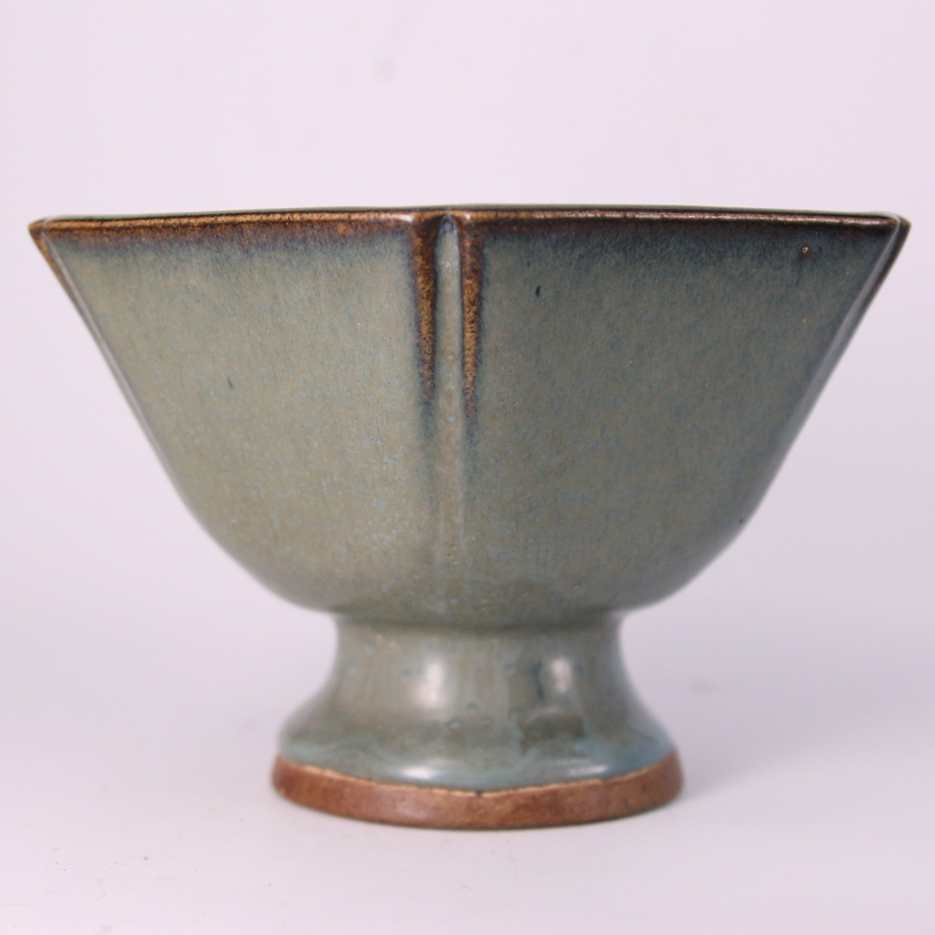 此件鈞窯六方倭口洗,器形端正穩重,口沿作倭口外撇,六方折面起棱分明,線條俐落中帶圓潤。通體施鈞釉,釉色呈天青帶灰藍調,積釉處色澤轉濃,口沿泛現自然火痕,呈現鈞窯高溫窯變所特有的流動感與深淺層次。整體釉面溫潤內斂,於靜謐中蘊含變化之美。