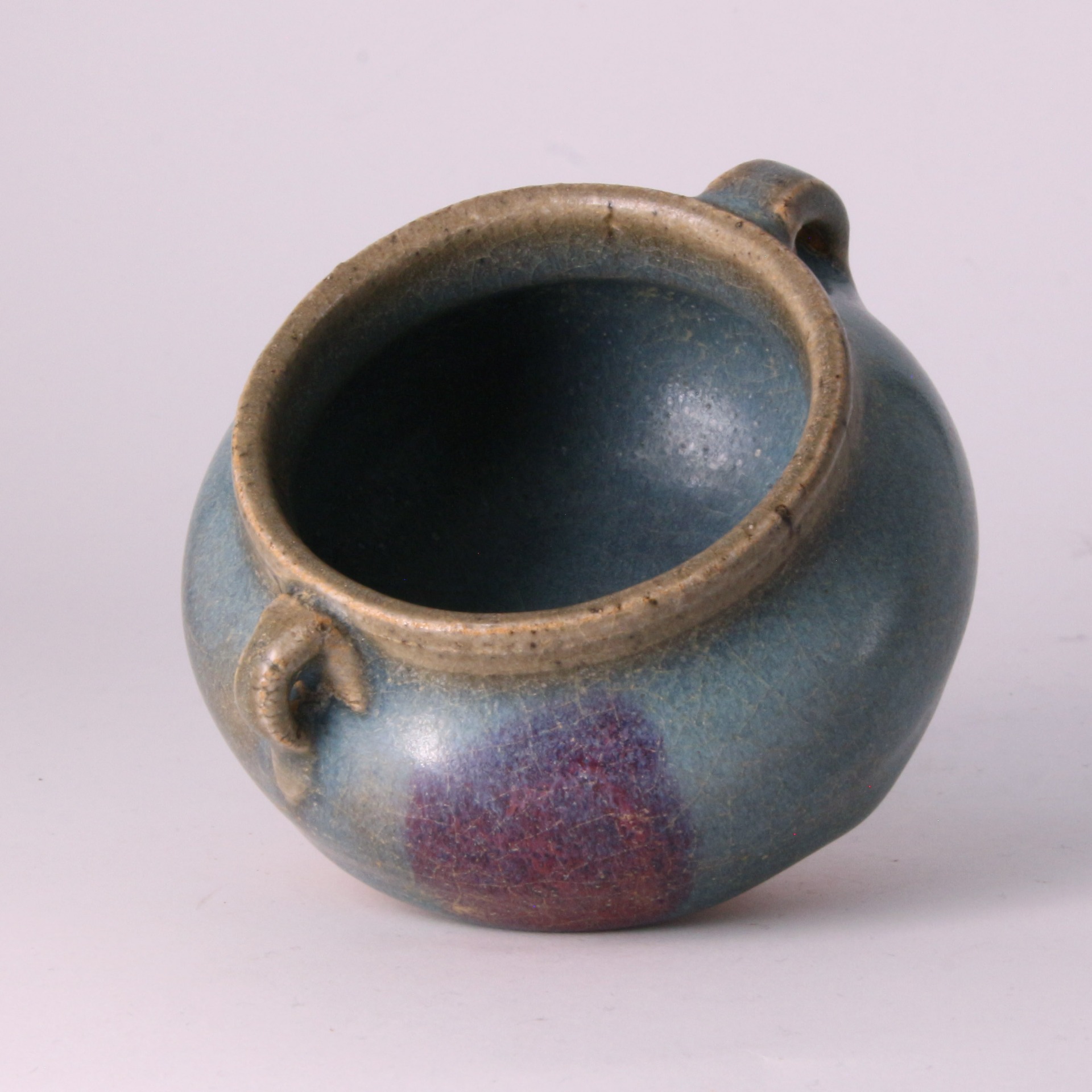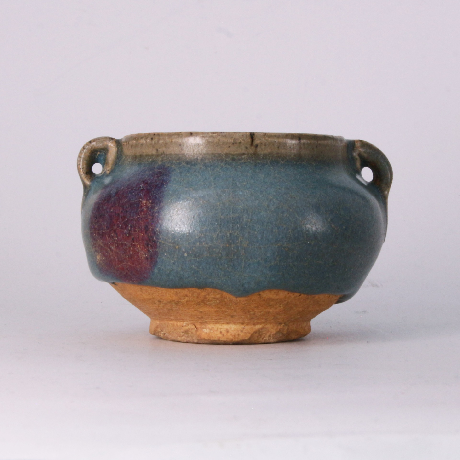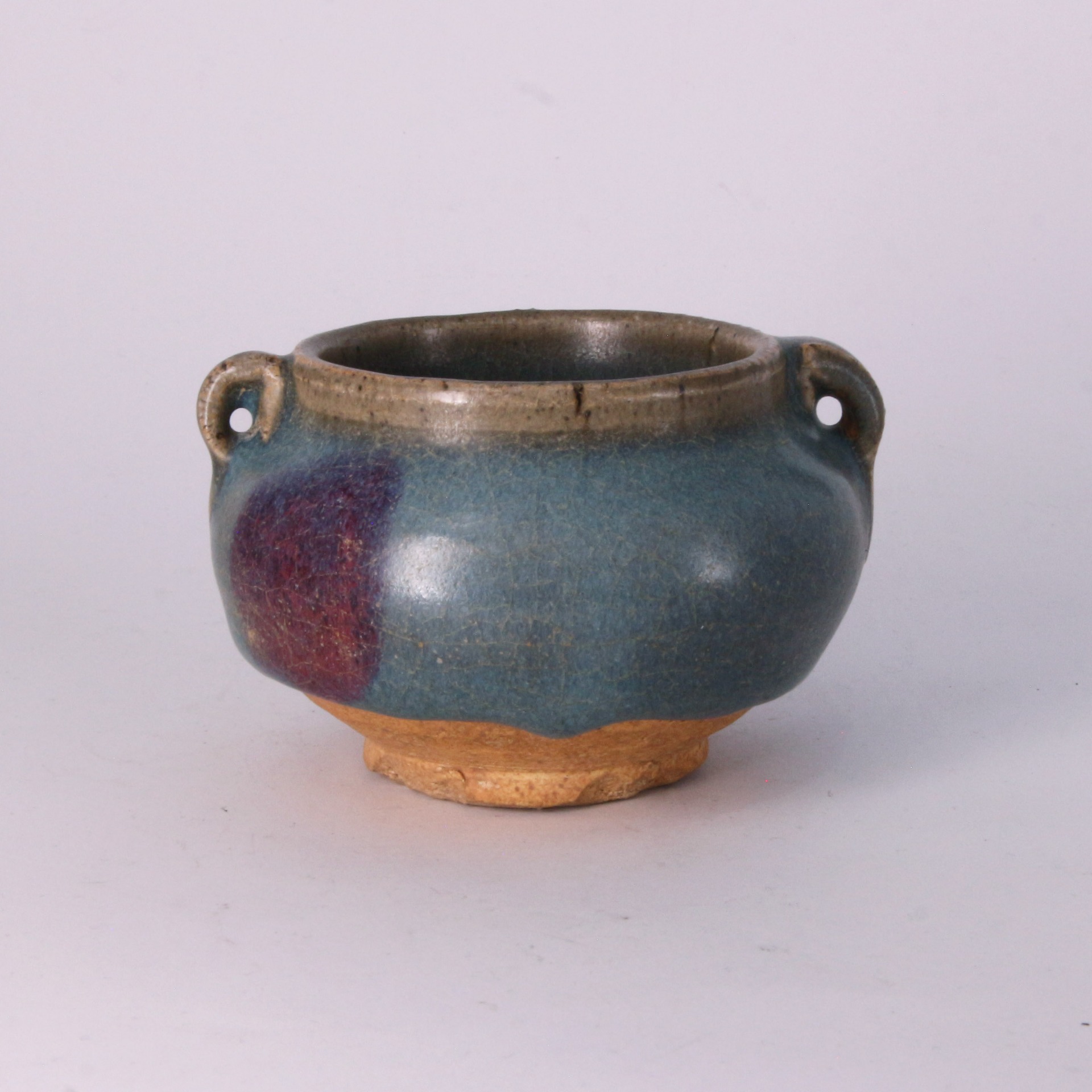 香爐造型飽滿端莊,口沿微撇,肩部兩側對稱飾以圓繫(雙耳),腹部下垂,展現了元代器物敦厚樸實的時代特徵。底部露胎處可見胎土較粗、色呈土黃,反映出元代鈞窯轉向民間實用器發展的趨勢。這種雙耳爐不僅是當時祭祀或文房焚香的實用品,更是元代陶瓷藝術追求自然色彩變化與造型張力的實物見證。