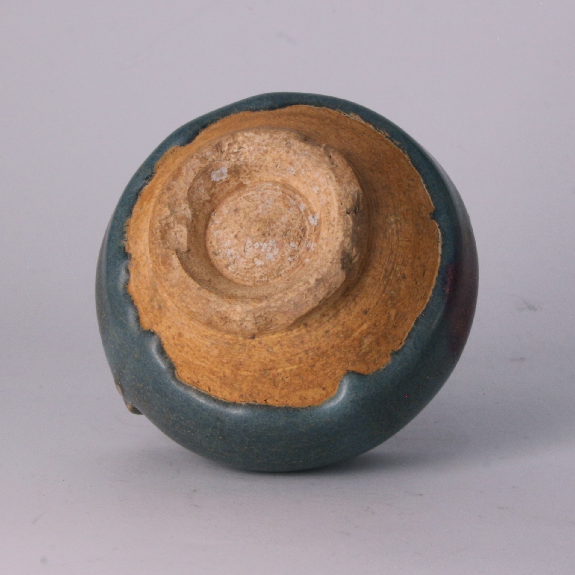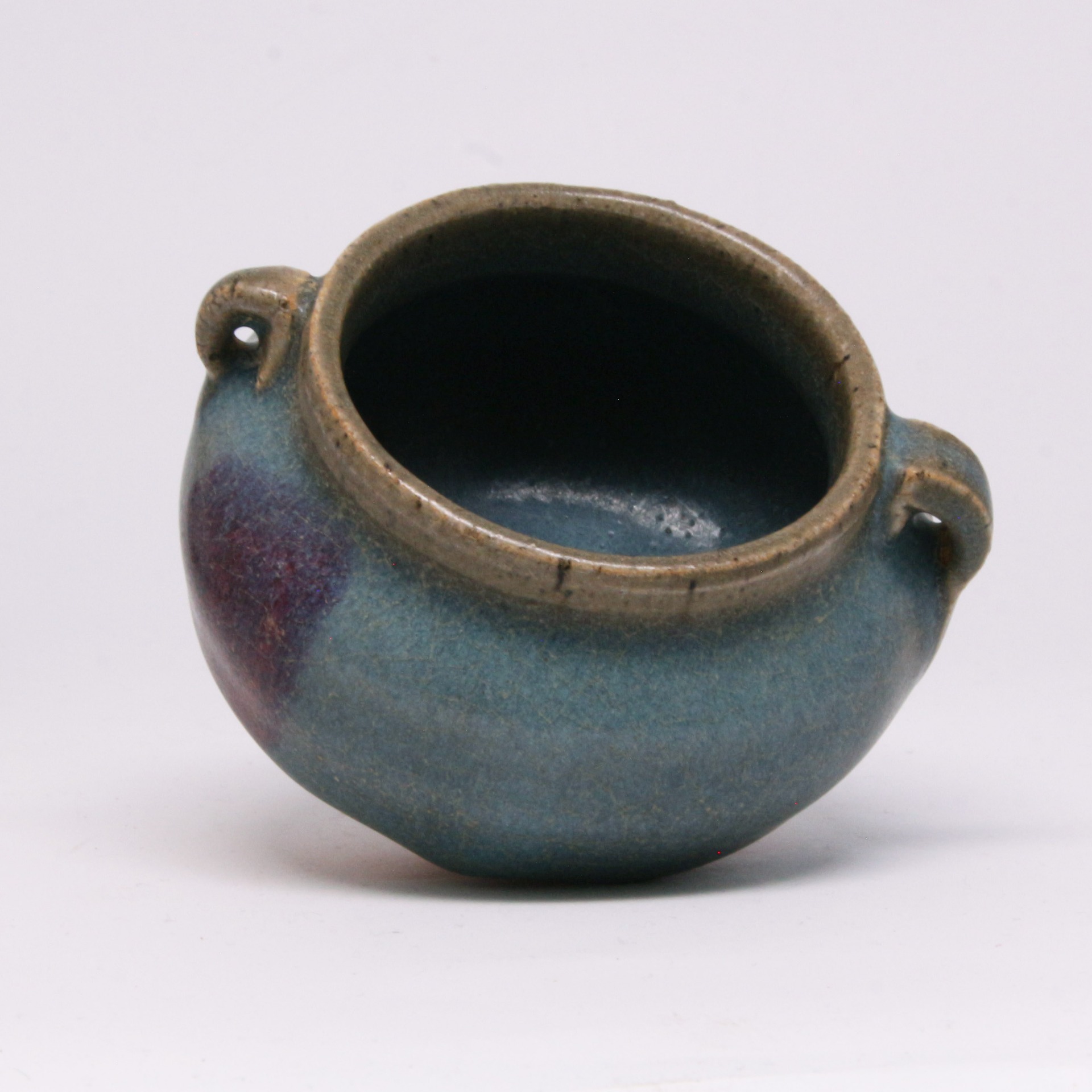 此爐展現了鈞窯最具代表性的「窯變」工藝,在沉穩的月白或天藍色釉面上,點綴著一抹如晚霞般的紫色紅斑。這種裝飾是工匠在釉中施以銅元素,經由高溫還原氣氛燒製而成,打破了青瓷系單一色彩的寂靜,呈現出「夕陽紫翠忽成嵐」的靈動感。釉質厚潤,表面分佈有自然開片與棕眼,具有典型的鈞瓷質感。