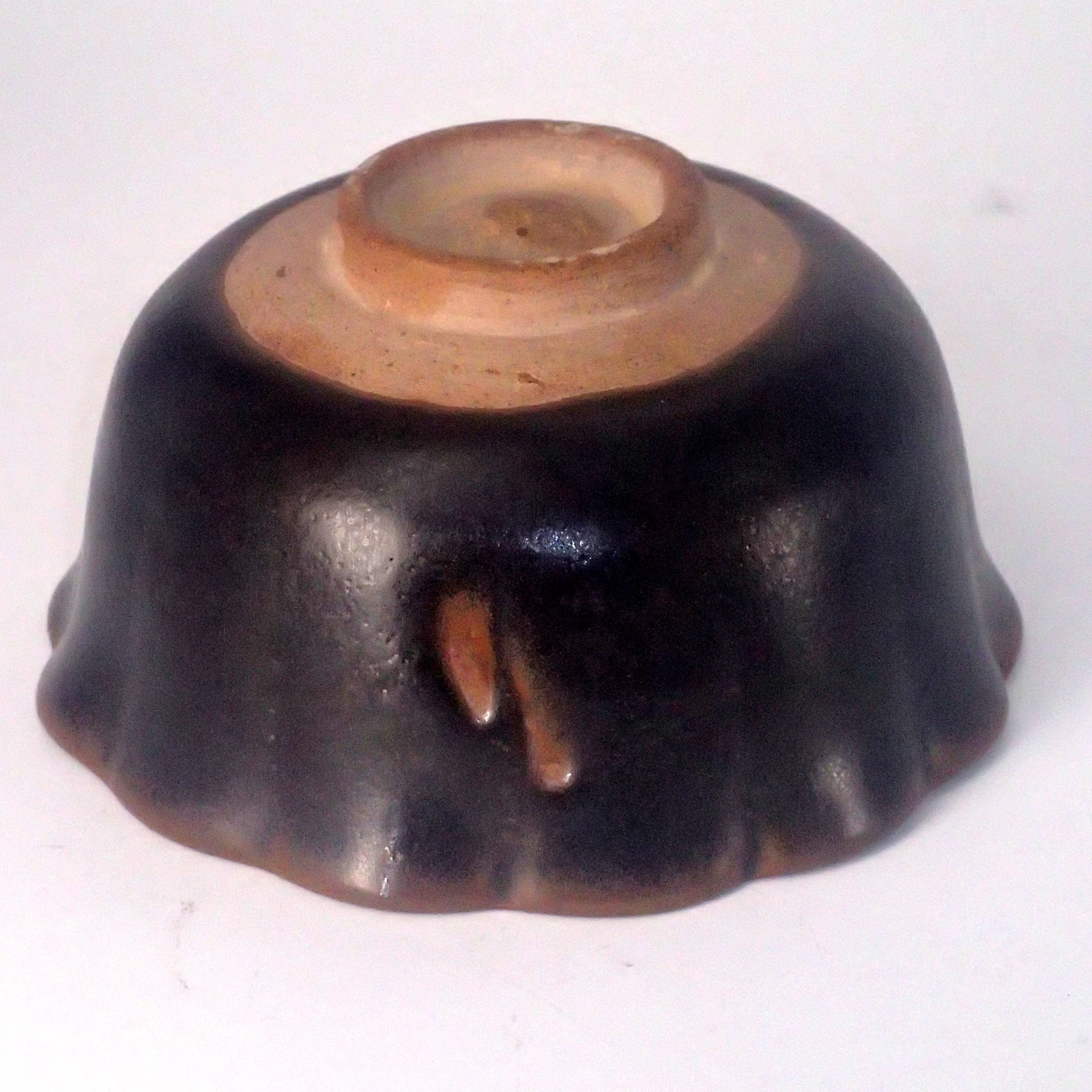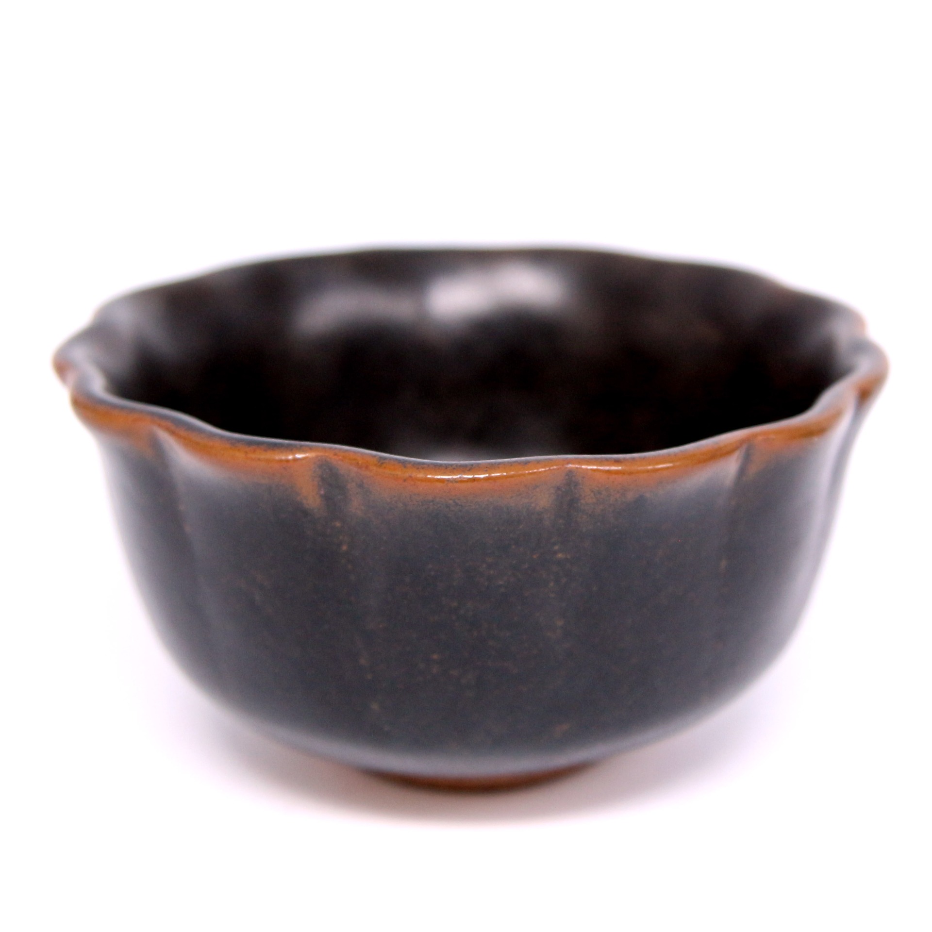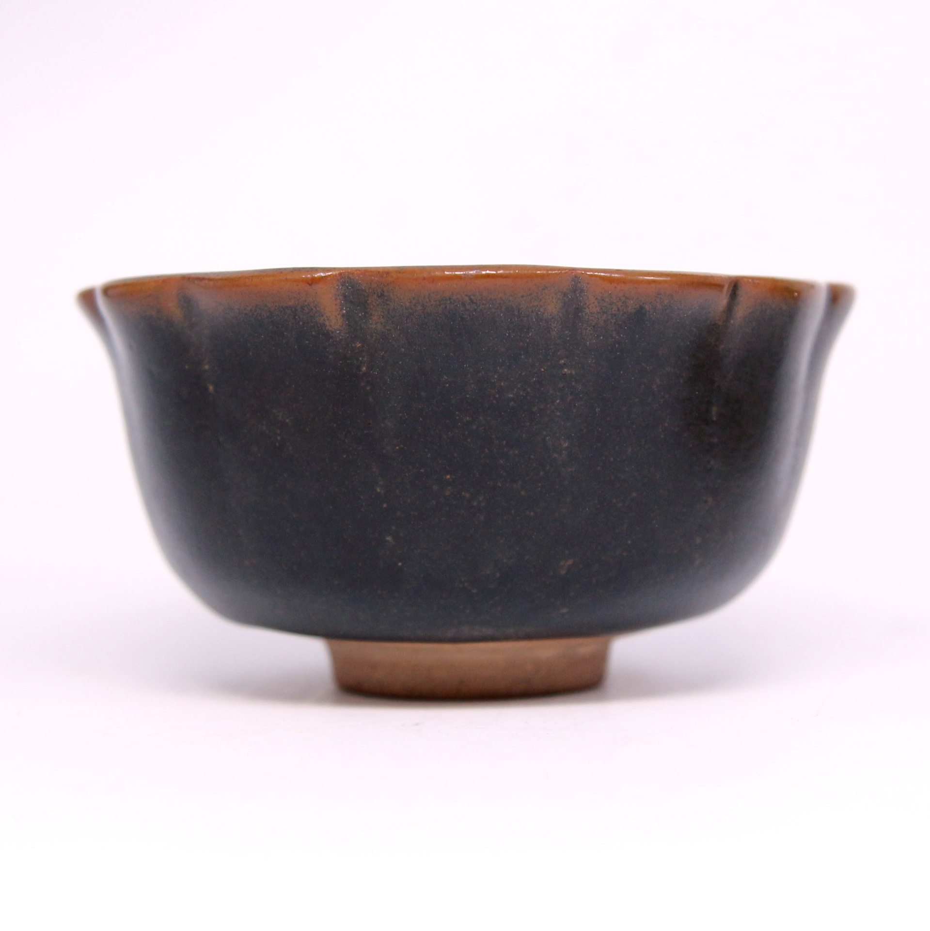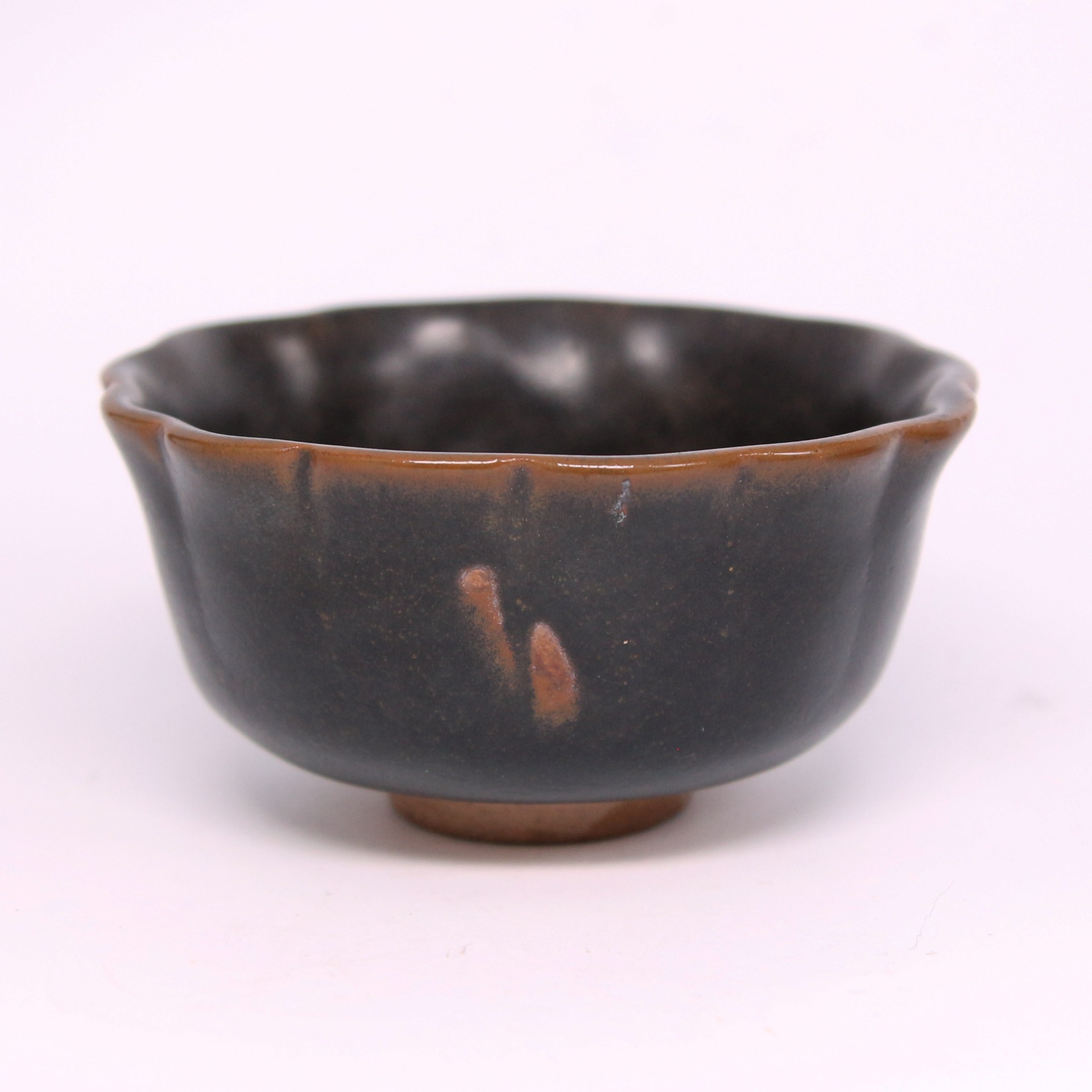 此盞造型優雅,口沿處採花口(菱口)設計,將圓潤的口部自然均分為數瓣,宛如一朵盛開的花朵。這種設計打破了常規圓盞的單調,為沈穩的黑瓷增添了靈動的曲線感。盞身隨花口向下延伸出淡淡的筋脈,腹部弧度飽滿,便於持握,體現了元代器物在實用基礎上對裝飾細節的追求,極具裝飾藝術價值。