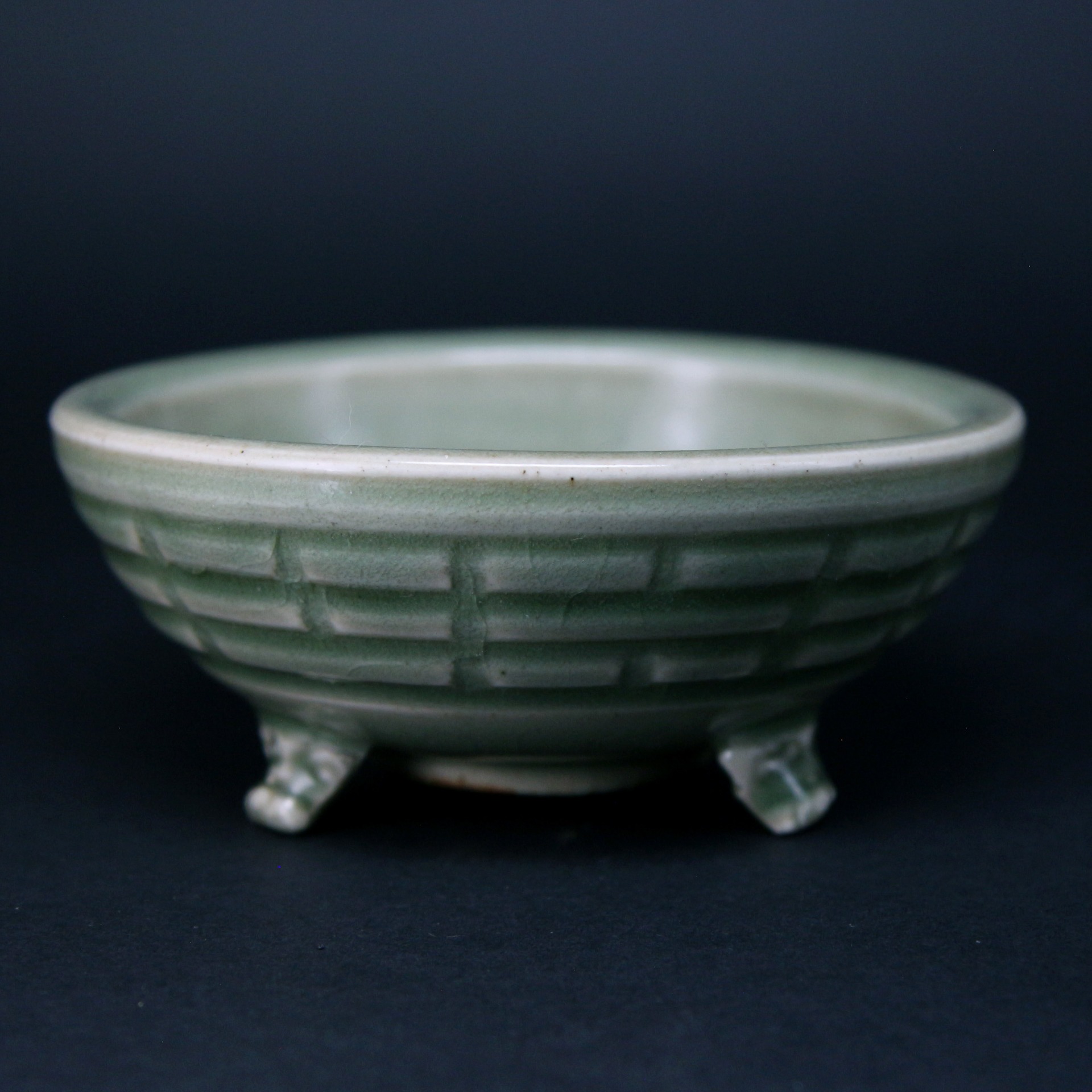 此爐為元代龍泉窯青瓷香爐,敞口、鼓腹,下承三獸足,器形穩重而不失秀雅。外壁以刻劃八卦紋為主飾,線條簡練有力,寓含天地陰陽、宇宙秩序之象徵。通體施青釉,釉色溫潤如玉,色澤介於青綠與粉青之間,釉面細膩柔和,展現元代龍泉窯成熟穩定的燒造水準與審美風格。