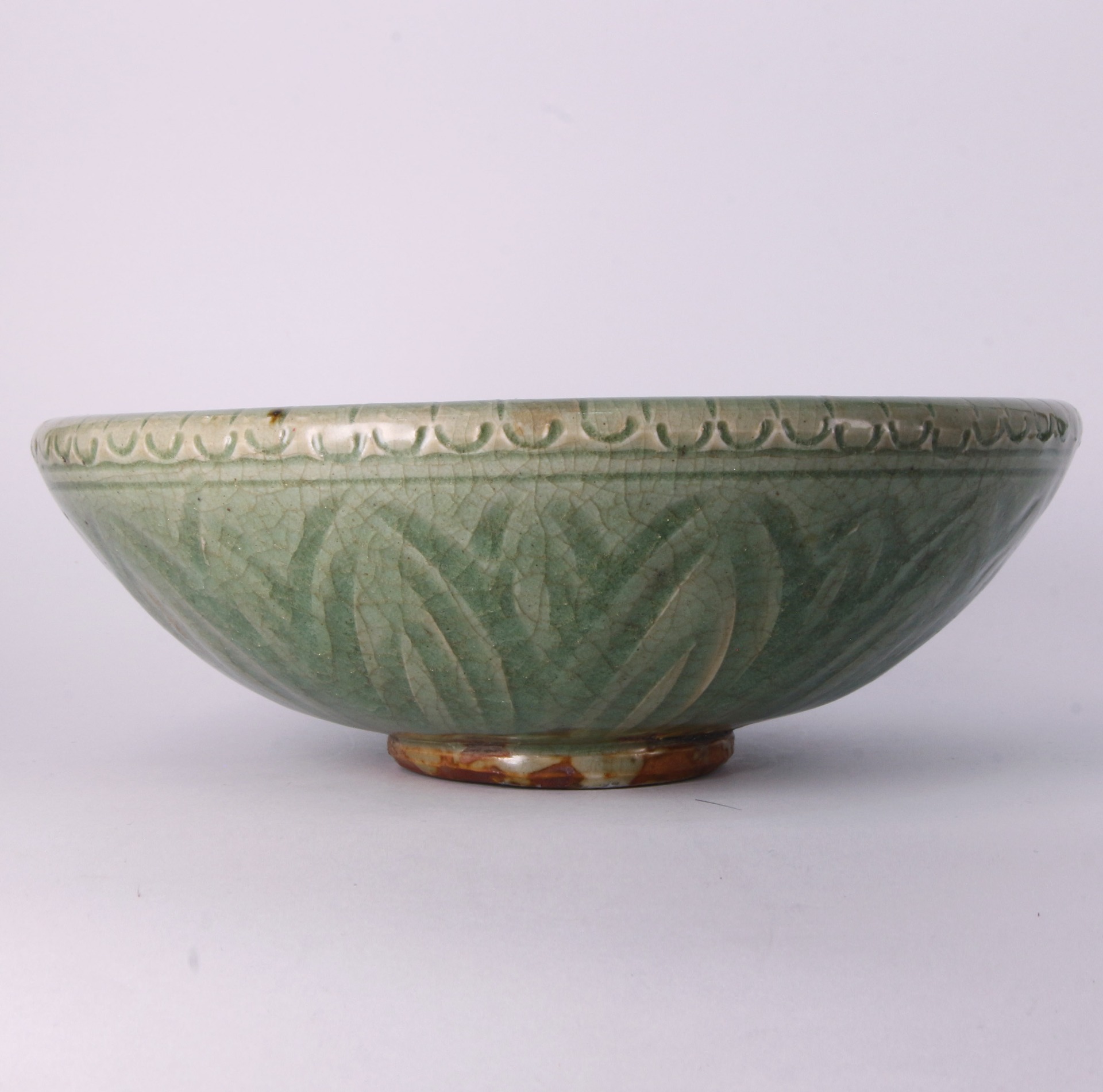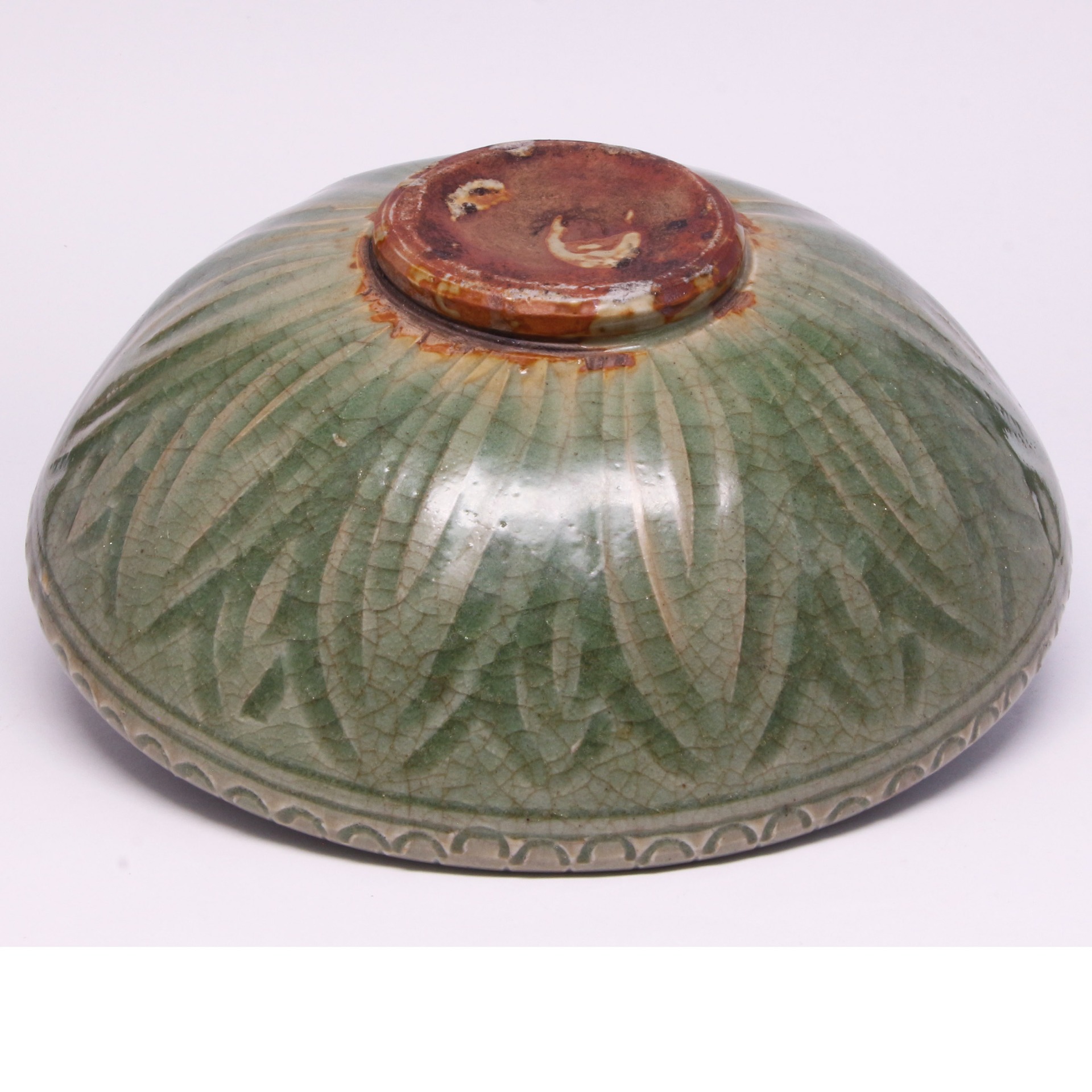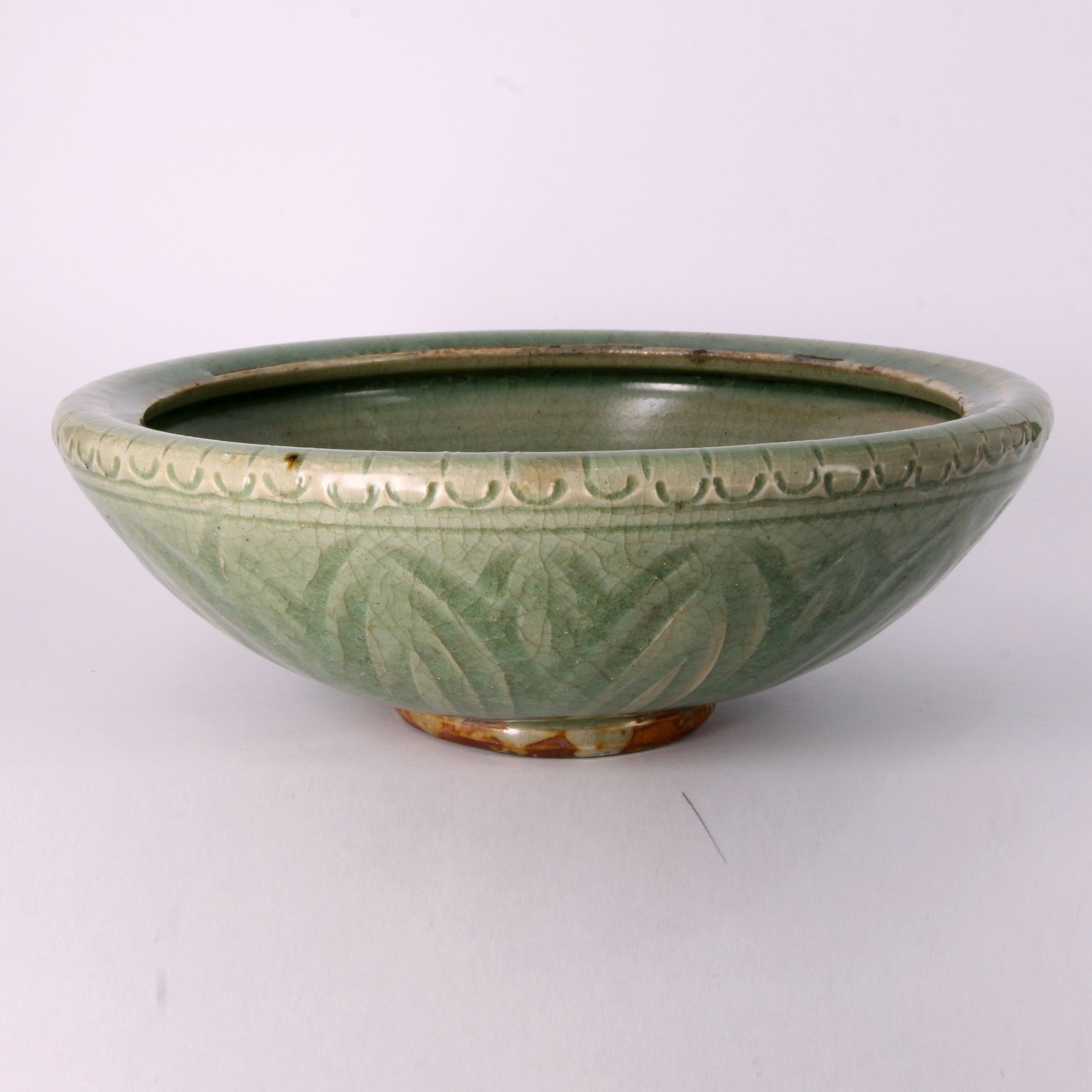 在傳統瓷器裝飾中,以蓮瓣與童子為題材,寓意「連生貴子」與純真吉祥,是元代文人雅士與市井階層皆喜愛的祥瑞圖飾。此件洗具雖為日用器皿,卻因精緻的工藝而具備了極高的審美價值,既可作為文房用具承載水墨之趣,亦可作陳設擺件營造空間的古樸氣韻。器底露胎處呈現自然的火石紅痕,記錄了悠久的燒造歷史與傳承軌跡。其保存狀態完好,紋飾清晰,不僅是研究元代龍泉窯裝飾風格的重要實物,更是一件寄託美好生活嚮往的案頭佳作。