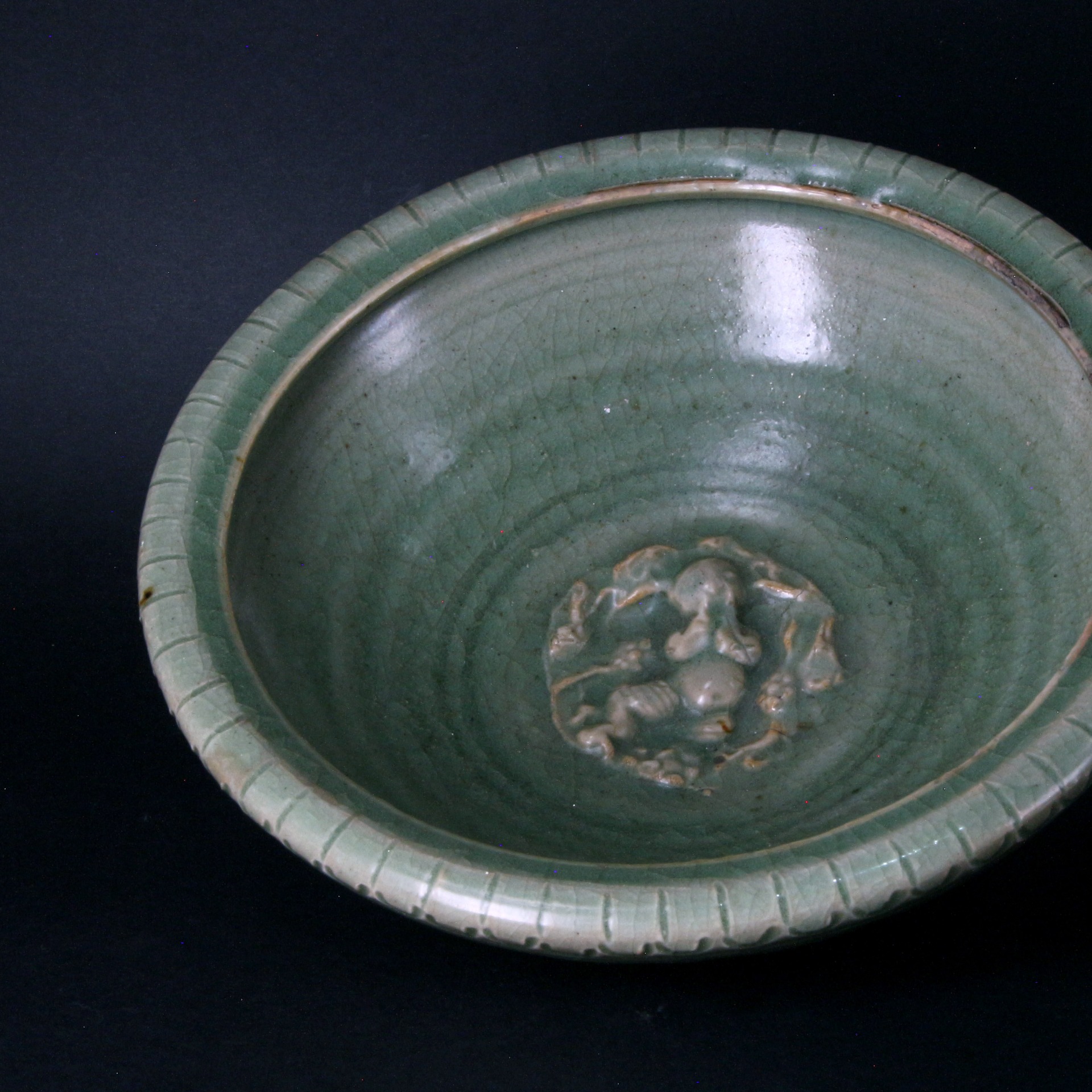此器洗盤式設計,內壁模印童子戲水紋飾,人物造型生動,神態細膩,賦予靜物以靈動的生命力;外壁則規整地刻劃蓮瓣紋,層次分明,線條挺拔流暢,展現了元代龍泉窯匠人嫻熟的雕琢技法。器身罩施厚釉,釉色蔥翠欲滴,呈現出元代青瓷特有的肥厚與玉質感。盤沿口緣修飾簡練,與盤心的貼花裝飾形成疏密對比,整體呈現出渾厚大氣又不失細膩雅緻的藝術張力,盡顯龍泉青瓷「如冰似玉」的工藝精髓。