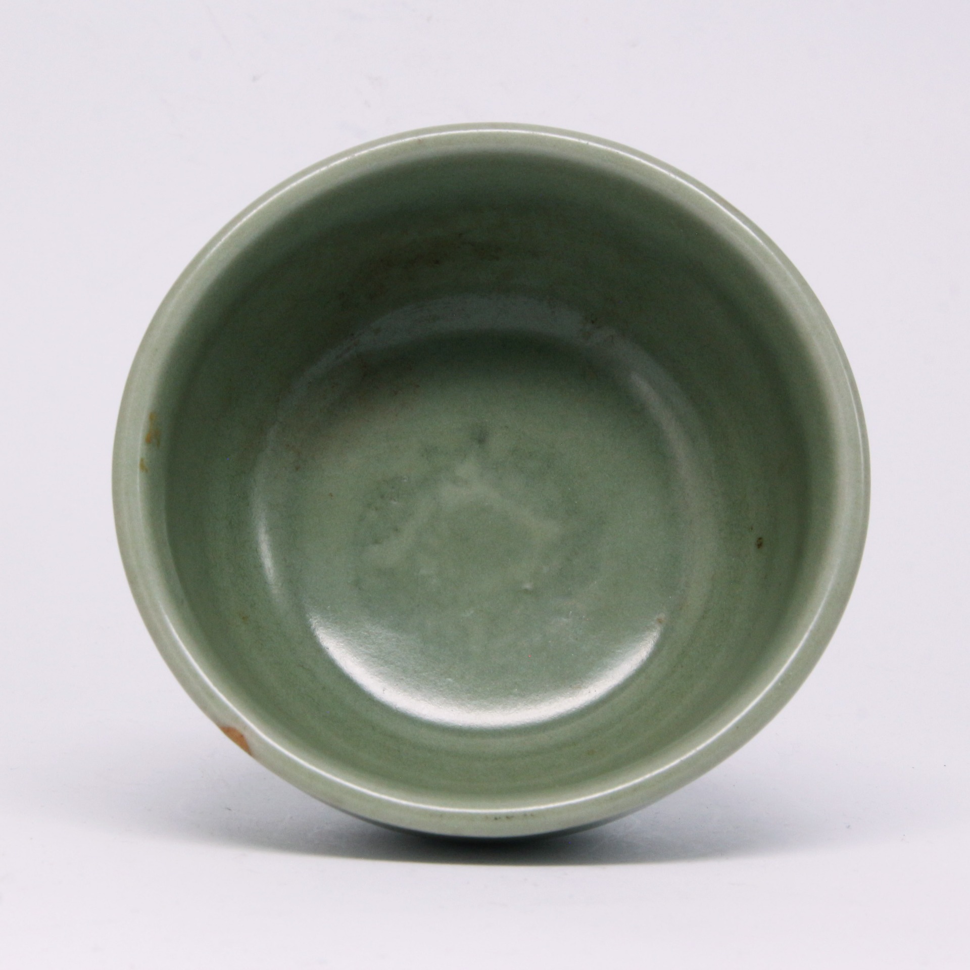 杯體內部採用印花裝飾,這是在胎體未乾前以模具壓印出花紋,常見紋飾如雲鶴、牡丹或吉祥文字。觀察底足,可見胎土與釉面交界處因含鐵量較高而呈現自然的**「火石紅」**(又稱硃砂底),這是鑑定元代龍泉窯真偽與斷代的核心特徵之一,具有極高的收藏與考古研究價值。