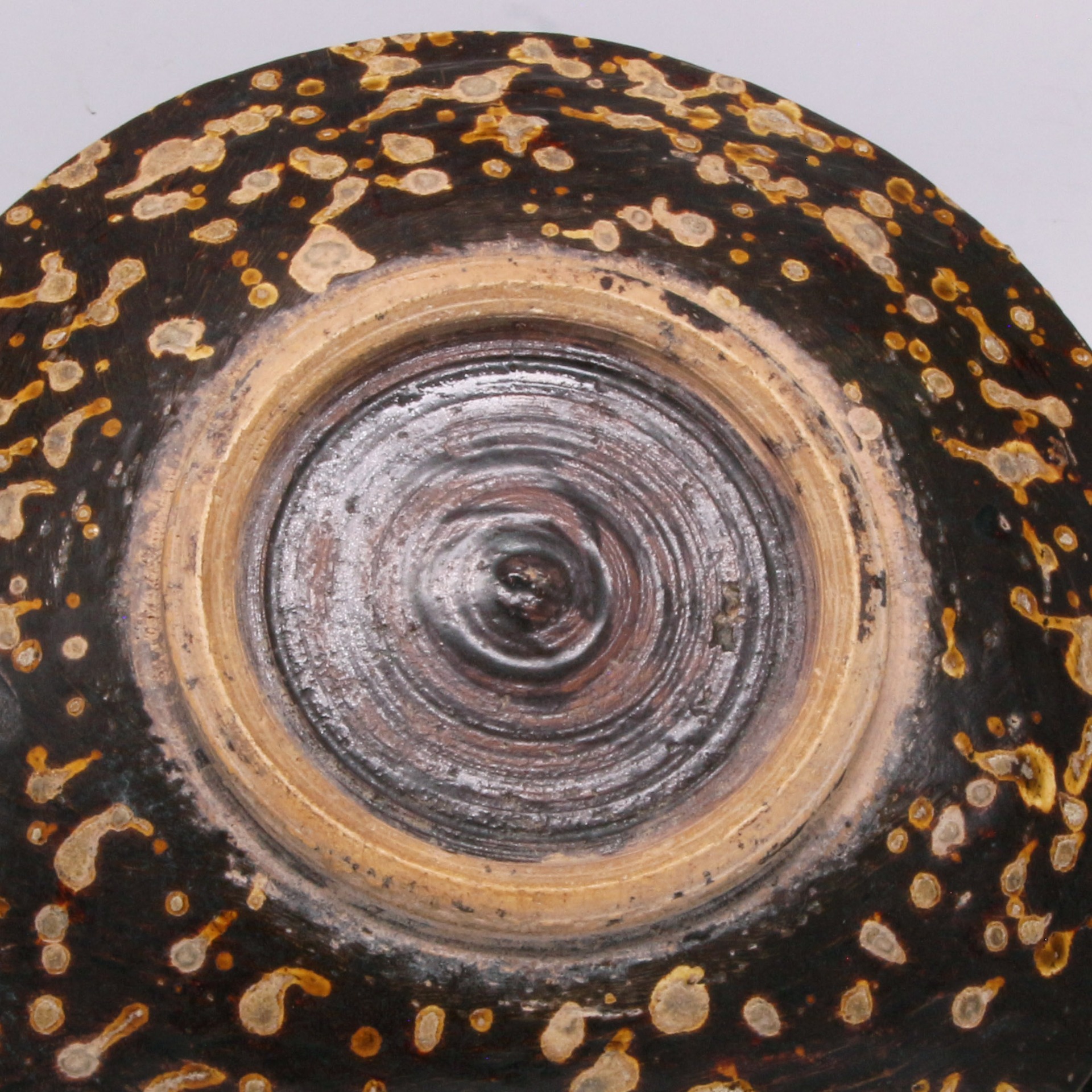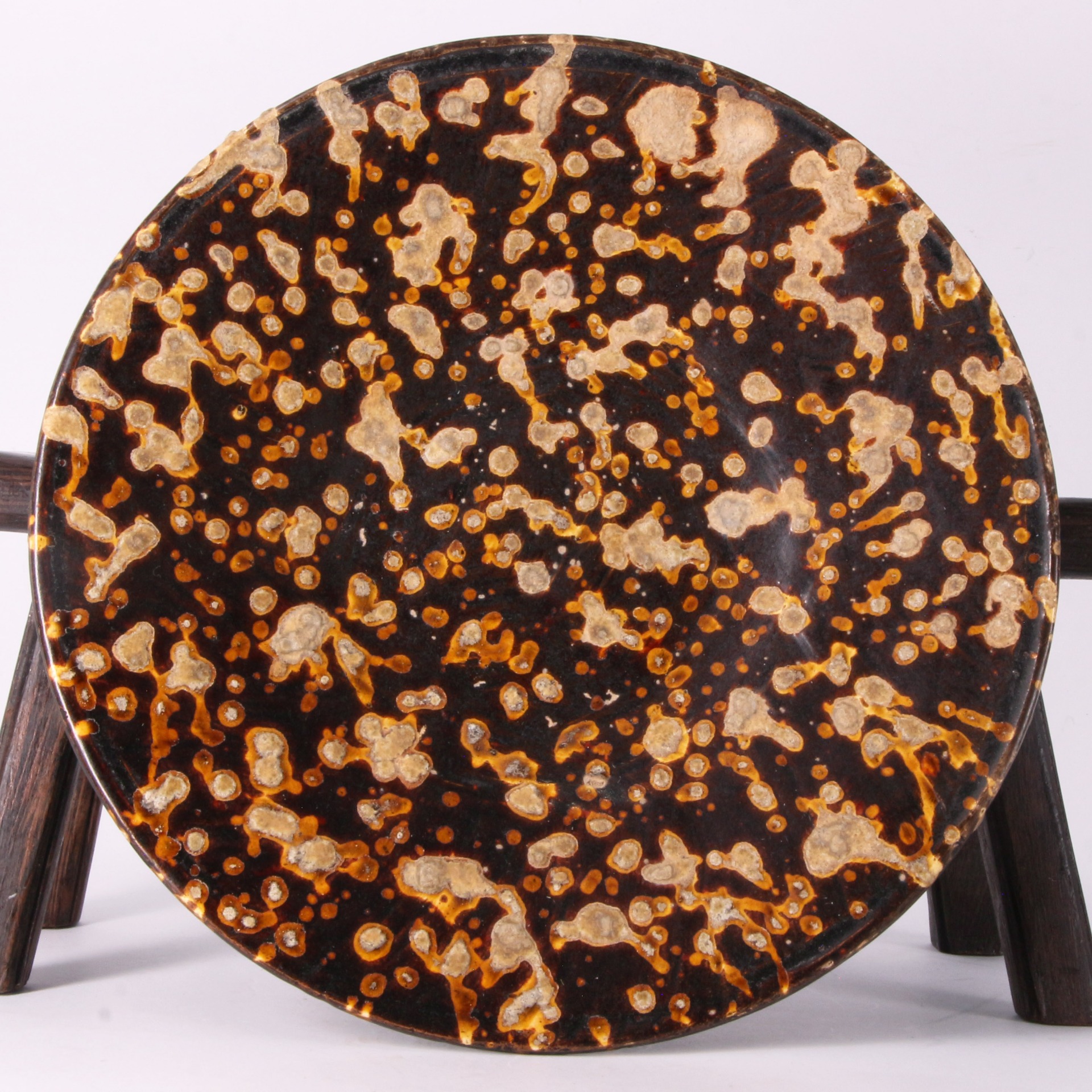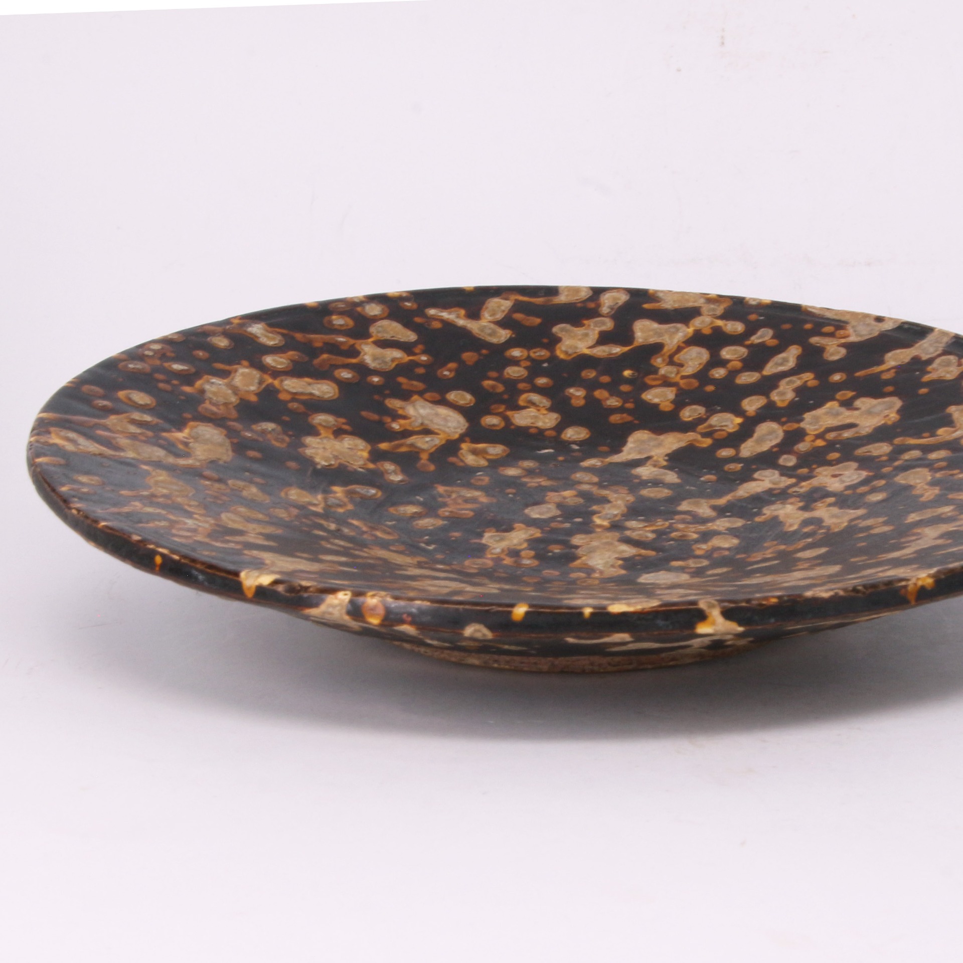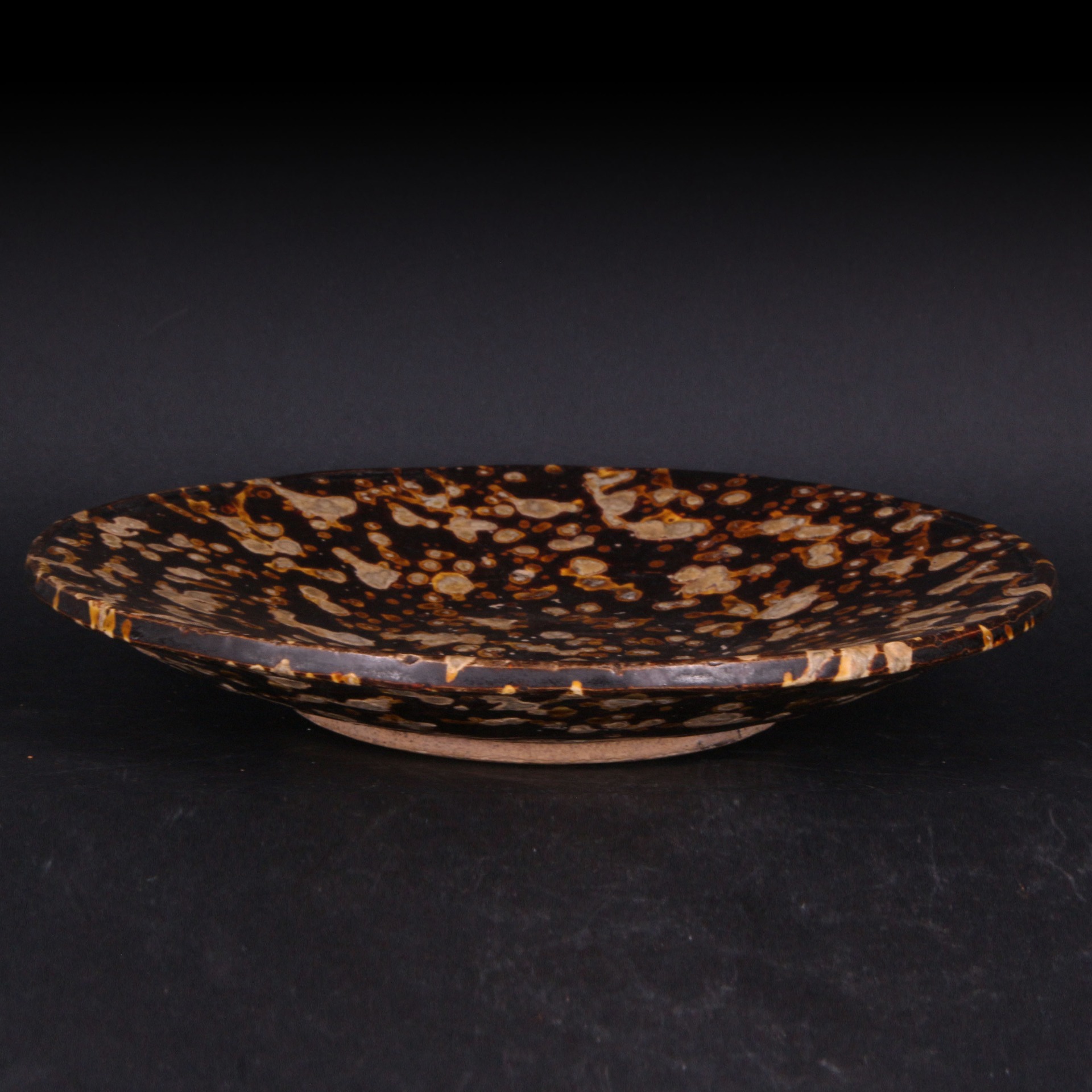 吉州窯位於江西吉安,是宋代著名的民間窯場,其玳瑁釉(玳瑁斑)是該窯最具代表性的品種之一。這種裝飾技法是先施以富含鐵質的底釉,再在表面點灑含錳、鐵、矽等多種金屬元素的淺色釉料,燒成時釉液自然流動與暈散,使每一件作品都呈現出獨一無二的天然紋理。此盤不僅展現了宋代工匠卓越的窯火控制技術,更是文人雅士茶席與齋房中不可或缺的雅致器物,具備極高的工藝價值與收藏意義。