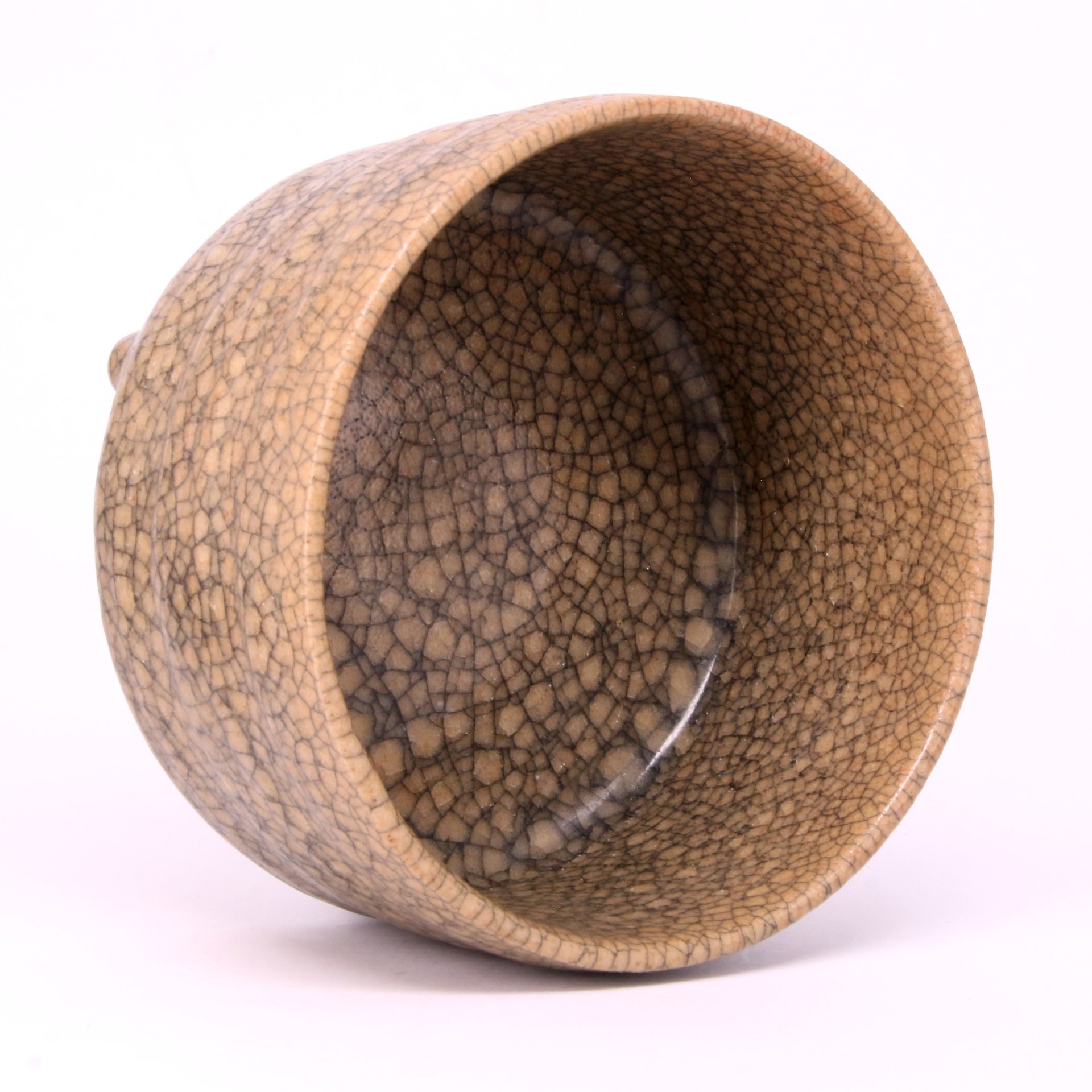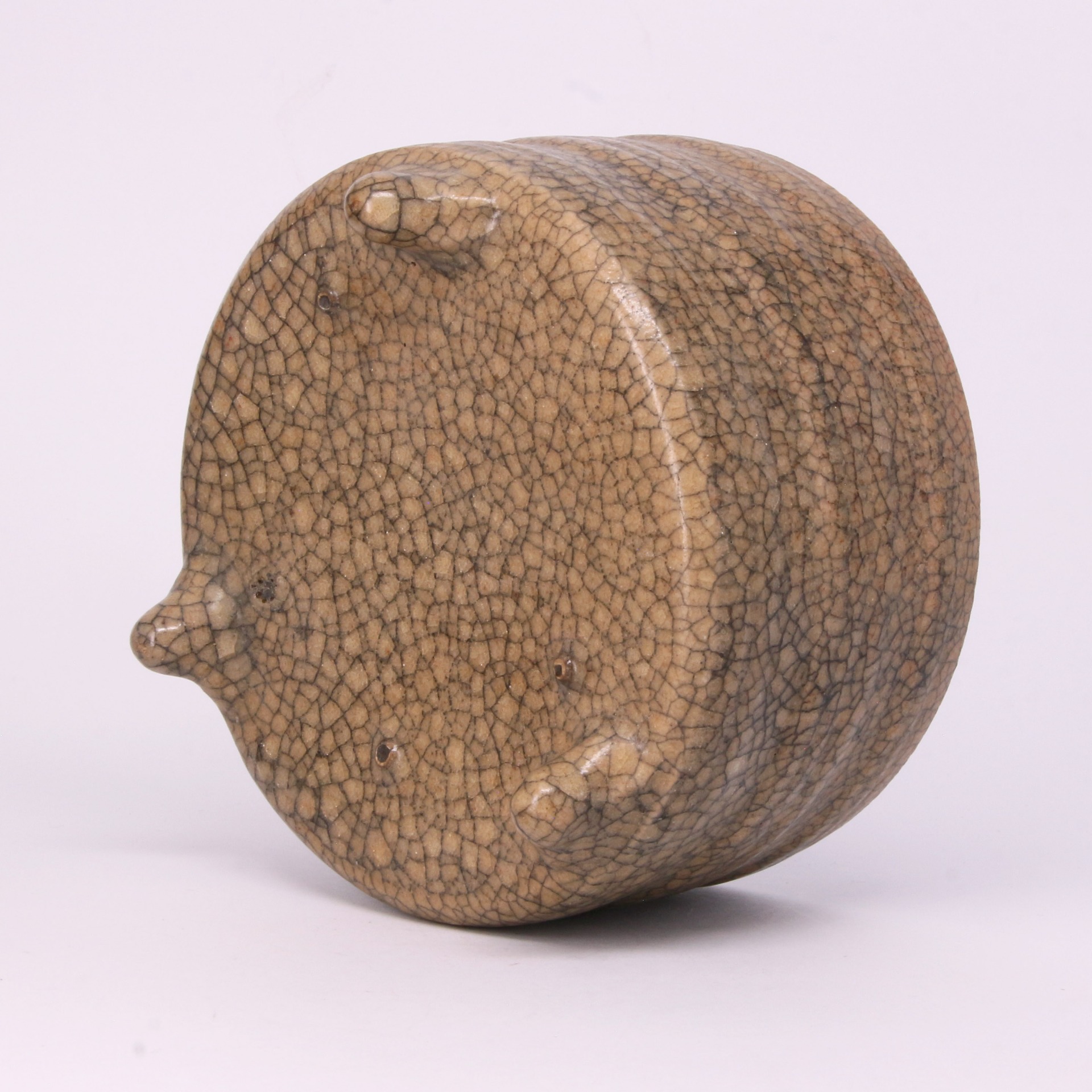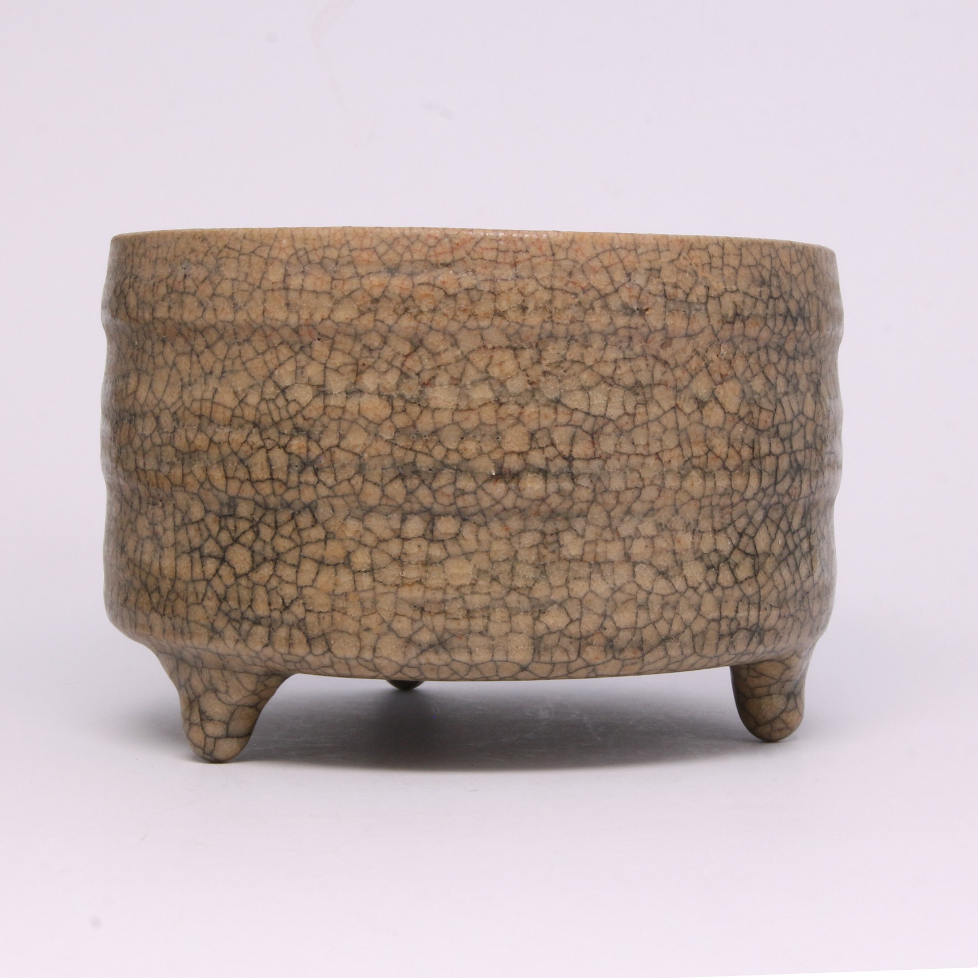 在工藝細節上,此器採用優質瓷土胎身,釉層肥厚瑩潤,色澤呈現如酥油般的米黃或灰青色,觸感細膩柔滑。器底留有明顯的支釘痕跡,顯示出當時為了追求全釉裹燒以達到極致美觀的特殊技法。這種三足尊的形制多參考古代青銅禮器,反映了宋代復古的社會風氣。其深沉內斂的色澤與獨特的開片效果相互輝映,使之不僅是一件實用的陳設器,更是中國陶瓷史上極具代表性的藝術臻品。