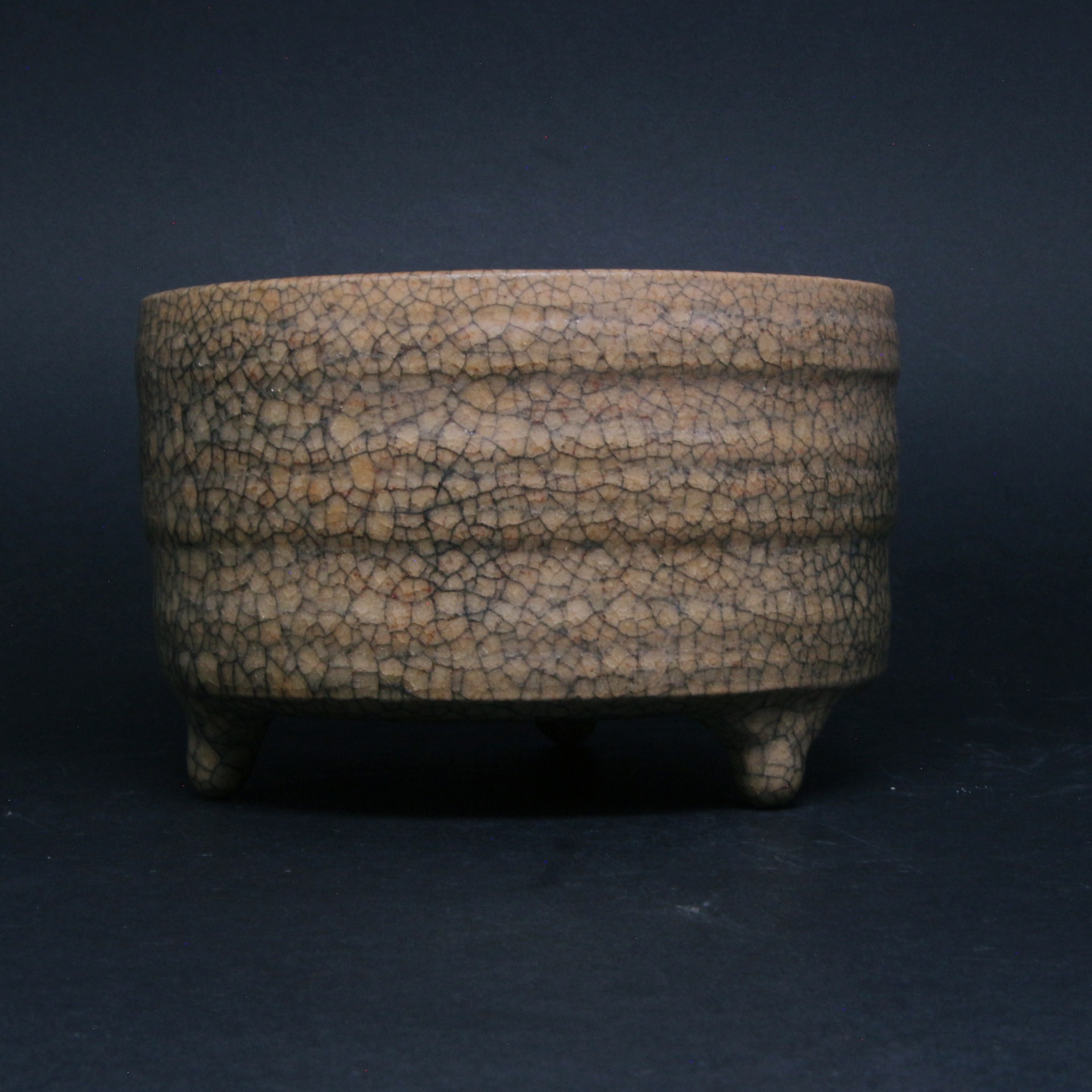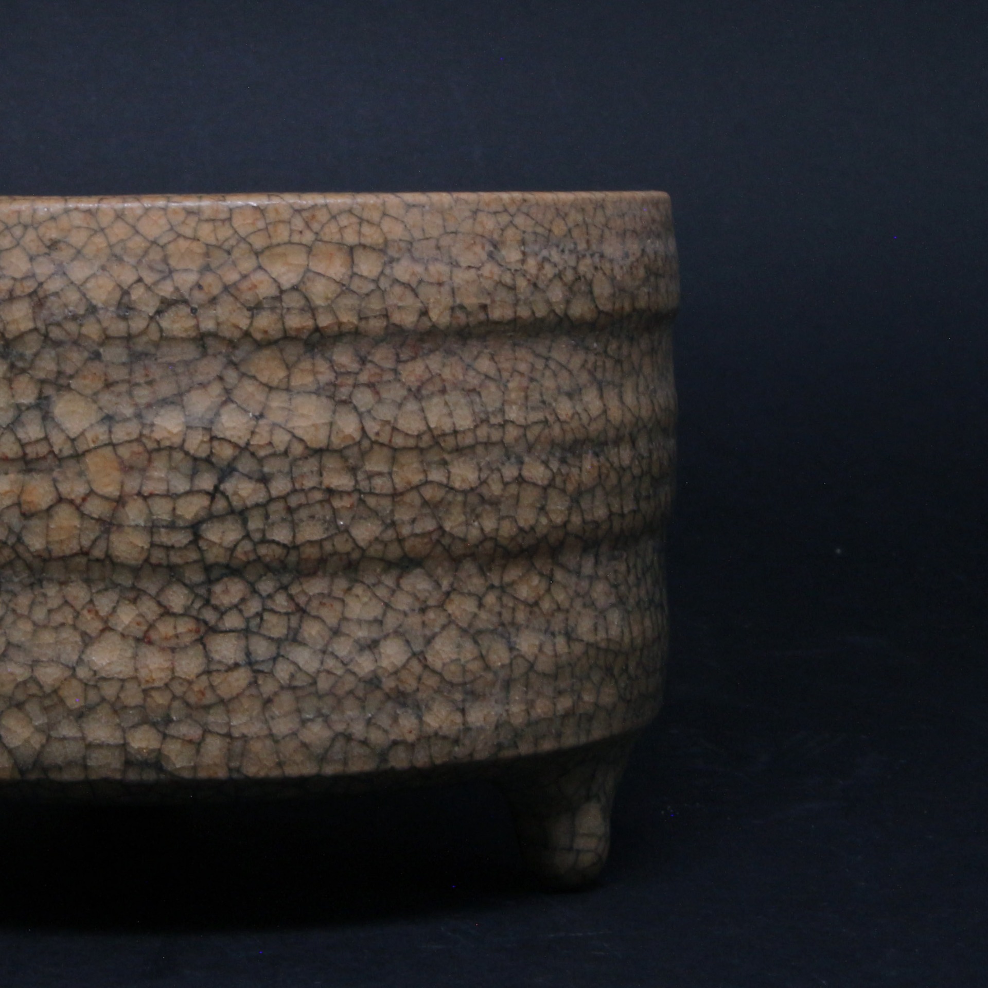 此尊呈直口、深腹、平底,下承三個小足,整體造型莊重穩健。器身裝飾數道凸起的弦紋(旋紋),平添了豐富的視覺層次感與韻律感,使器形在簡練中不失靈動。最引人注目的是其滿布器身的「金絲鐵線」開片紋路:較粗的黑色裂紋與較細的褐色(或金色)裂紋交織,如同寒冰拆裂,形成一種天然去雕飾的破碎之美,完美詮釋了宋代文人追求的「大巧若拙」之境。