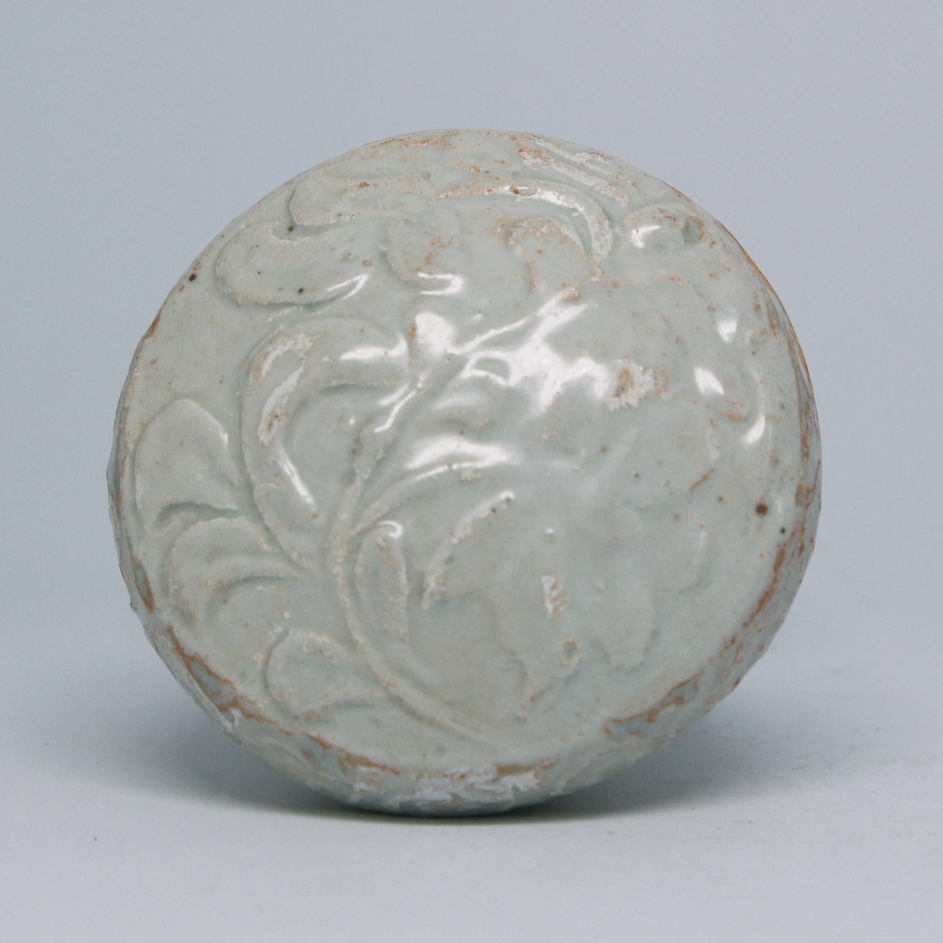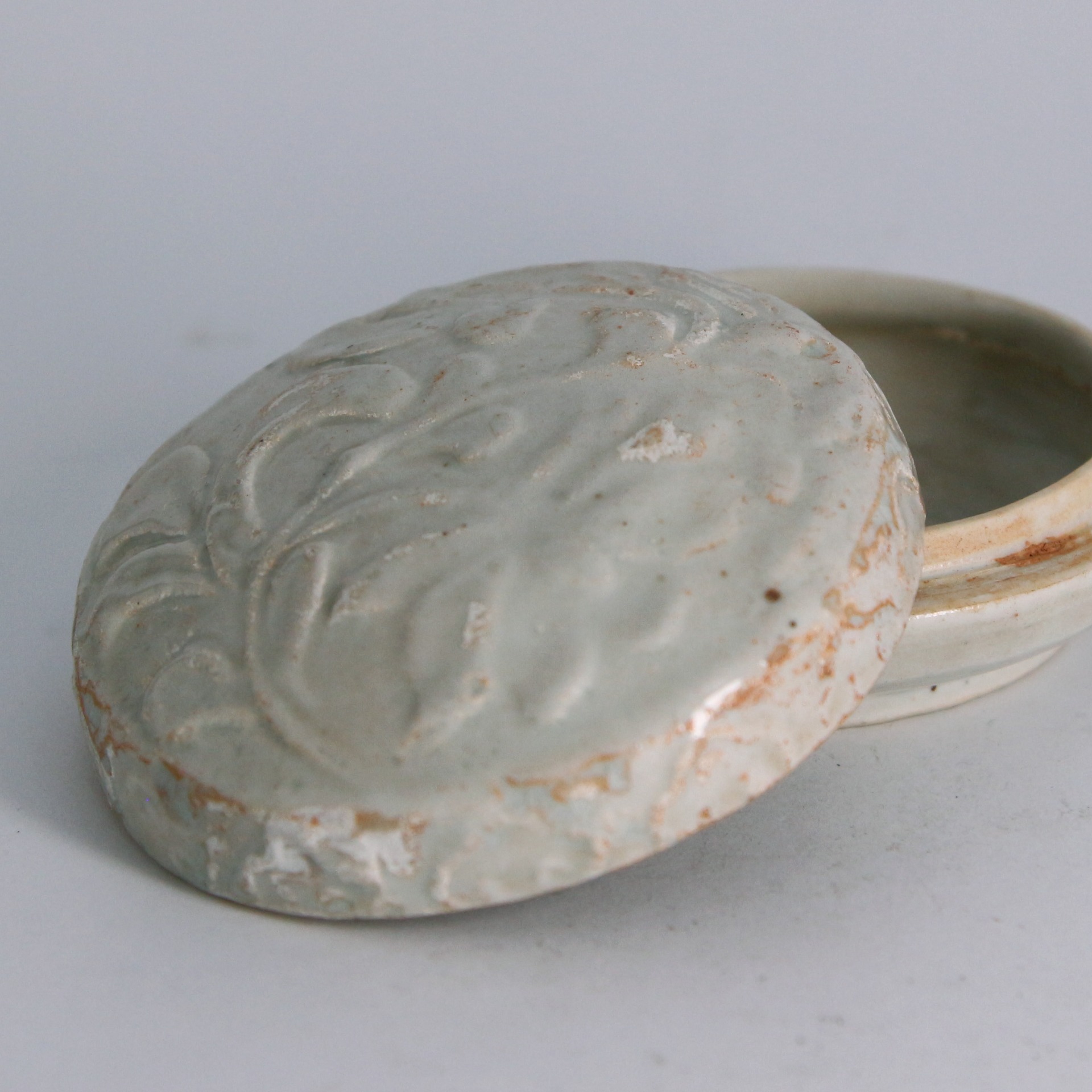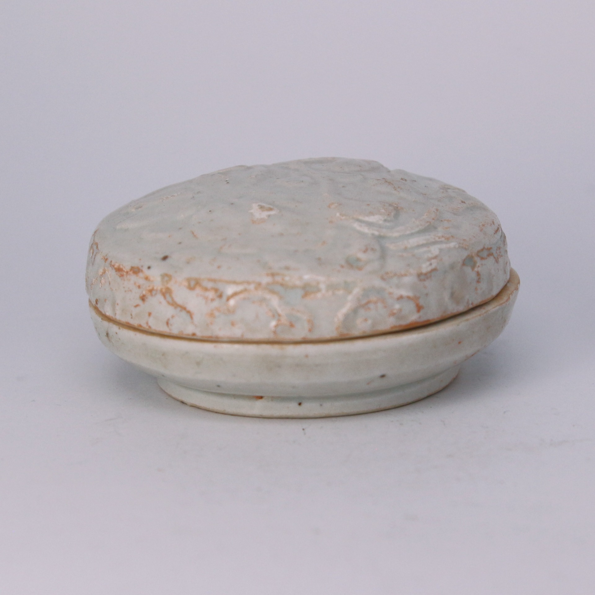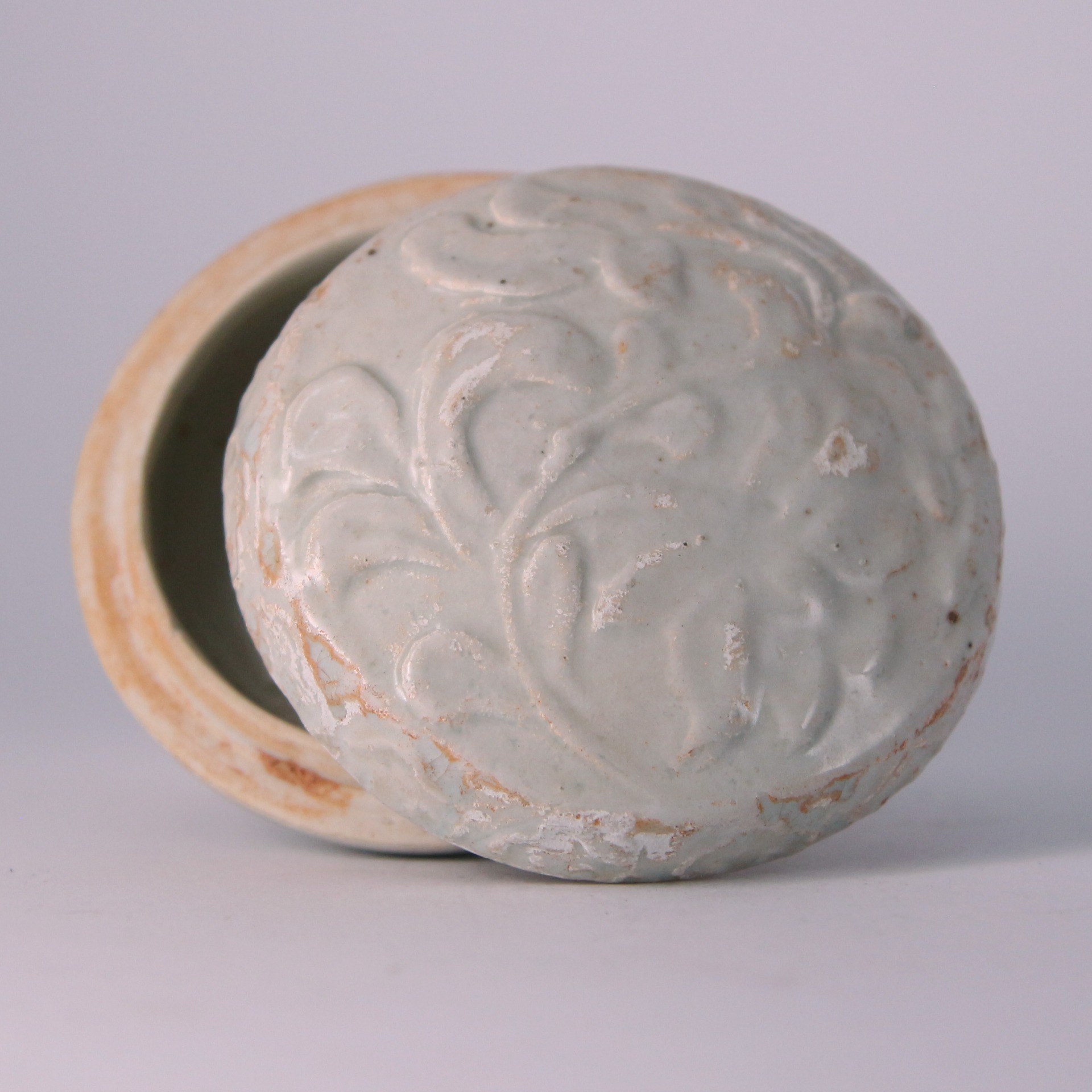 此件湖田窯胭脂盒以細白胎覆以淡雅影青釉,盒蓋以模印技法壓製纏枝花葉紋,線條圓潤含蓄,呈現湖田窯一貫的清潤美感。器身敦圓,比例端雅,小件造型卻蘊含宋代日常器用的審美取向——簡婉、清淨、不事張揚。