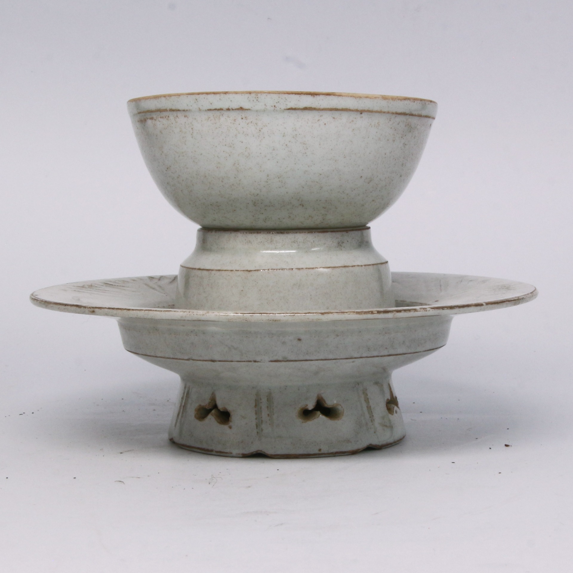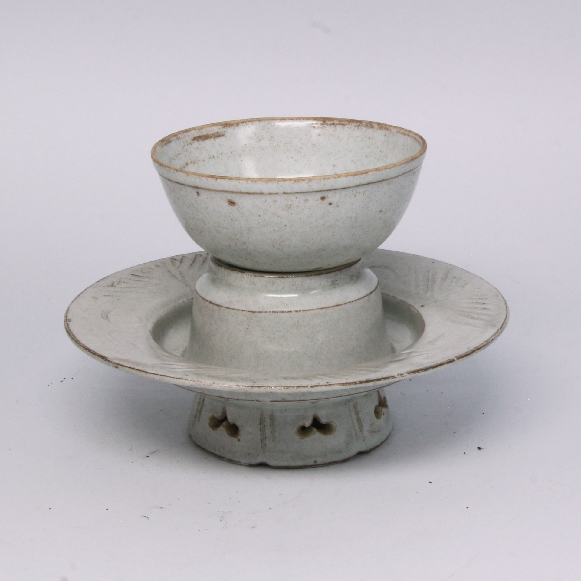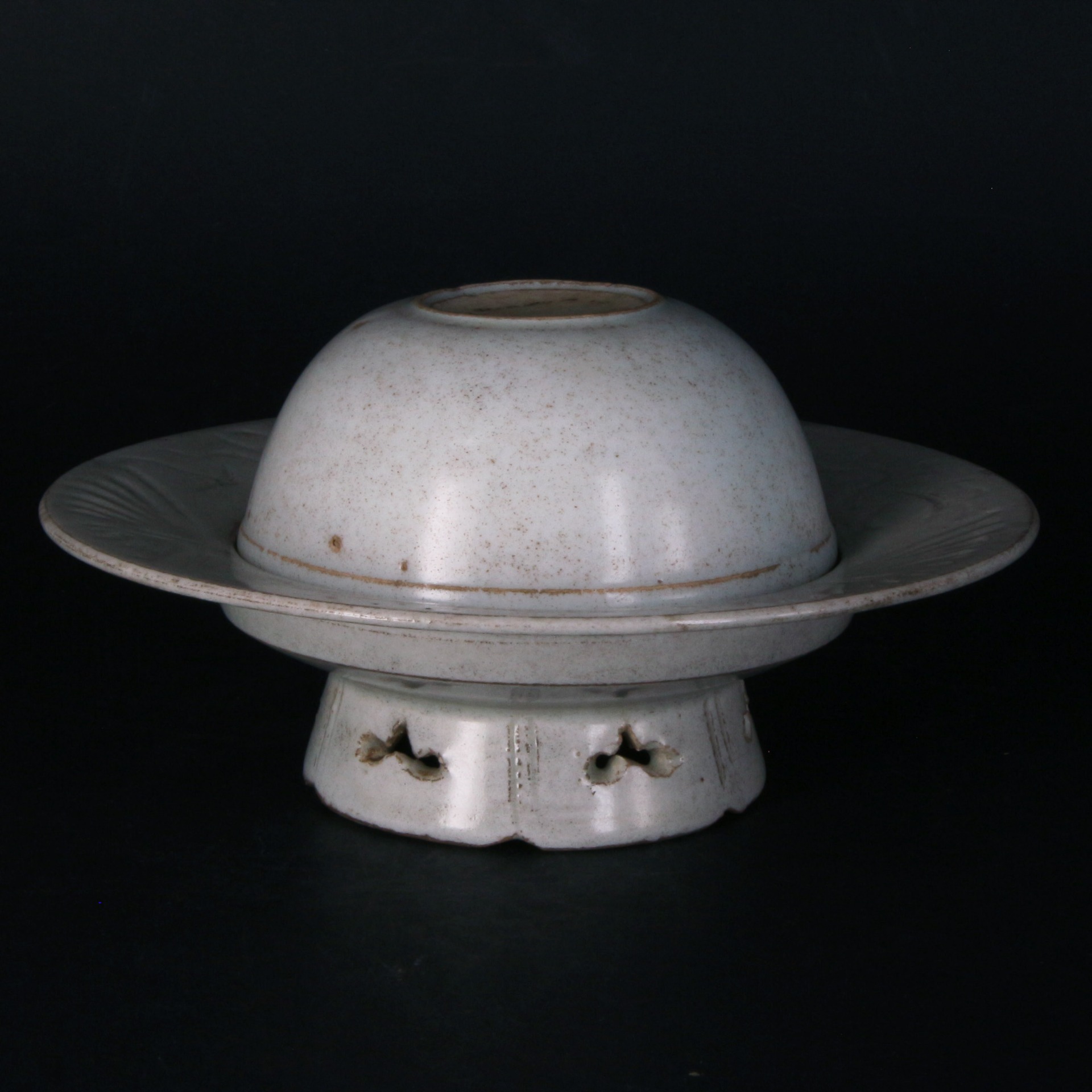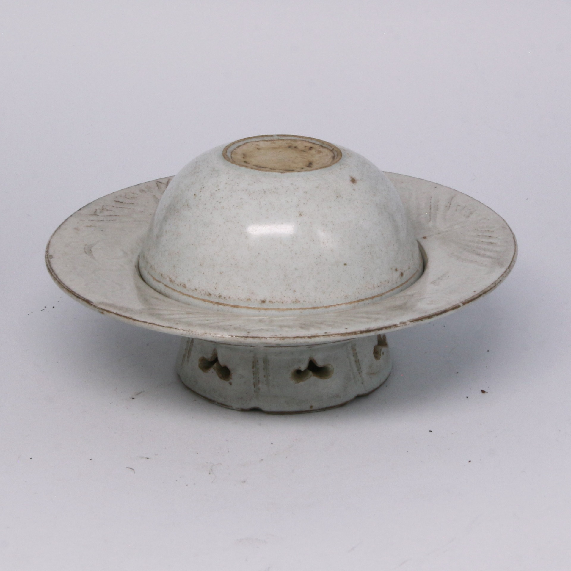 本品為宋代景德鎮湖田窯燒製之影青釉盞托。器物由盞與托兩部分組成,造型規整雅致,比例勻稱。其胎質細膩潔白,釉色呈現典型的「影青」(青白瓷)特徵,釉層透亮且具備極佳的玻璃質感,釉面色澤溫潤如玉,積釉處泛出如湖水般淡淡的青碧色調。盞托設計考究,托盤中心承托盞身,托座下部設有高圈足,並施以精巧的鏤空開光裝飾,這種設計既增加了器物的空間層次感,亦展現了湖田窯工匠在處理複雜結構時的高超技藝,體現了宋代瓷器嚴謹且洗練的工藝水準。
