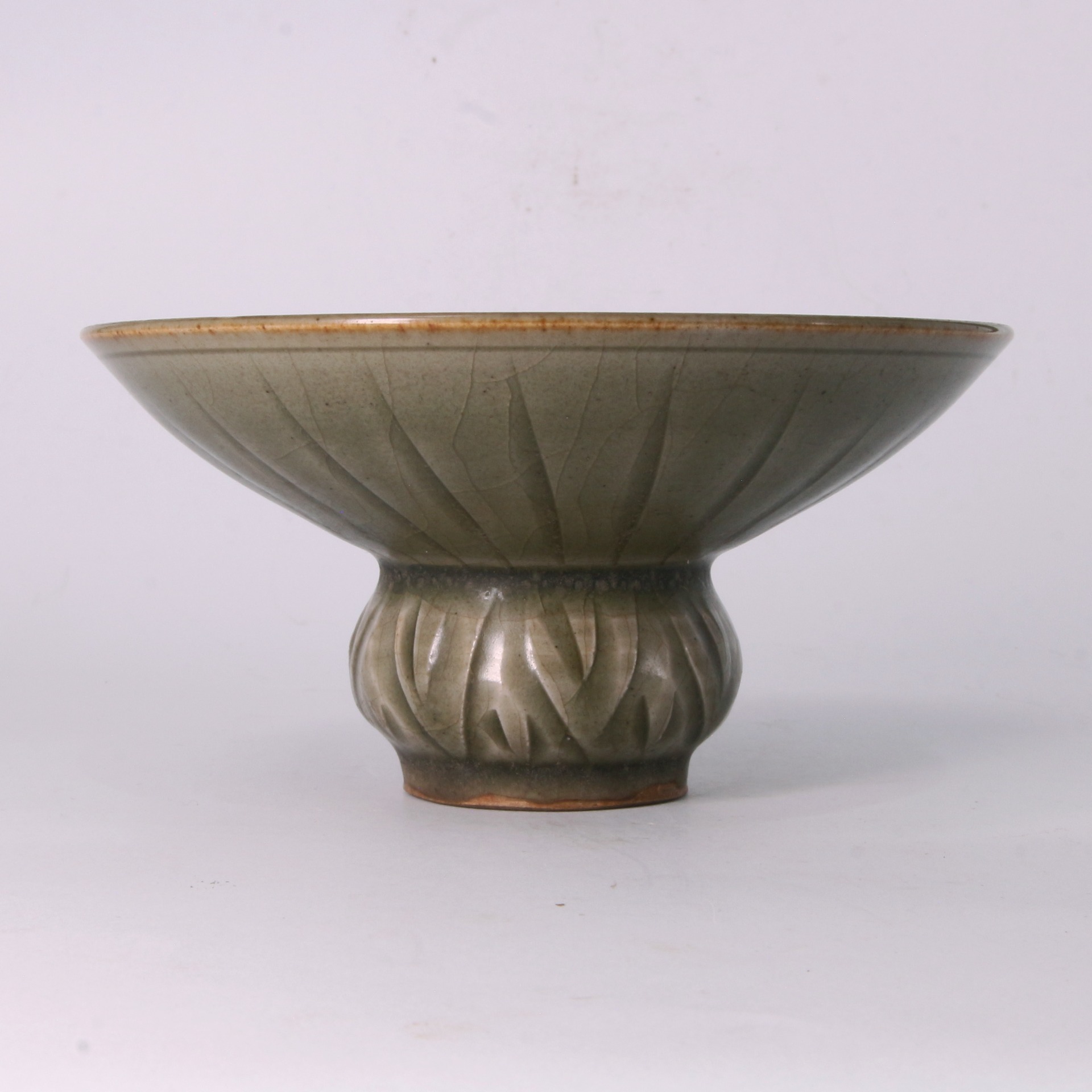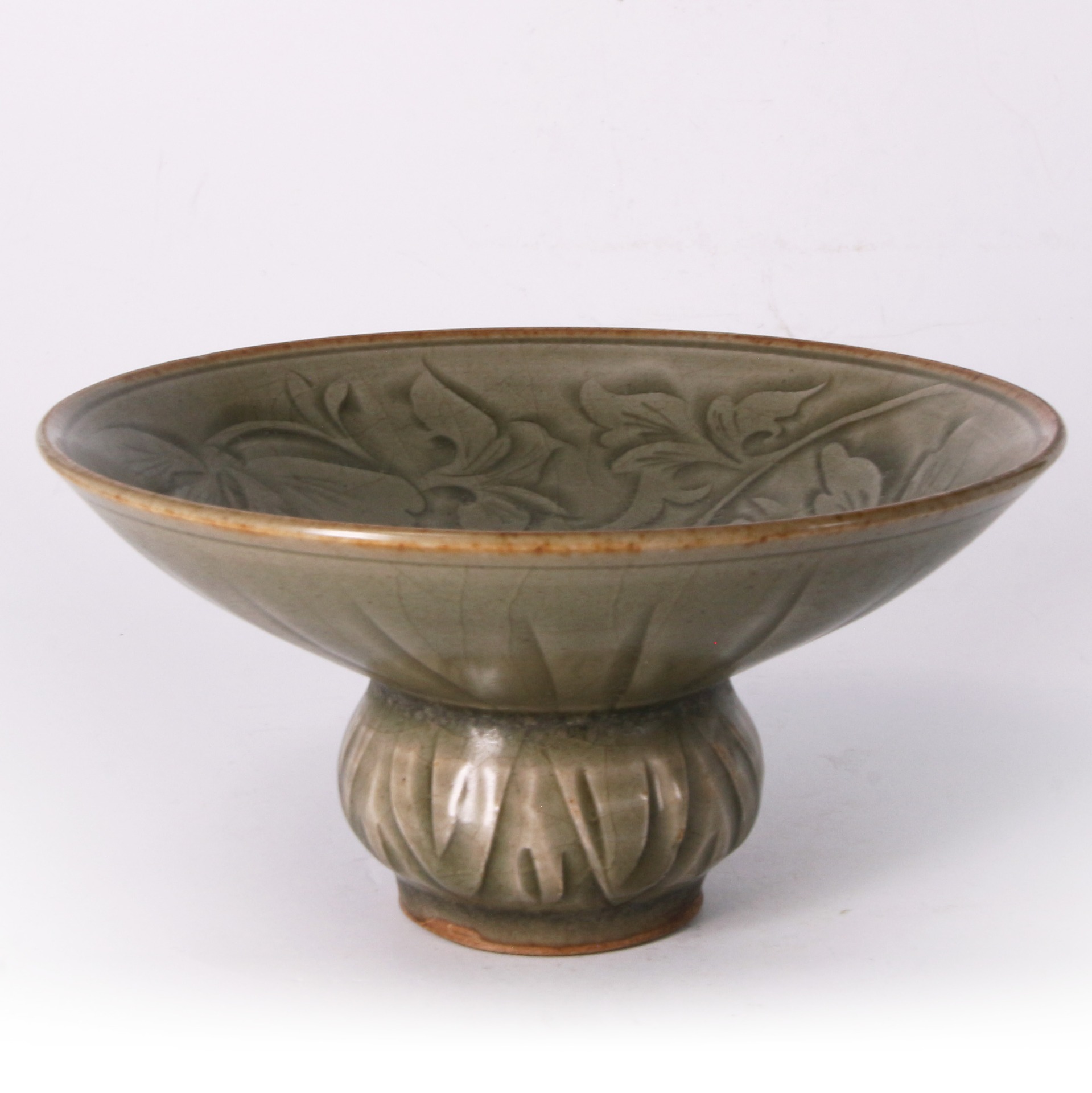 渣斗作為古代文人雅士案頭或宴席間盛放殘渣的實用器,到了宋代更增添了高度的藝術審美價值。耀州窯以其精湛的刻花技術聞名,這件作品所刻劃的牡丹紋,寓意富貴與美好,是當時極受歡迎的裝飾題材。整件器物釉色蒼翠,刻工老練,不僅反映了北宋時期北方青瓷的審美巔峰,更是研究當時生活美學與陶瓷藝術演進的重要實物,具備極高的收藏與研究價值。