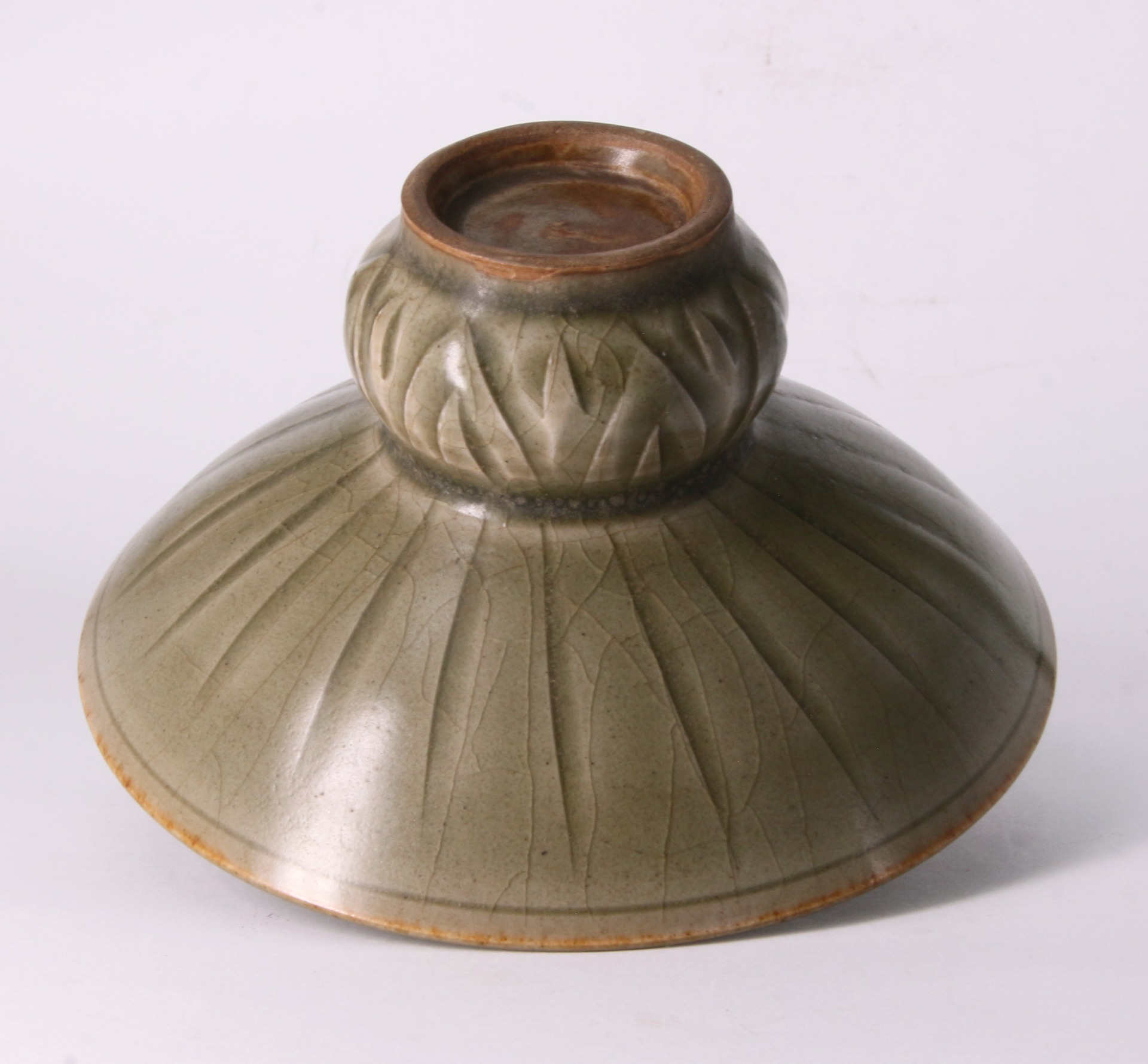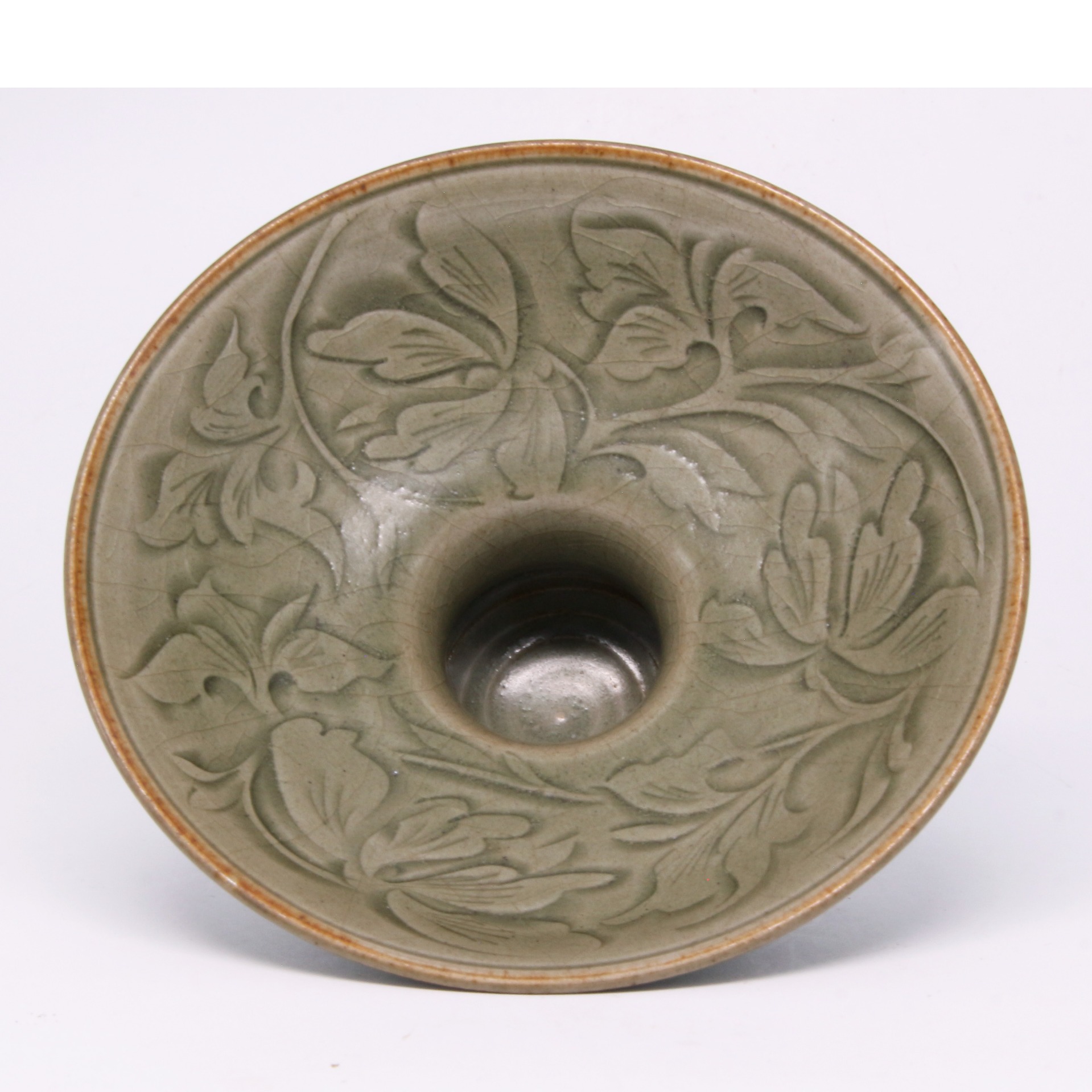 此件渣斗造型端莊,上部呈寬大的廣口放射狀,頸部收束,下接鼓腹圈足,比例勻稱。全器施以耀州窯典型的青翠釉色,釉質瑩潤且深邃。器內壁以犀利的刻花工藝描繪盛開的牡丹花卉,花瓣翻轉自然,線條流暢且富有立體感;外壁則輔以簡約的條紋裝飾。釉水在刻痕深處匯聚,形成深淺對比,使紋飾在青釉的映襯下顯得格外生動,展現了宋代耀州窯「巧如範金,精比琢玉」的極高工藝水準。