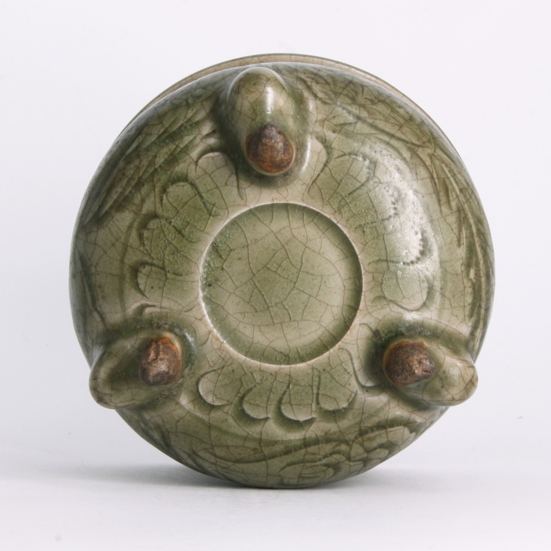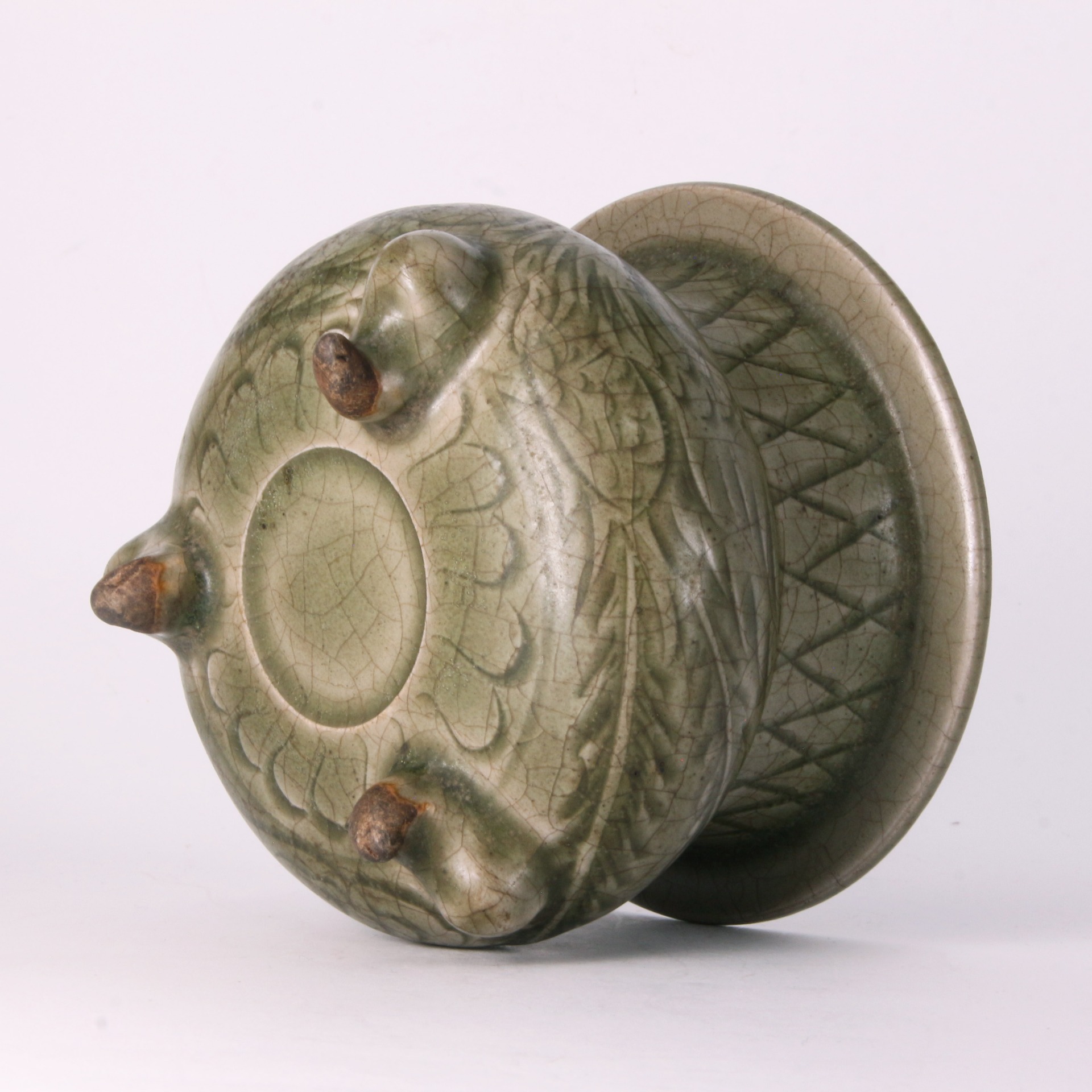 腹部主體飾以鳳紋,鳳凰展翅盤繞於器表,刻工生動傳神,充滿律動感。鳳紋在宋代瓷器中象徵高貴與祥瑞,配合耀州窯獨有的「刀代筆」刻花技法,使鳳凰的羽翼栩栩如生。整體器型穩重而不失靈動,青翠的釉色與繁複的刻花相得益彰,充分體現了耀州窯作為宋代北方青瓷代表的工藝巔峰,是當時文人雅士案頭焚香、裝點書齋的藝術珍品。