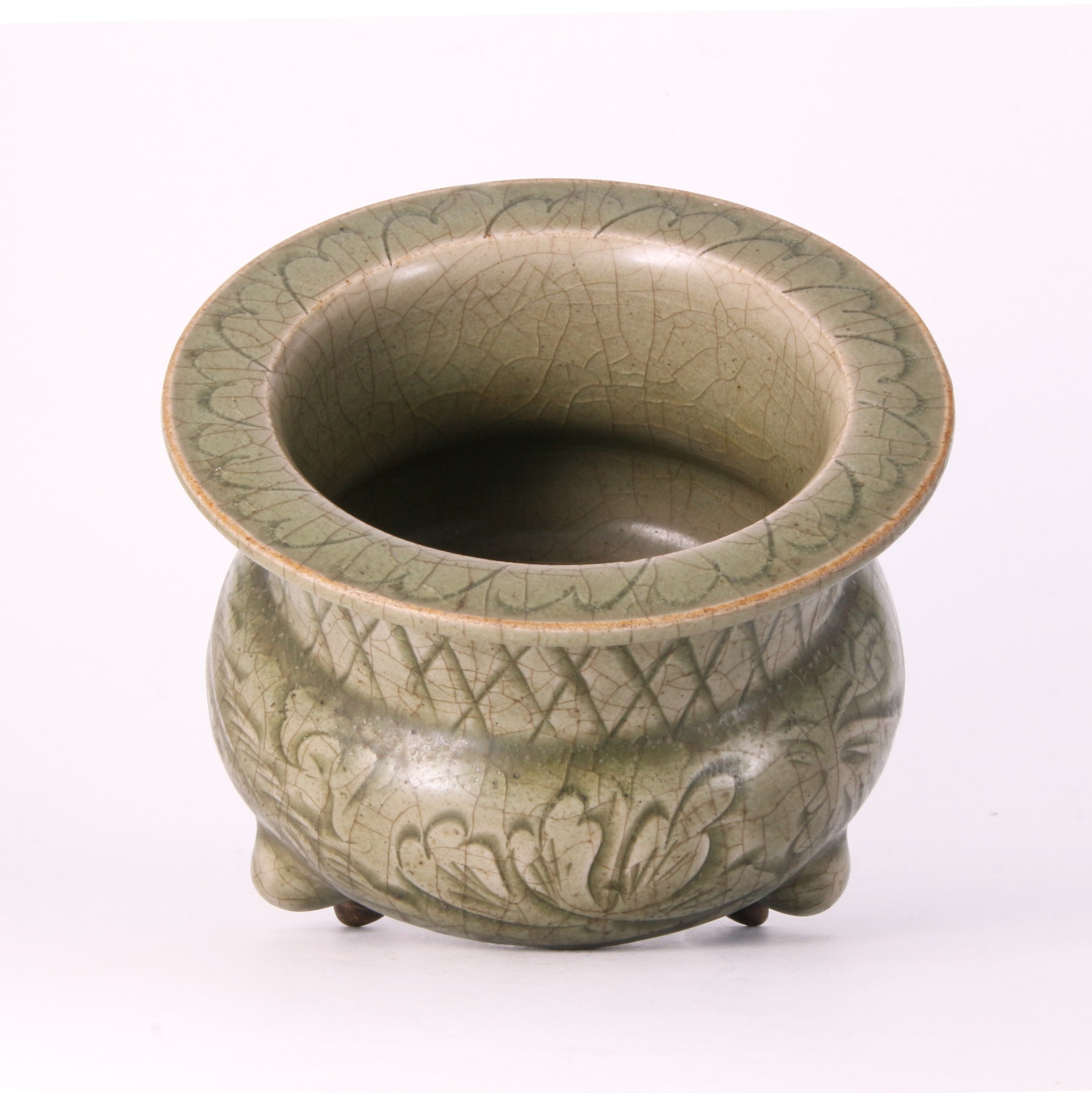 此爐造型典雅古樸,器身呈唇口、直頸、鼓腹之態,下承三支蹄足,展現出宋代特有的洗鍊比例。胎質堅實,全器施以耀州窯標誌性的青艾綠釉,釉色瑩潤且帶有自然的開片紋理,呈現如玉般的質感。爐身頸部飾以規整的網格紋,腹部則運用精湛的刻花工藝,線條流暢犀利,深淺有致,使釉料在刻痕處自然堆積,形成深淺變化的層次感。