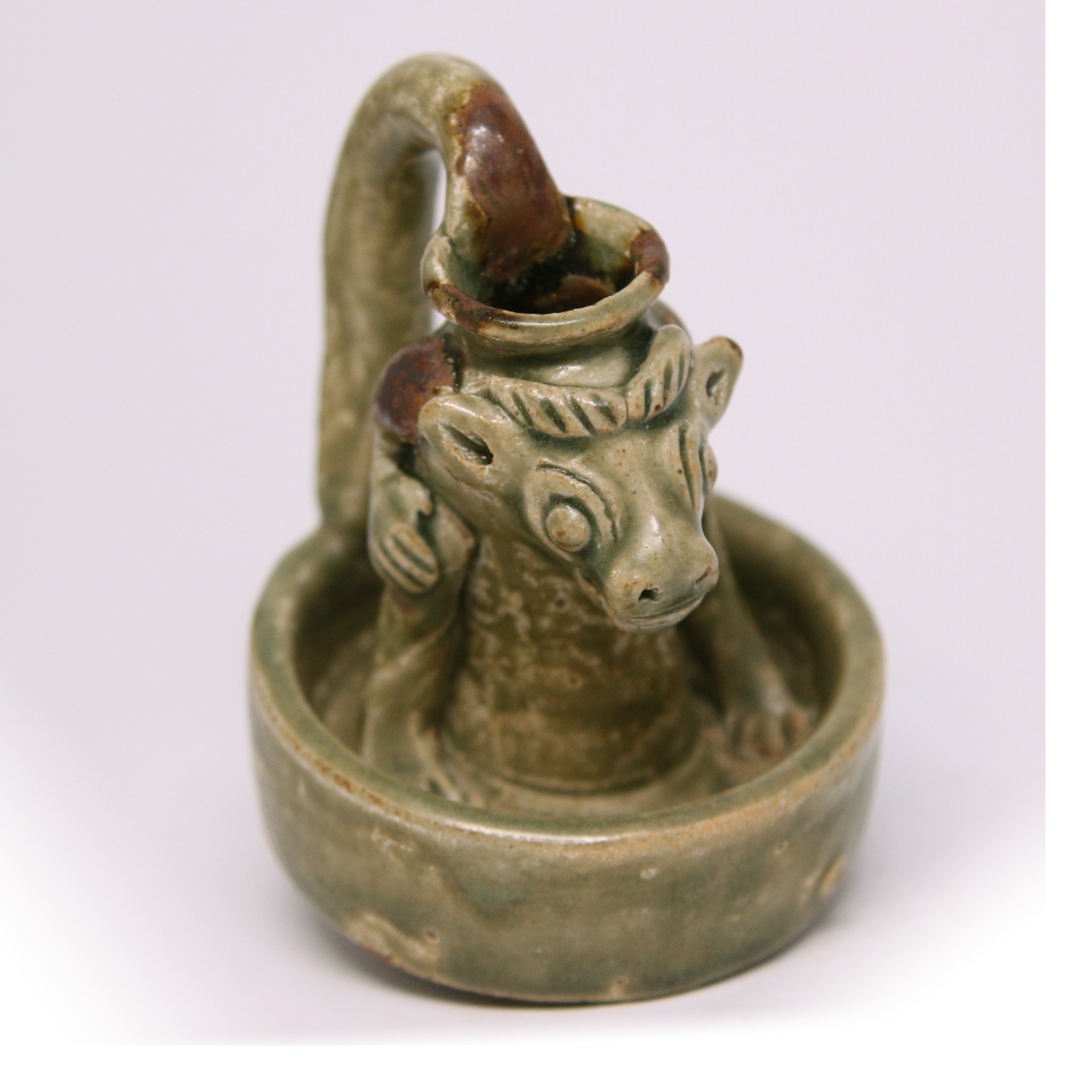 宋人日常生活講求實用兼雅趣,此類動物造型油燈不僅照明,也是寓意吉祥的居家器物。牛獸象徵勤勞、力量與守護,而充滿手感的造型與釉色,反映耀州窯器物在民生用途上更自由生動的一面。此燈既保留窯口典型的灰青之美,又展現樸拙幽默的情趣,是宋代生活美學中溫暖親切的縮影。