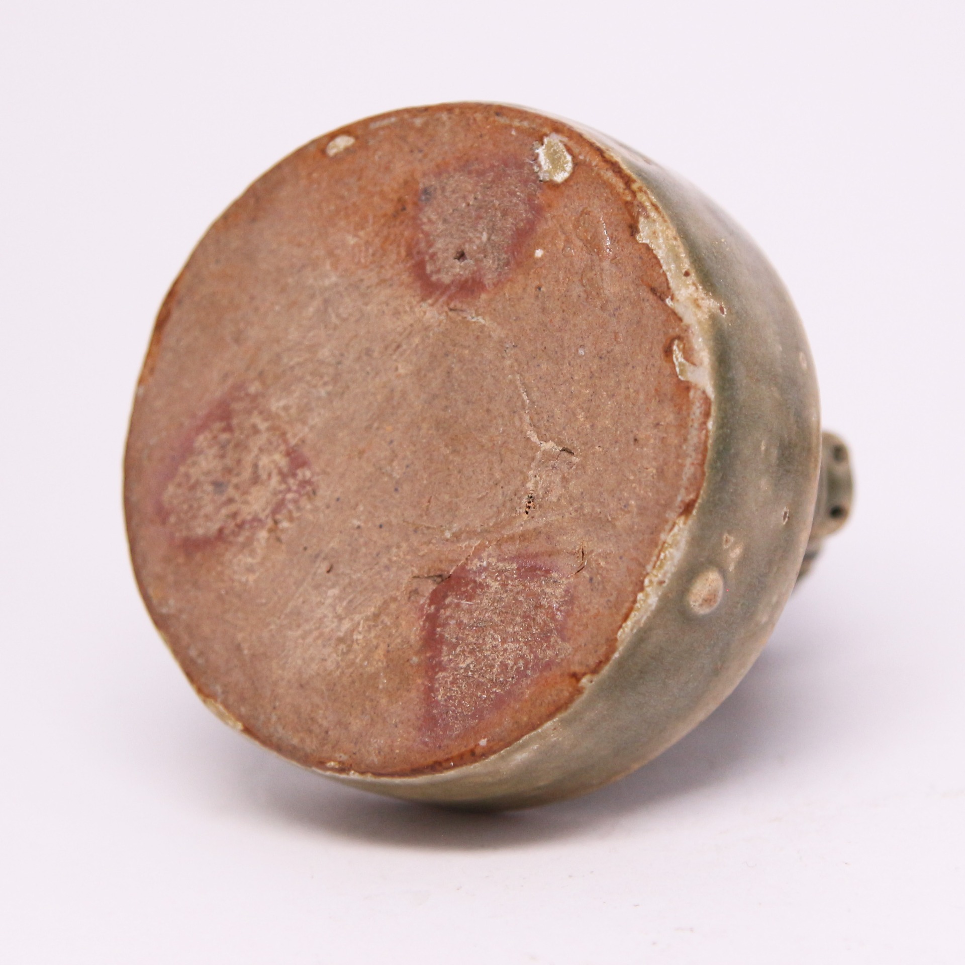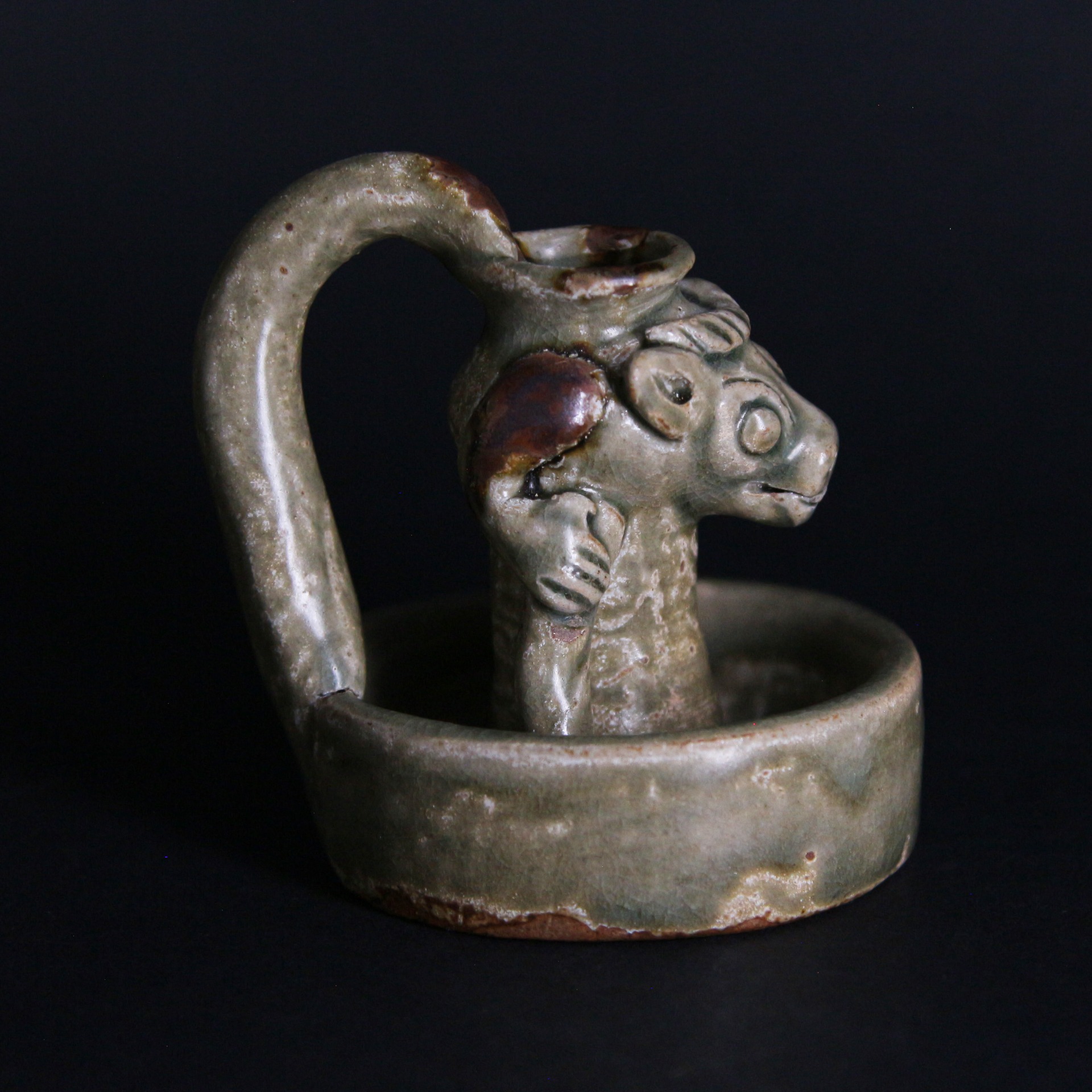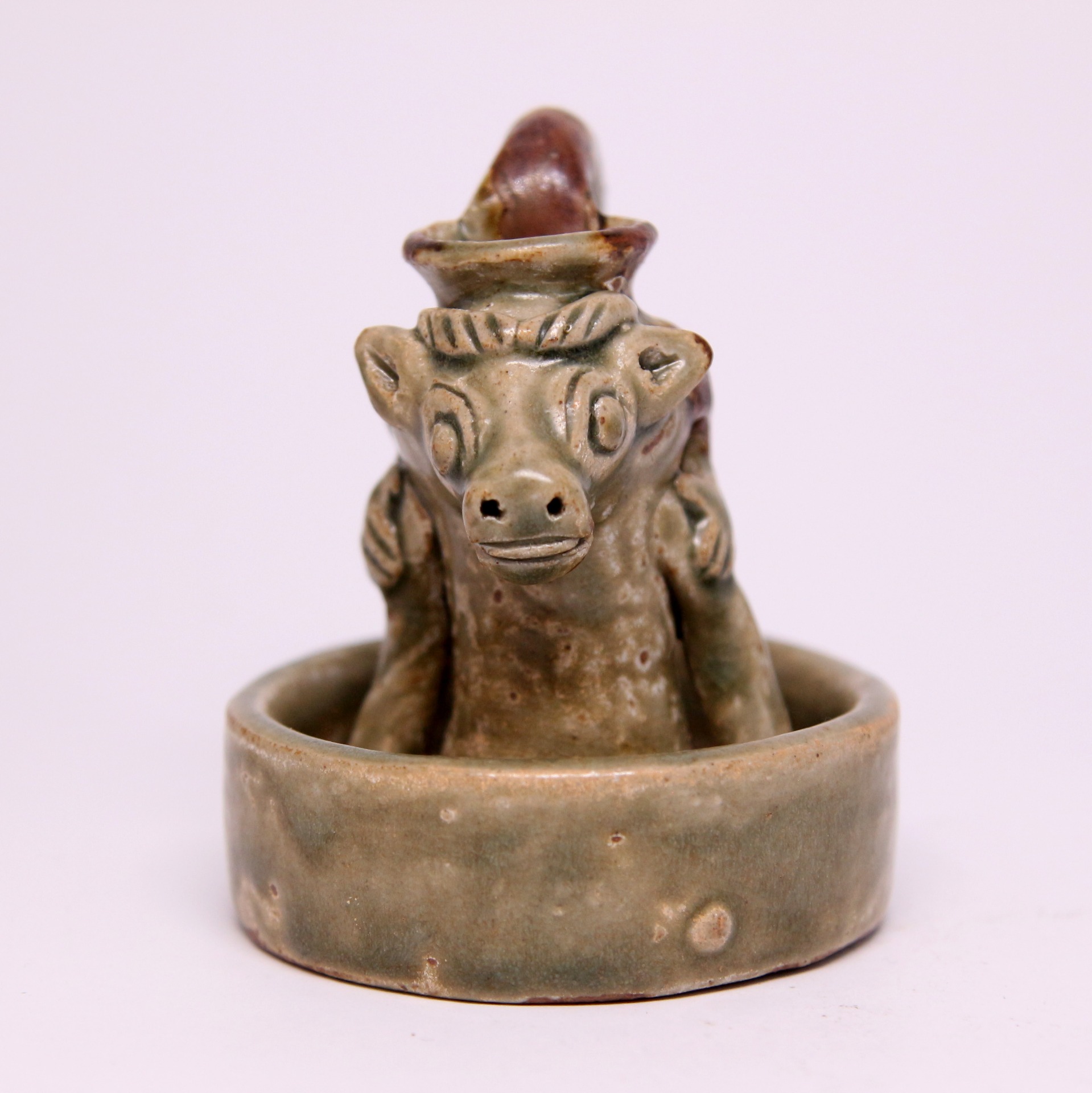 此件宋代耀州窯牛獸油燈以灰青釉通體覆燒,釉色溫潤樸雅。牛獸造型誇張而富童趣,圓眼、短角、微啣的嘴形皆以樸拙線條呈現,具有強烈的民間匠作風格。獸身自油盞中央挺立,背部延伸出的中空提梁連接至口沿,使器形在構造上既實用又具雕塑感。局部施以褐彩點綴,更添層次。