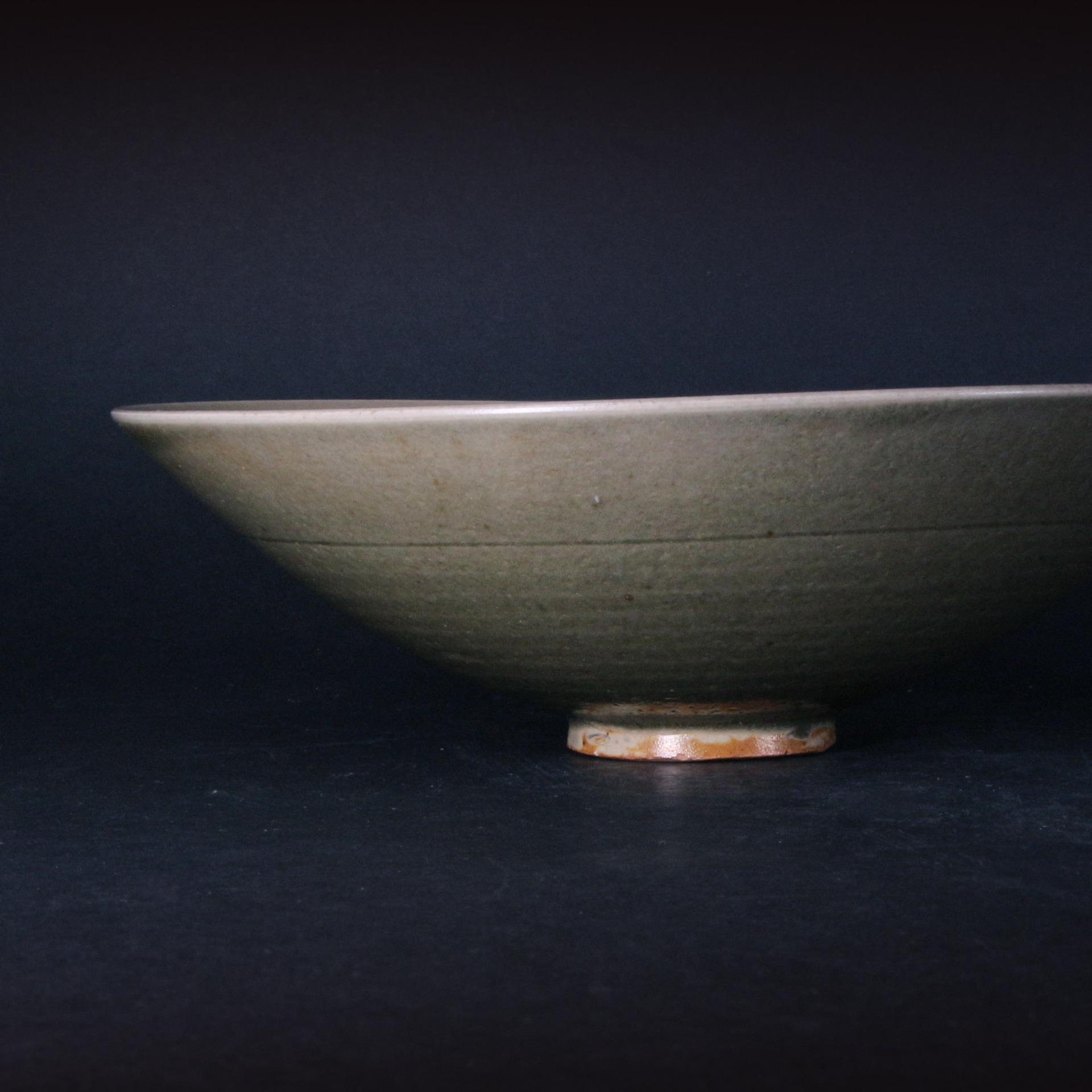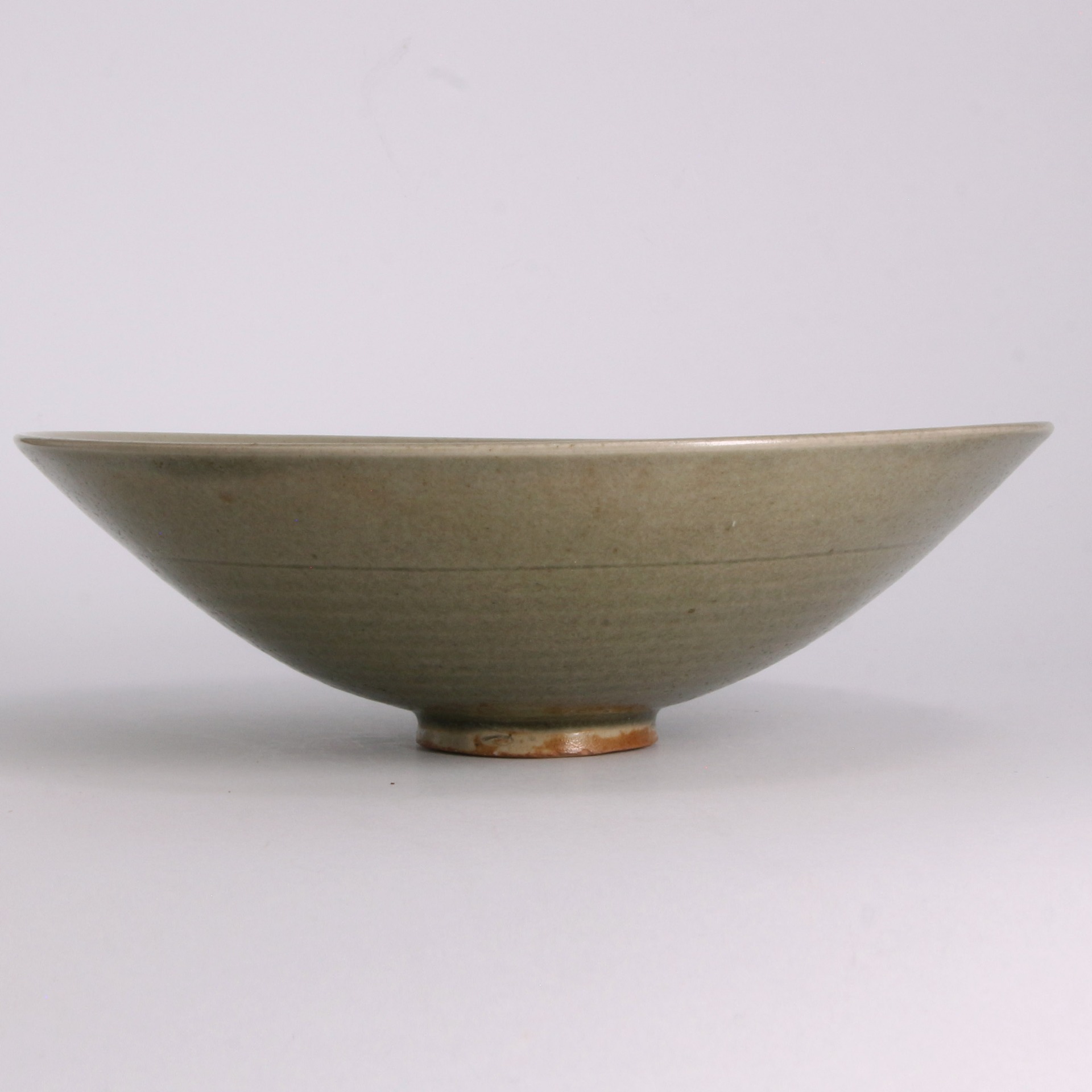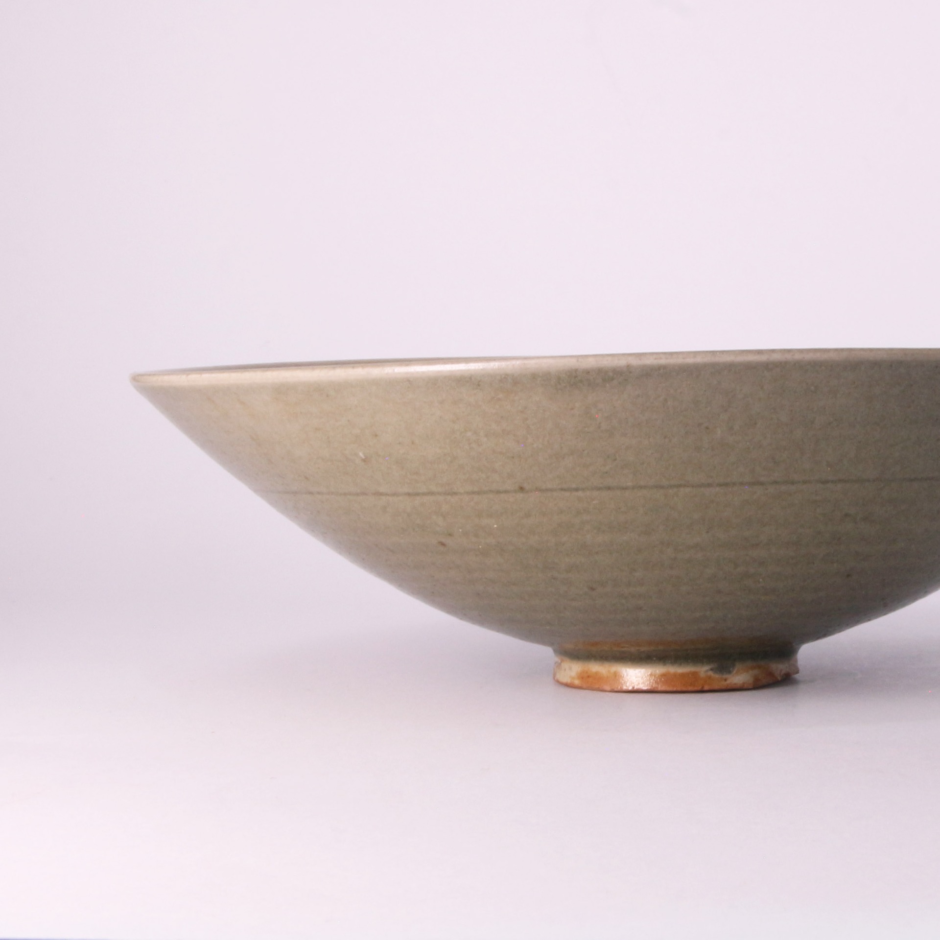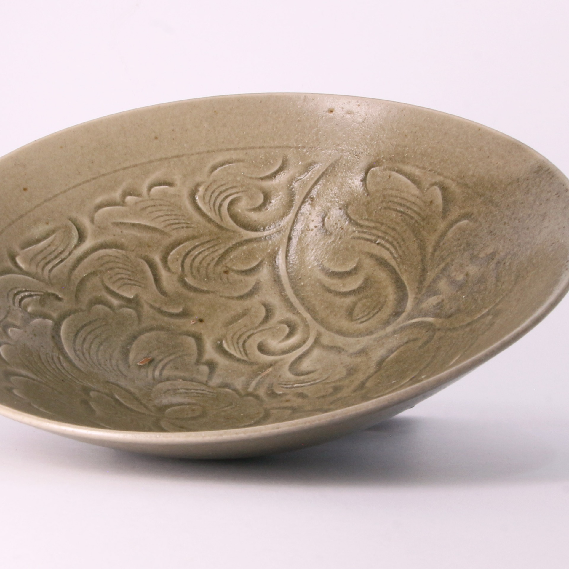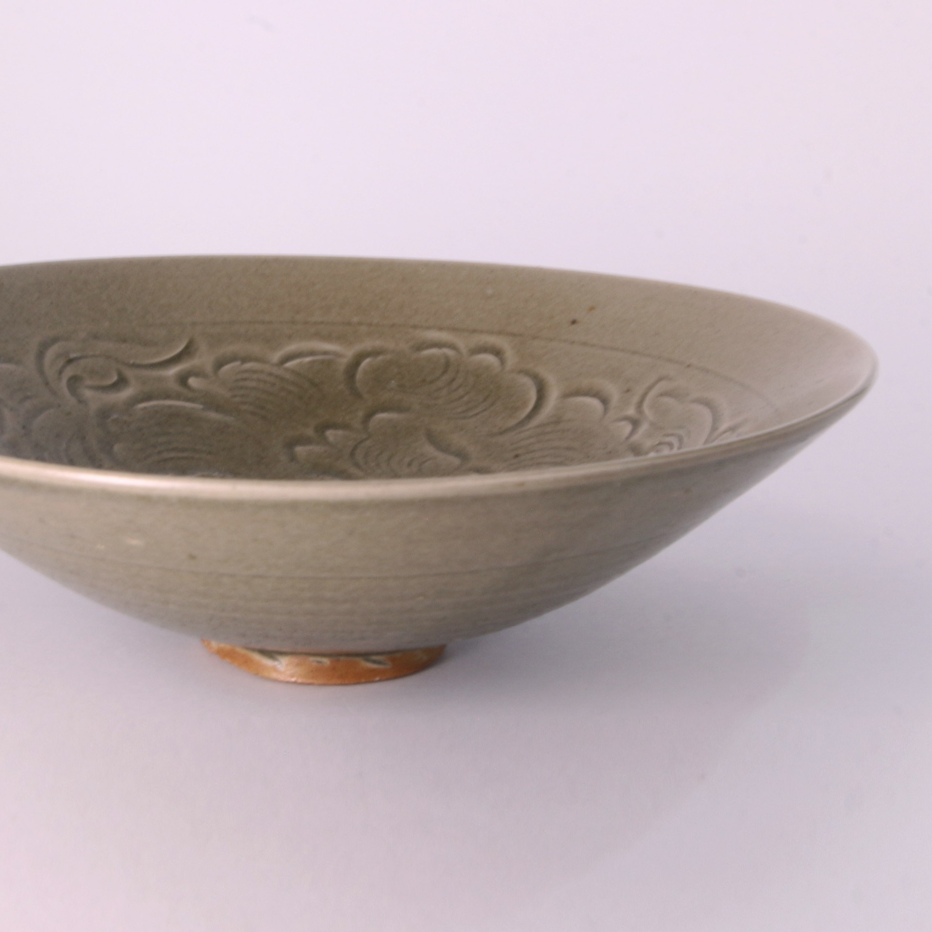 此盞形如倒置的斗笠,線條簡潔挺拔,是宋代流行的典型器形。器內壁滿刻牡丹花卉紋,展現了耀州窯最著名的「刻花」工藝:工匠以斜刀深深刻入胎體,刀鋒犀利、轉折圓活,使花瓣層次分明且富有立體感。這種「剔刻」技法配合流暢的線條,使盛開的牡丹彷彿在微風中搖曳,展現出北方窯場特有的粗獷與灑脫,生氣盎然。