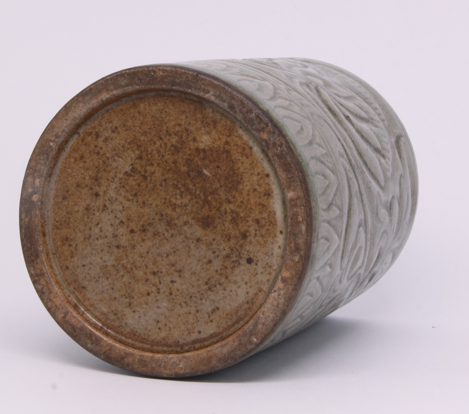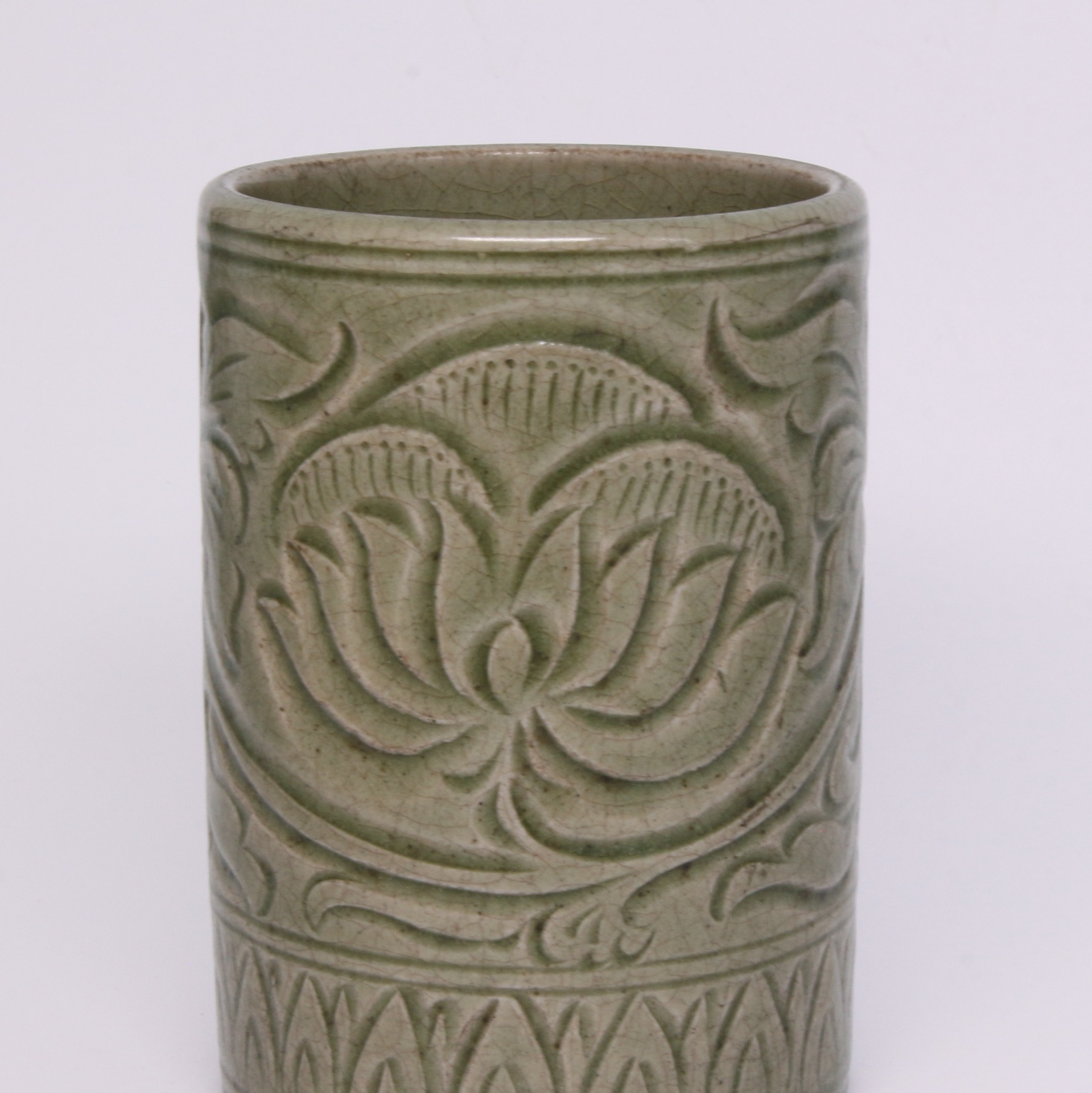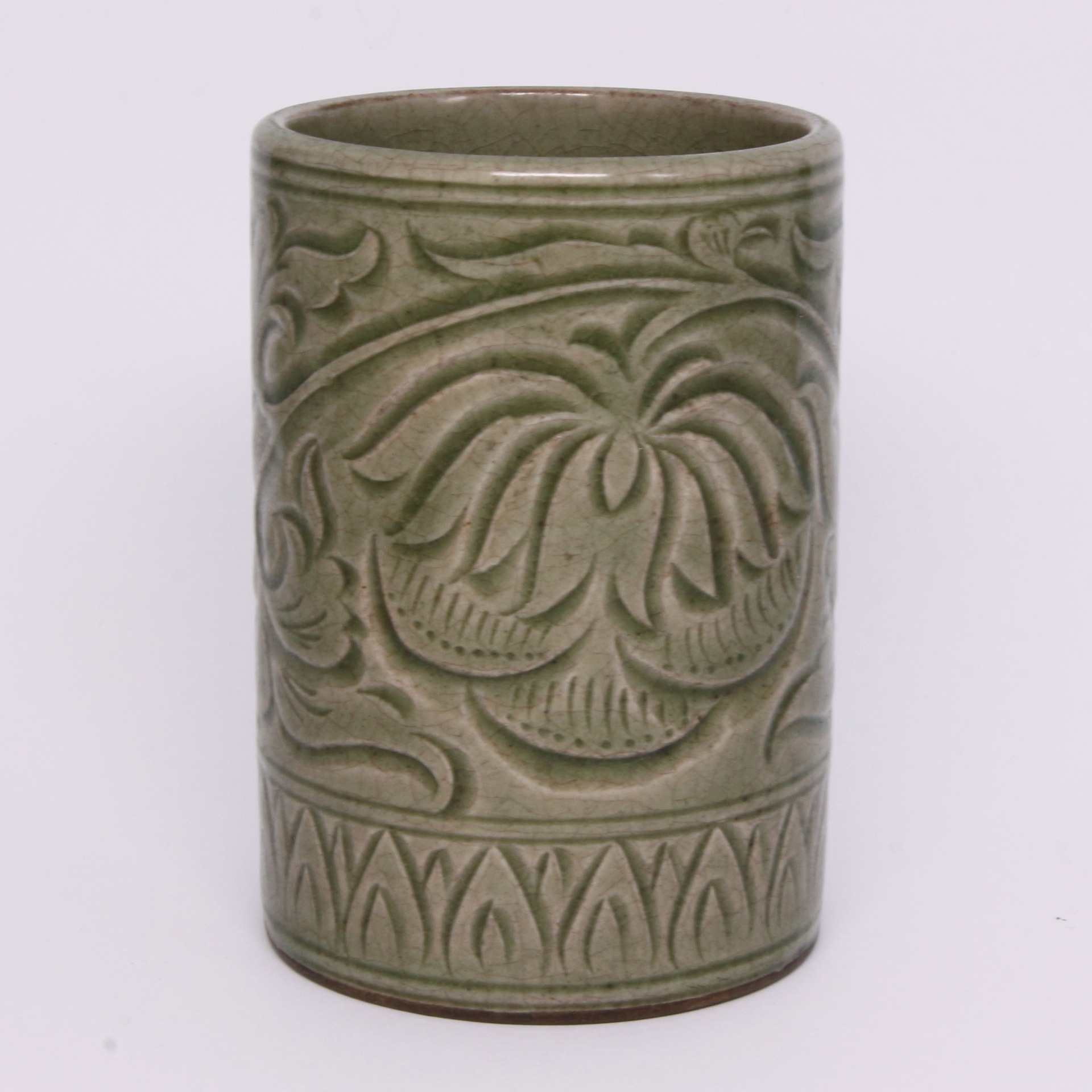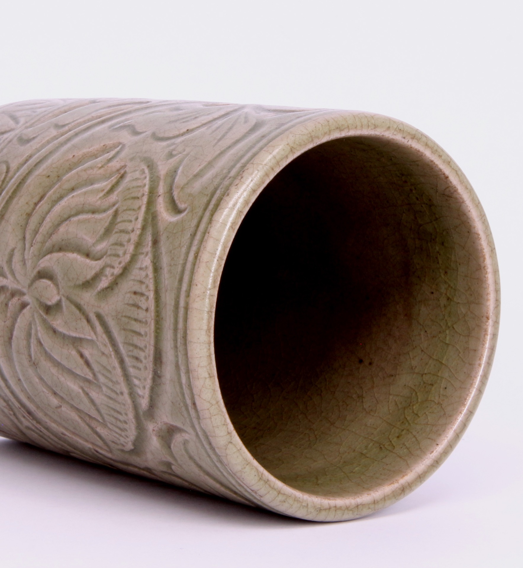 此件筆筒造型敦厚規整,通體施以耀州窯標誌性的橄欖綠釉,釉質溫潤且伴有細碎開片。器表採用精湛的刻花工藝,主體裝飾纏枝牡丹紋,花瓣層次分明,線條犀利流暢。其獨特的「斜刀刻劃」技法,使紋飾在釉層深淺變化中呈現出立體浮雕感,充分體現了宋代耀州窯「巧如範金,精比琢玉」的藝術水準。