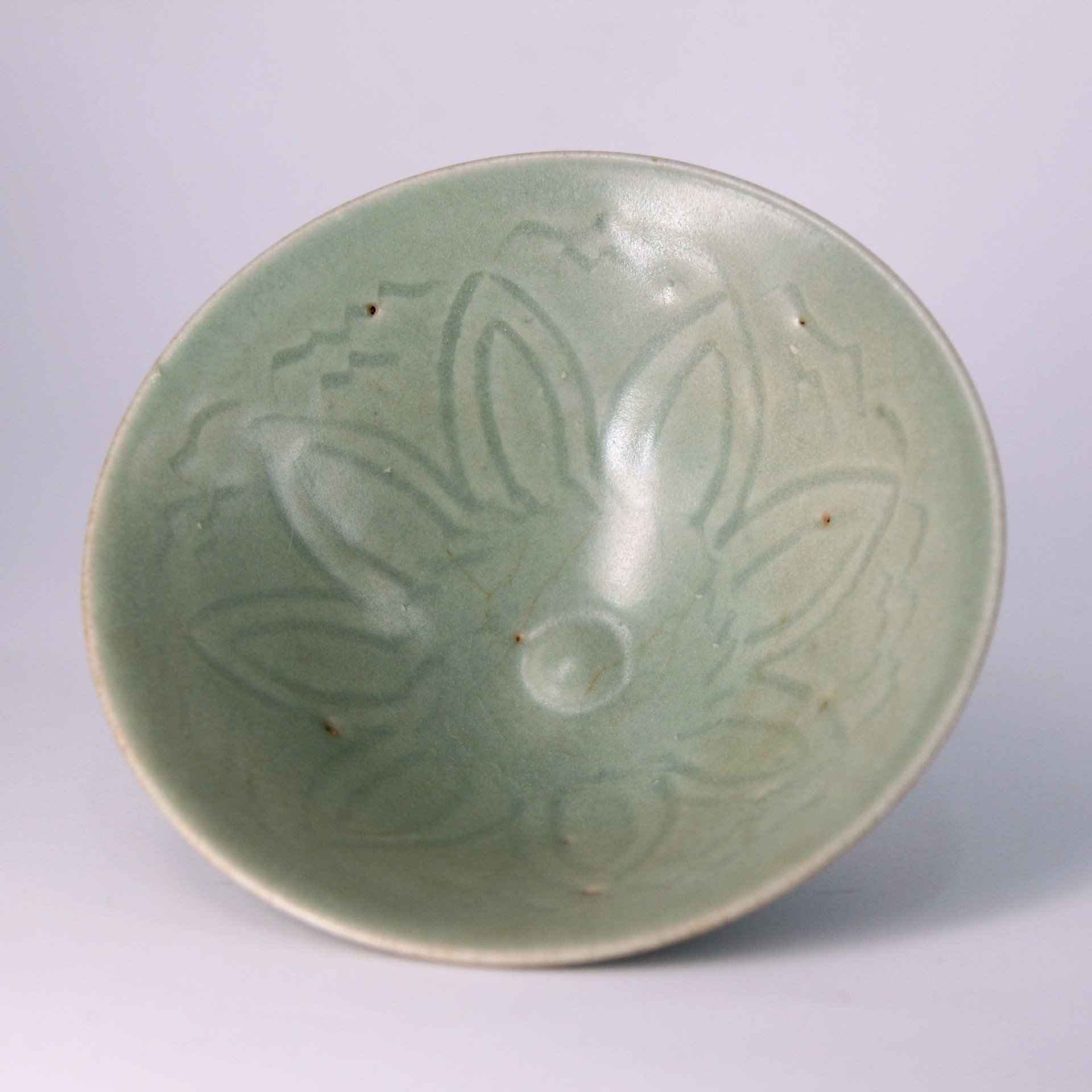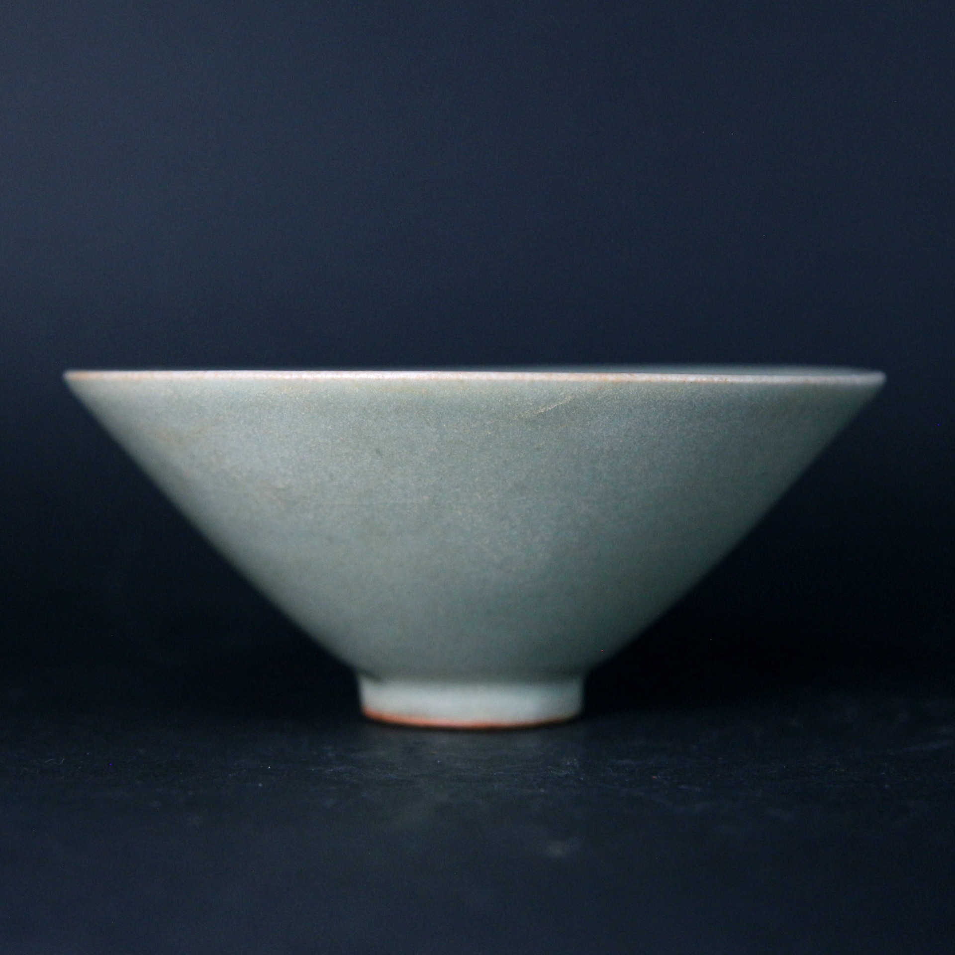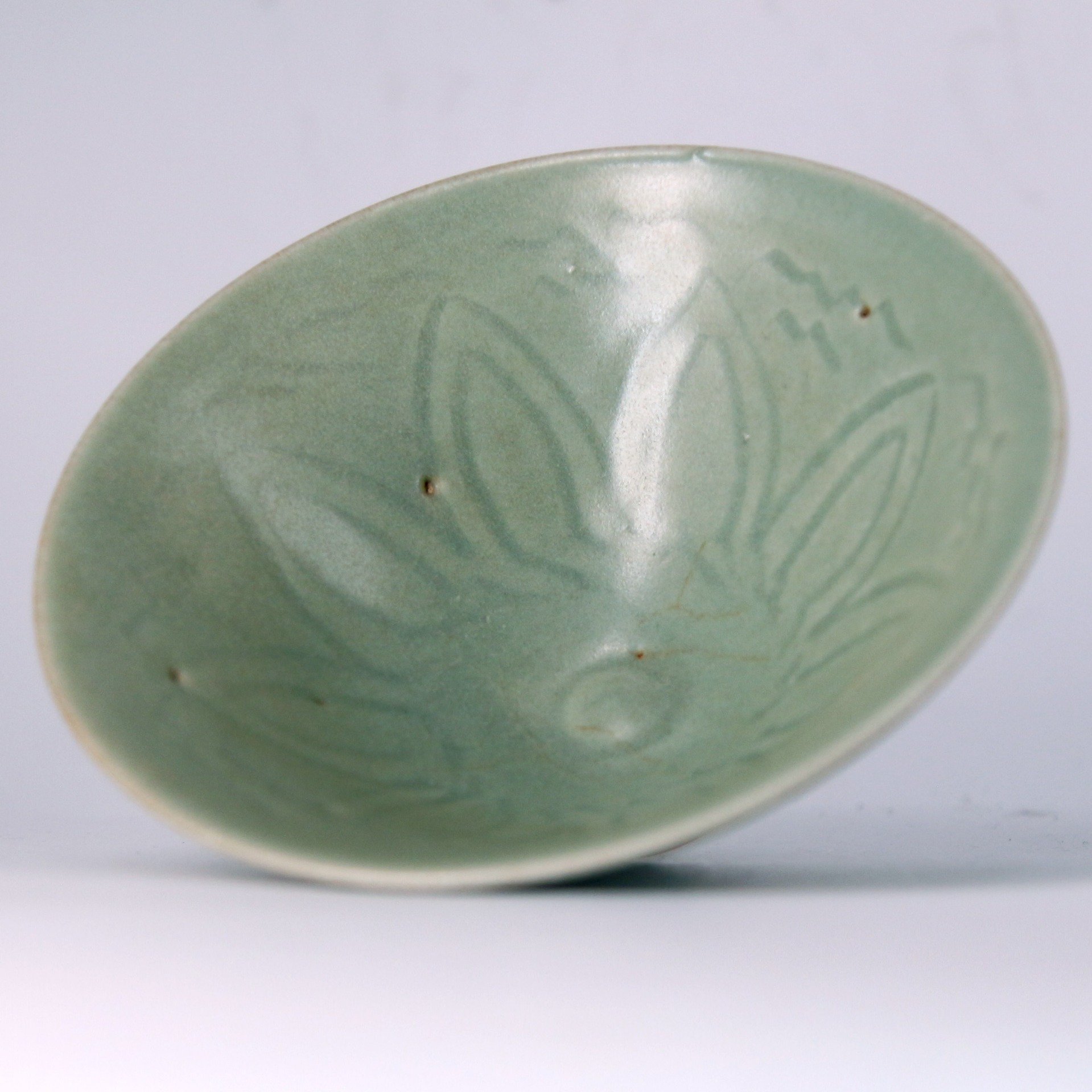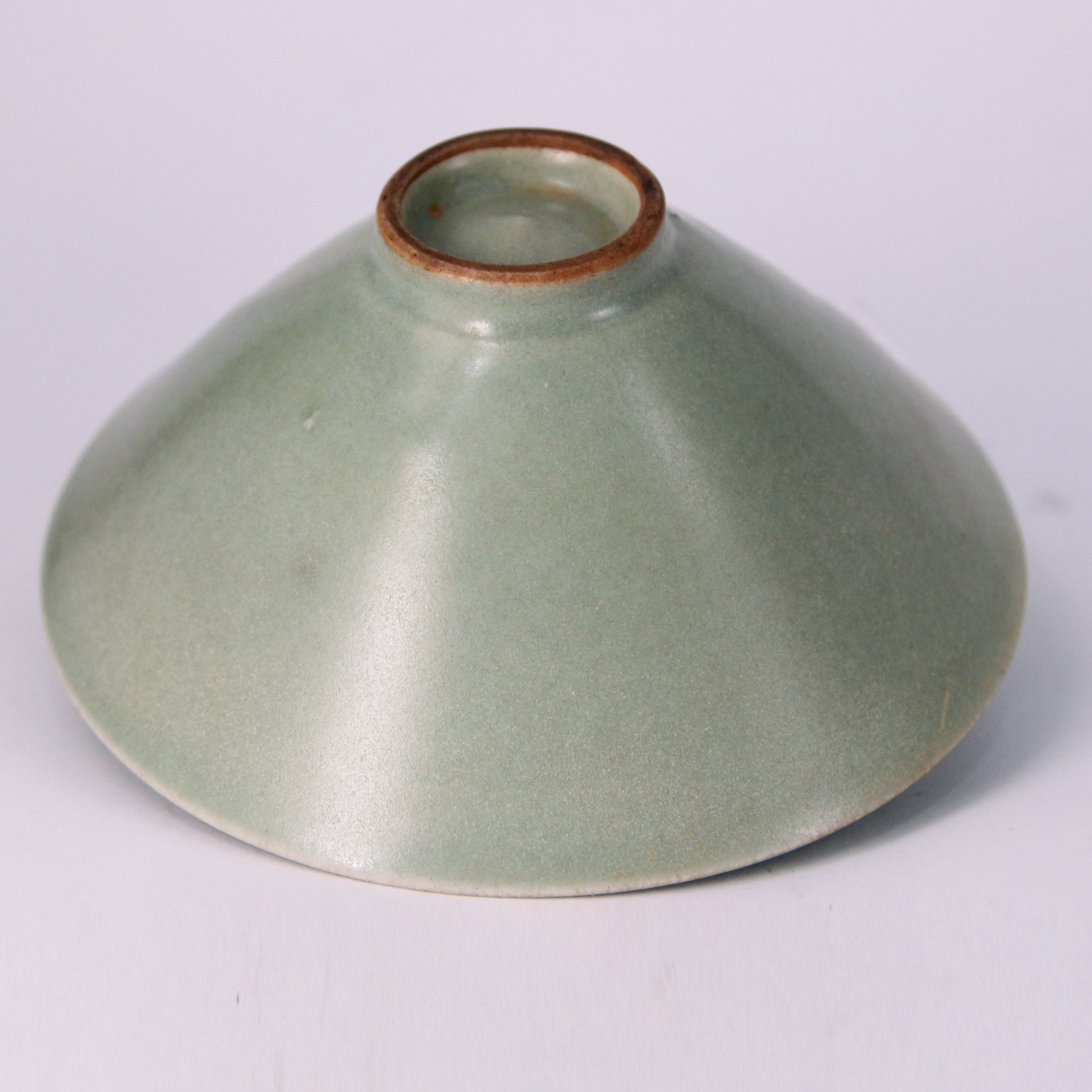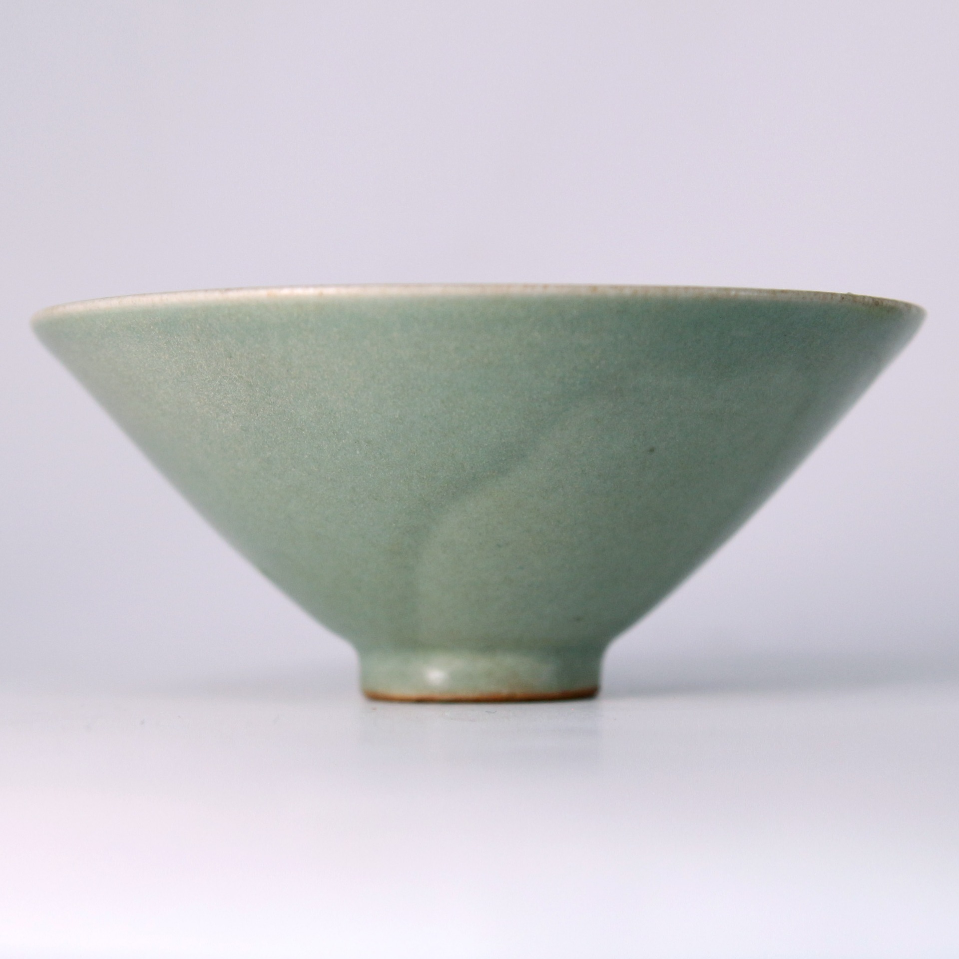 此盞為宋代龍泉窯青瓷斗笠盞,口沿外撇,弧壁斜展,形如斗笠,線條簡潔而富於張力。通體施青釉,釉色柔潤澄淨,呈現淡雅的粉青調性,釉面細膩含蓄,隱約泛出溫潤光澤。內壁以印花裝飾花卉紋樣,紋飾低調內斂,於光影流轉間若隱若現,體現宋代器物「不事雕琢而自有風致」的美學追求。