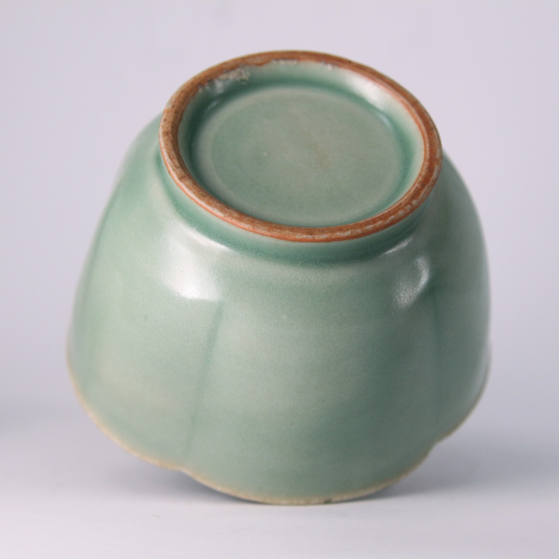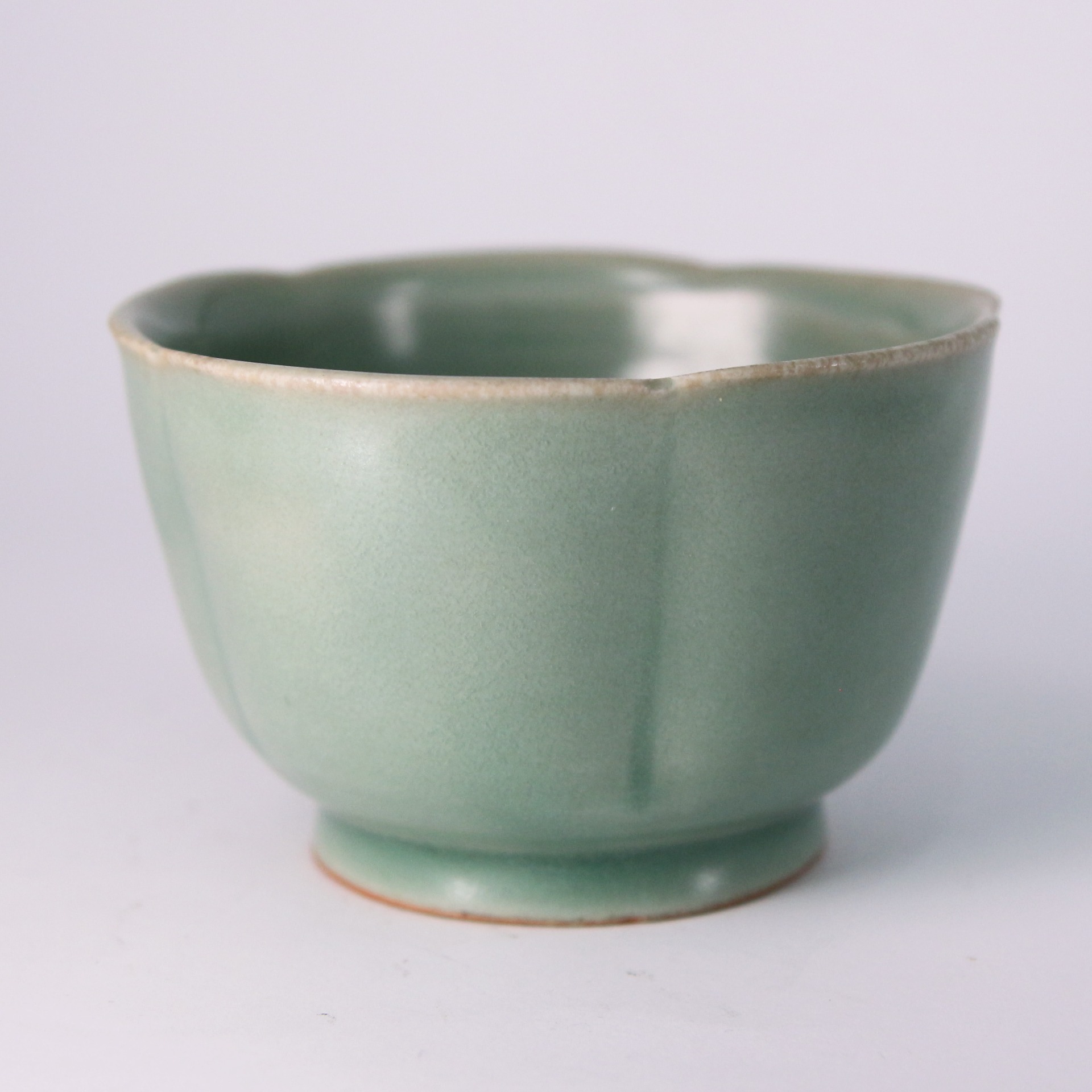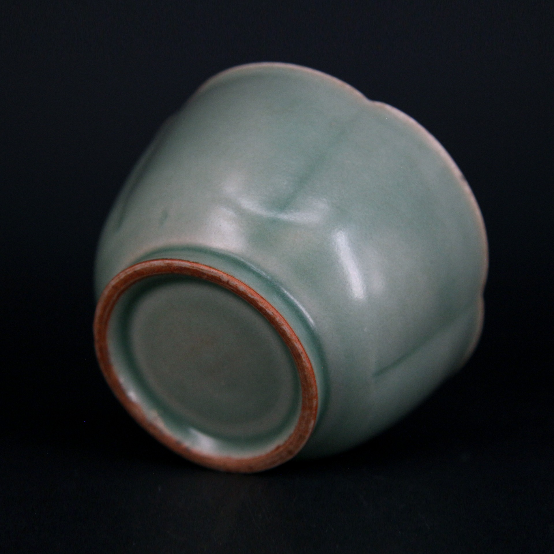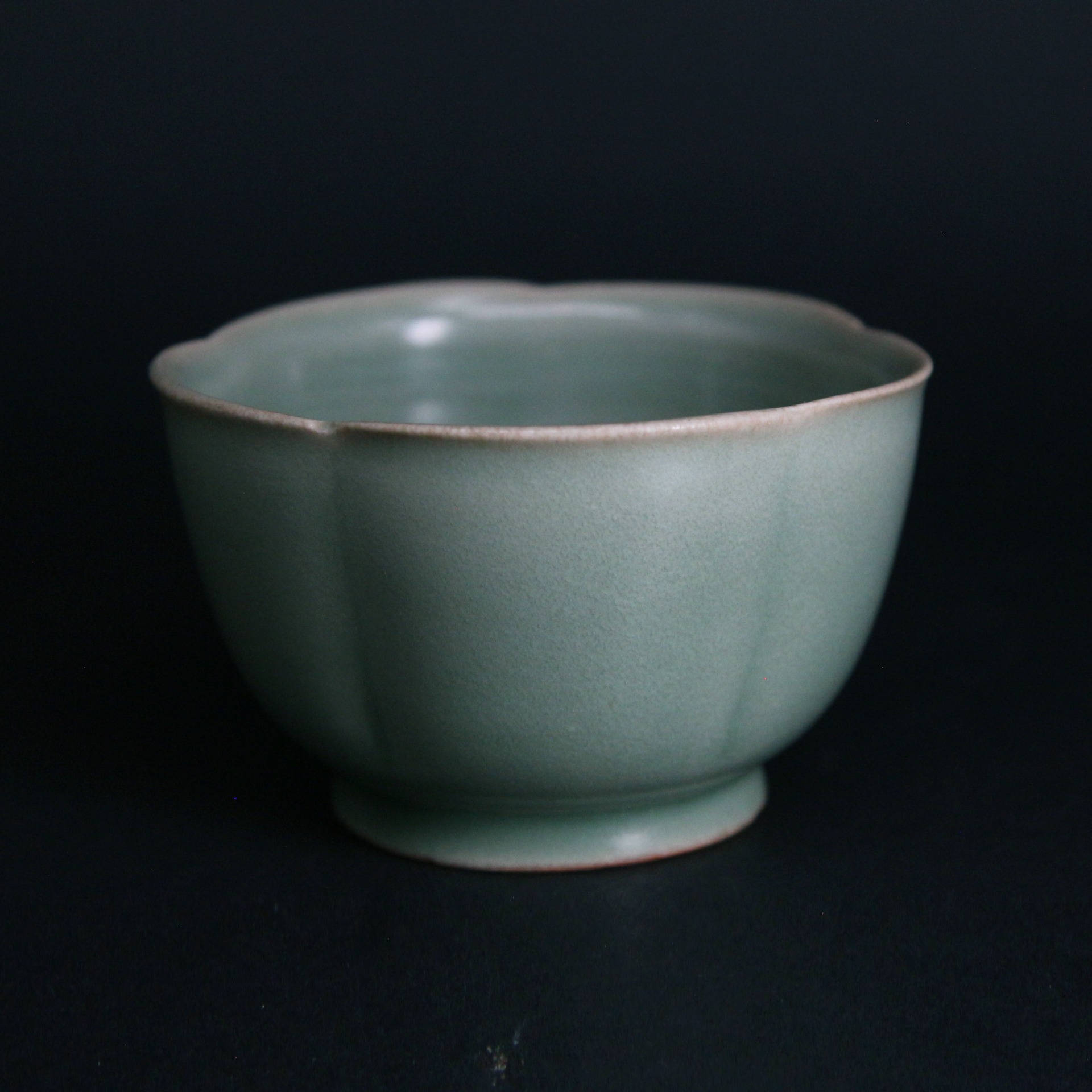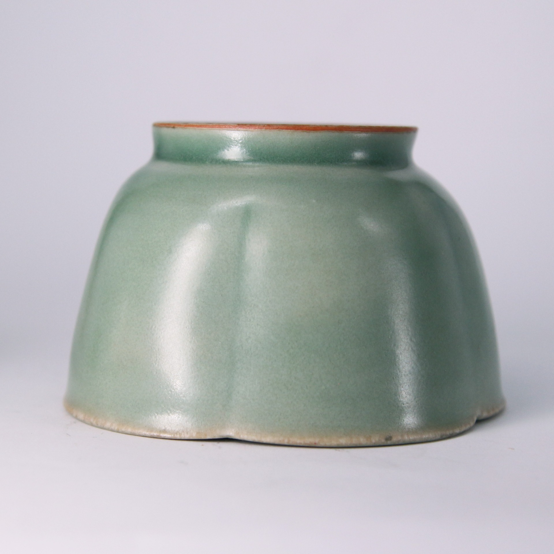 在工藝上,此缽展現了龍泉窯高超的施釉與燒造技術。器身轉折處釉層較薄,隱約透出胎體色澤,形成了層次分明的**「出筋」**美感,增加了視覺的深度。足部處理規整,釉面清澈且細碎的開片(如有)更增添了歲月留下的痕跡。這種花口缽在宋代常作為高級茶具或文房用具,不僅是工藝傑作,更是宋代精緻生活藝術的縮影。