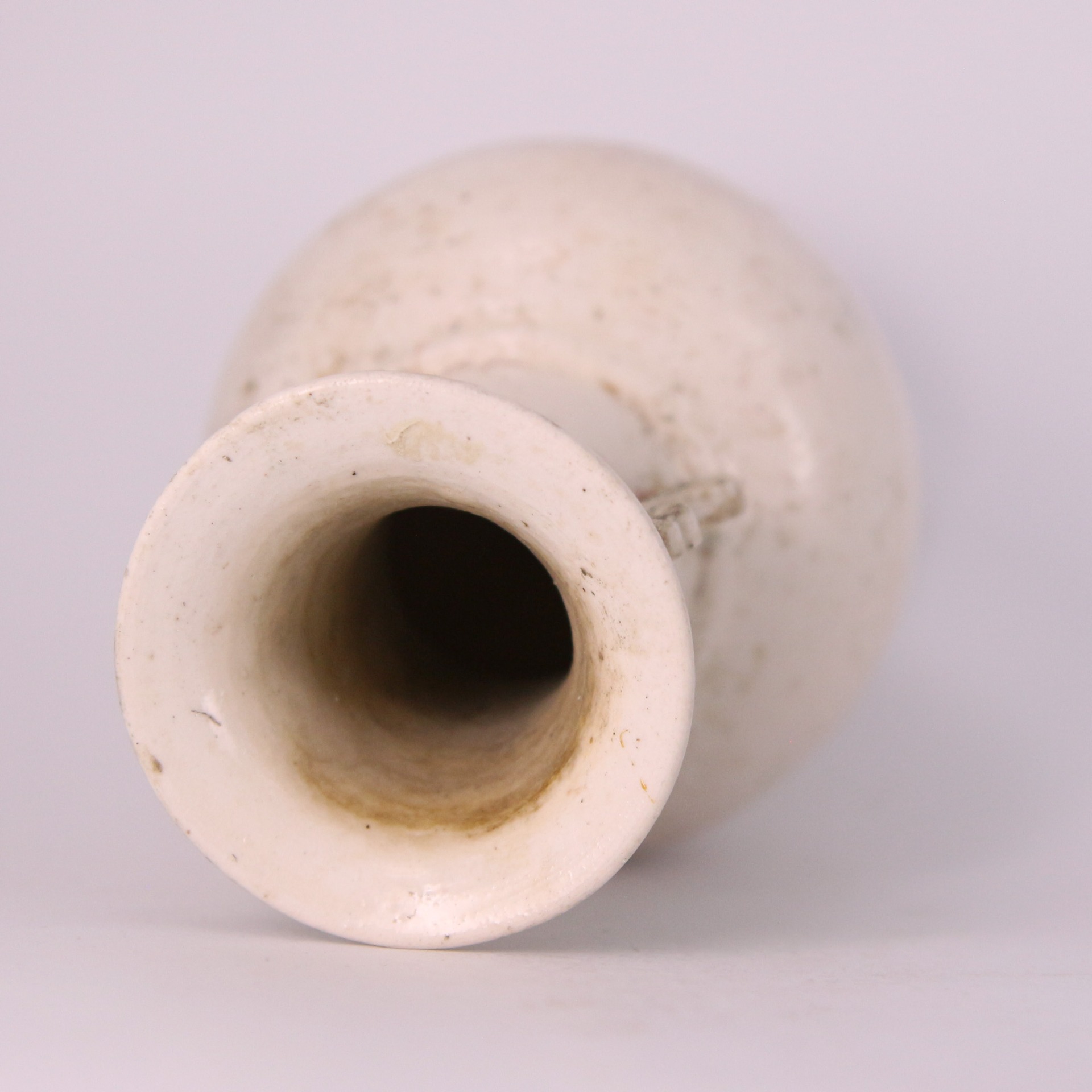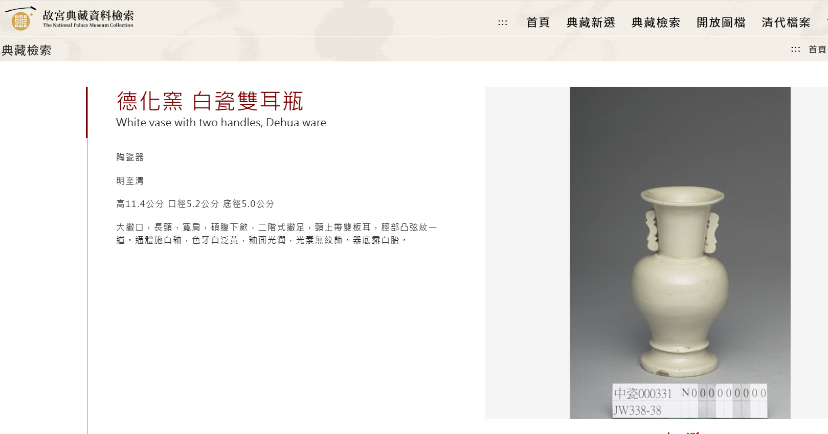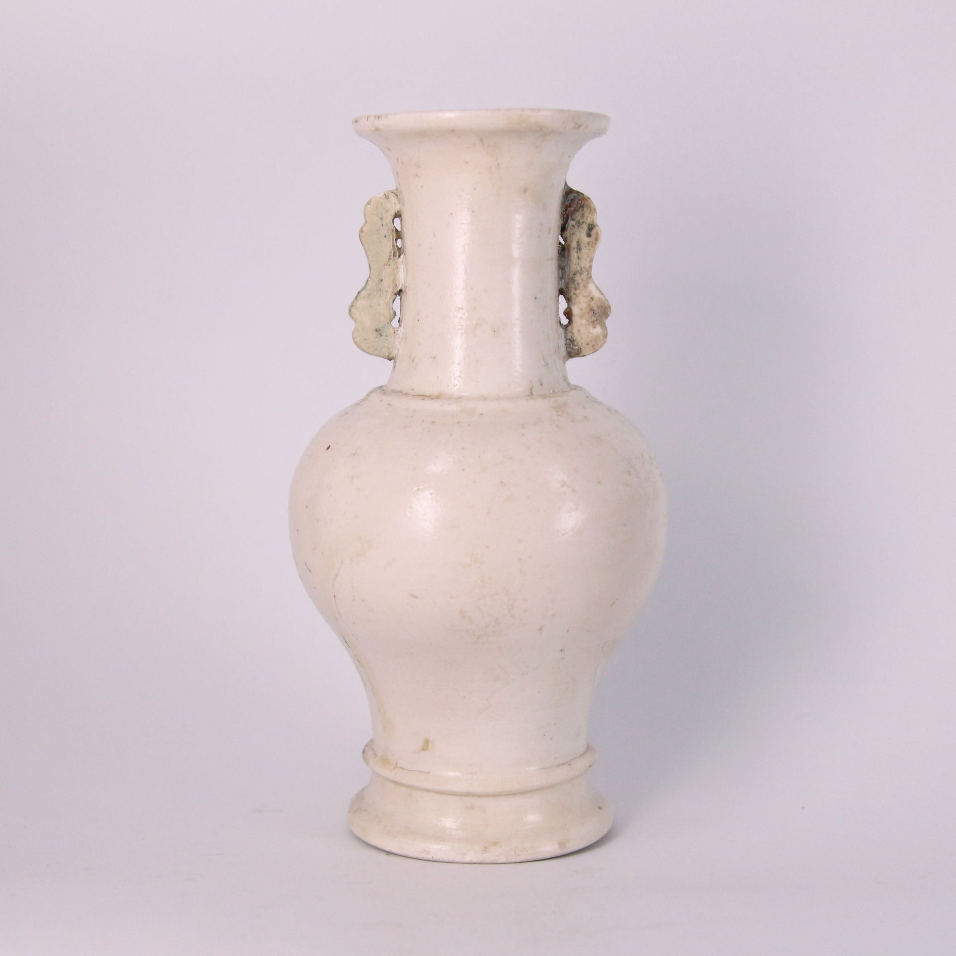 此瓶造型端莊優雅,呈現大撇口、長頸、豐肩,腹部向下漸收,底部承以二階式撇足(或稱台階狀底座)。頸部兩側飾有對稱的雙板耳(或獸耳形裝飾),不僅增添了線條的層次感,也賦予器物古樸的儀式感。器身線條流暢,脛部常帶有一道凸起的弦紋作為裝飾,整體比例協調,展現了明代德化窯精湛的拉坯與模印工藝。