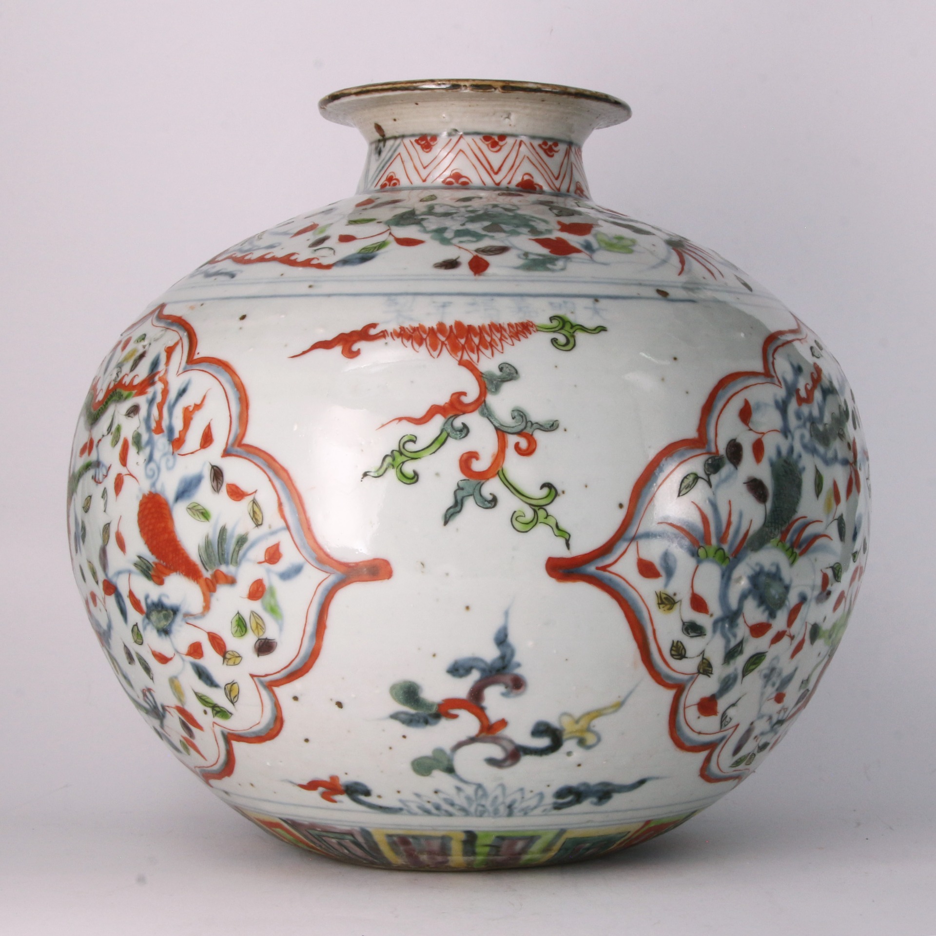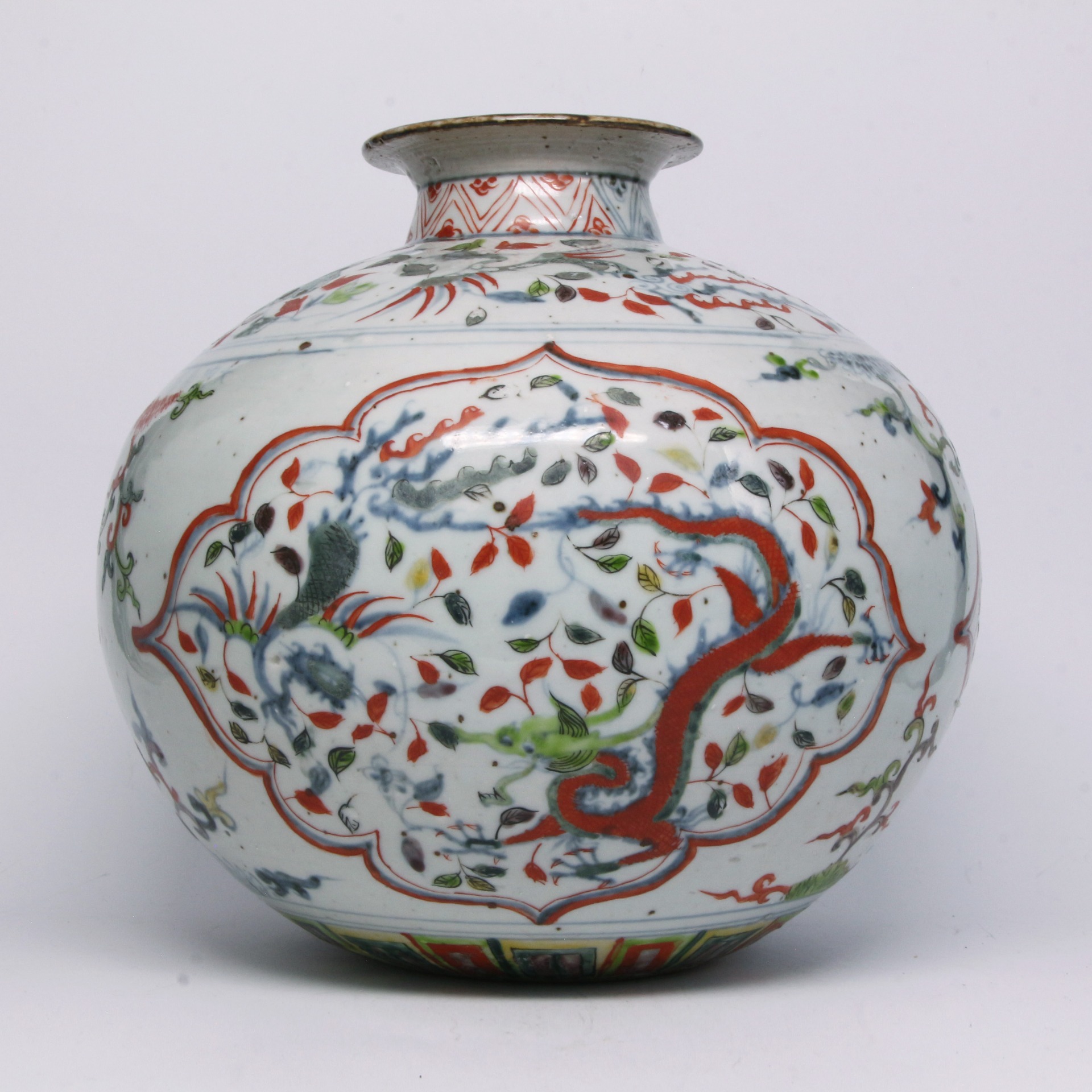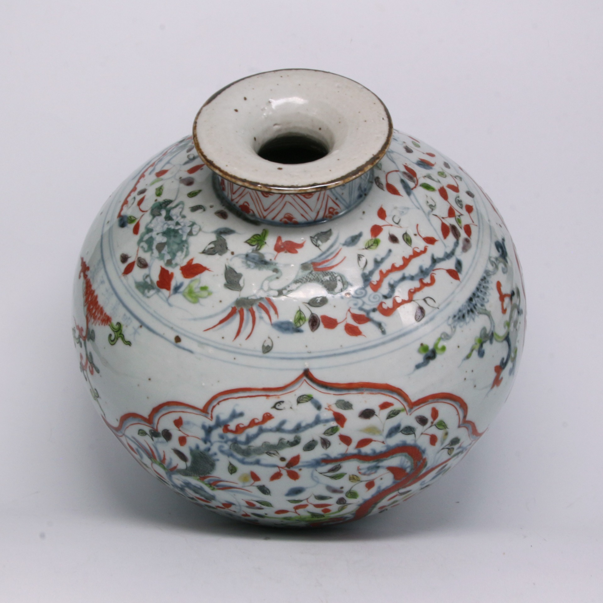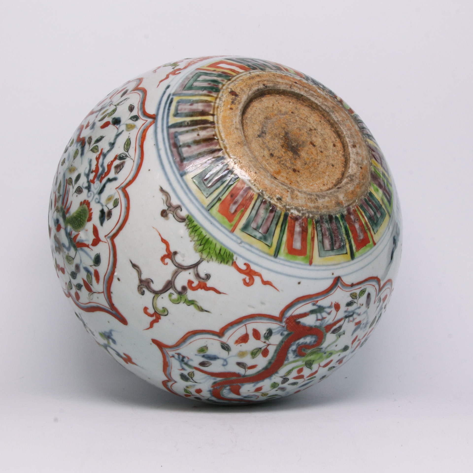 嘉靖時期的五彩瓷器以「色調純真、絢麗華貴」著稱,開啟了明代瓷器追求繁縟美感的新篇章。這件作品體現了當時盛行的青花五彩工藝,即先以高溫燒製青花部分,再於釉上施加紅、黃、綠等色彩進行二次低溫燒造。其龍紋雄健、鳳紋柔美,象徵著皇權與吉祥的結合。此類西瓜罐在當時多用於盛放宮廷物資或作為居室陳設,既是實用器皿,更是反映大明嘉靖朝審美取向與精湛製瓷工藝的藝術代表作。