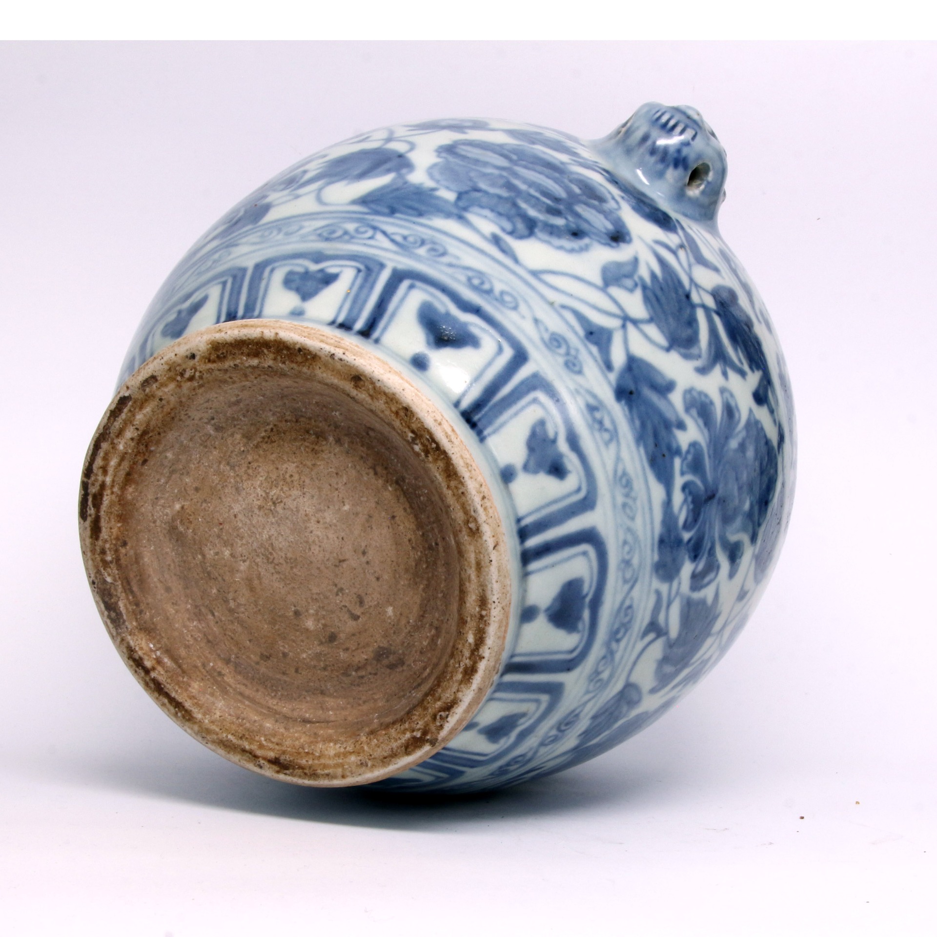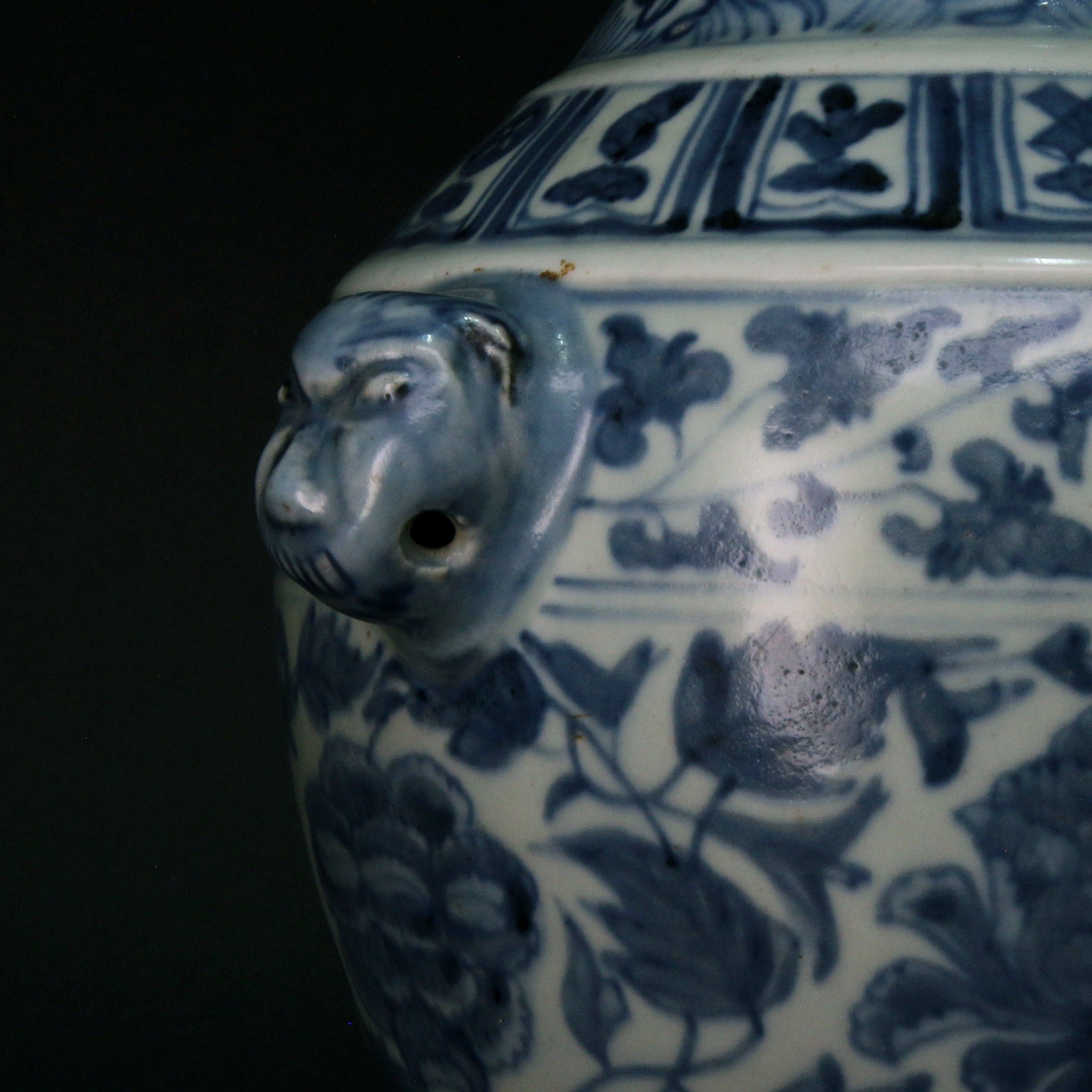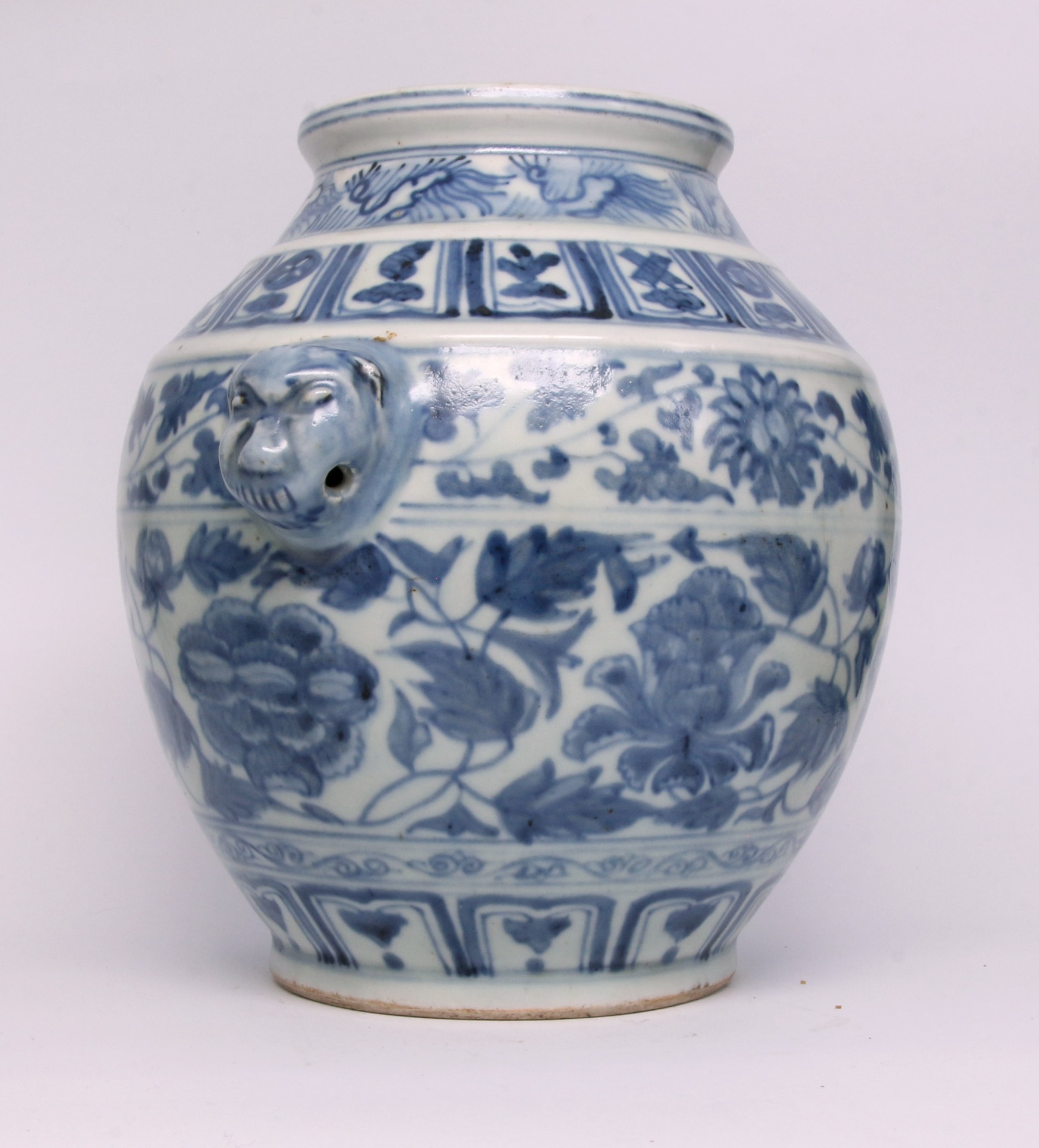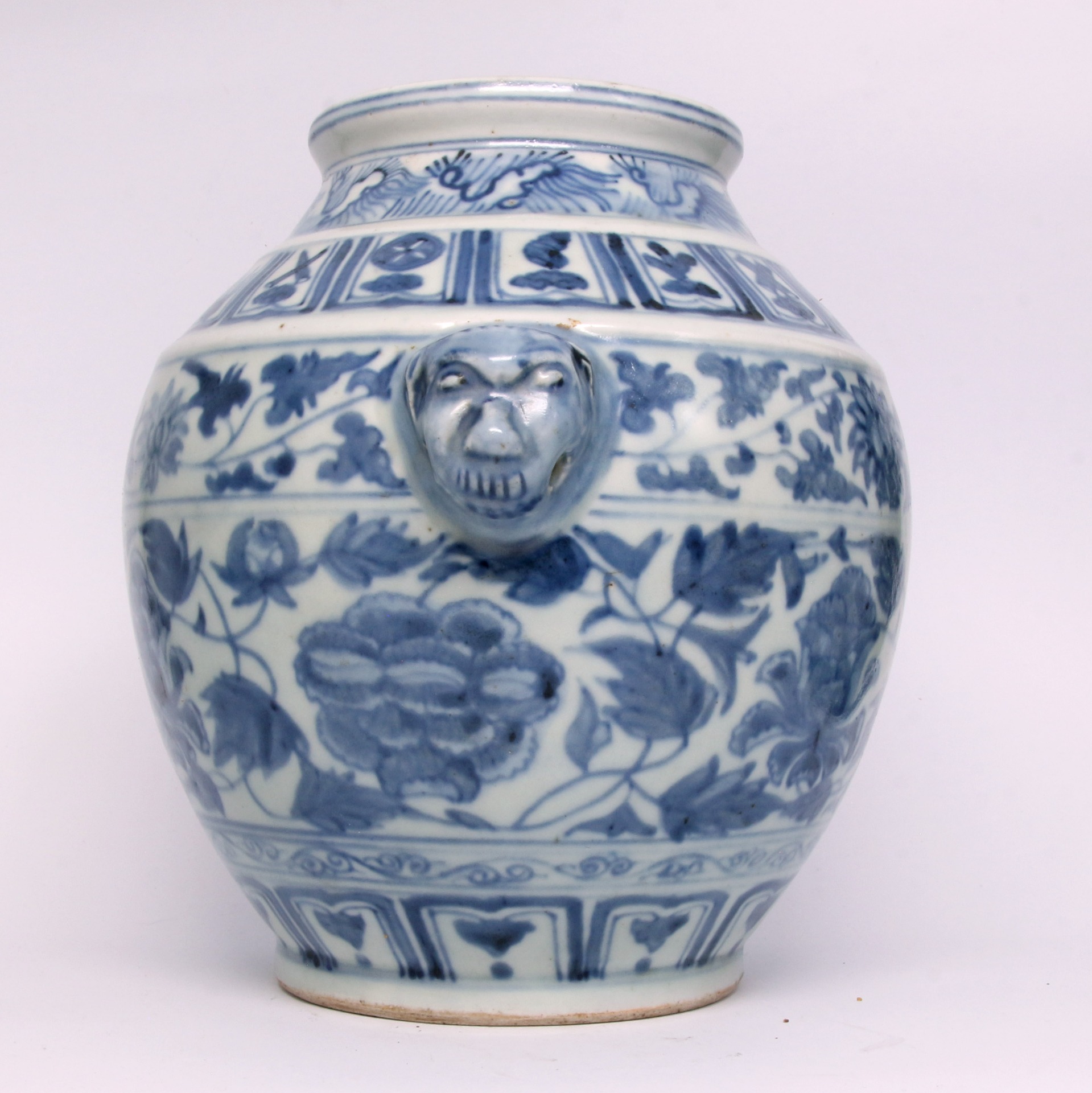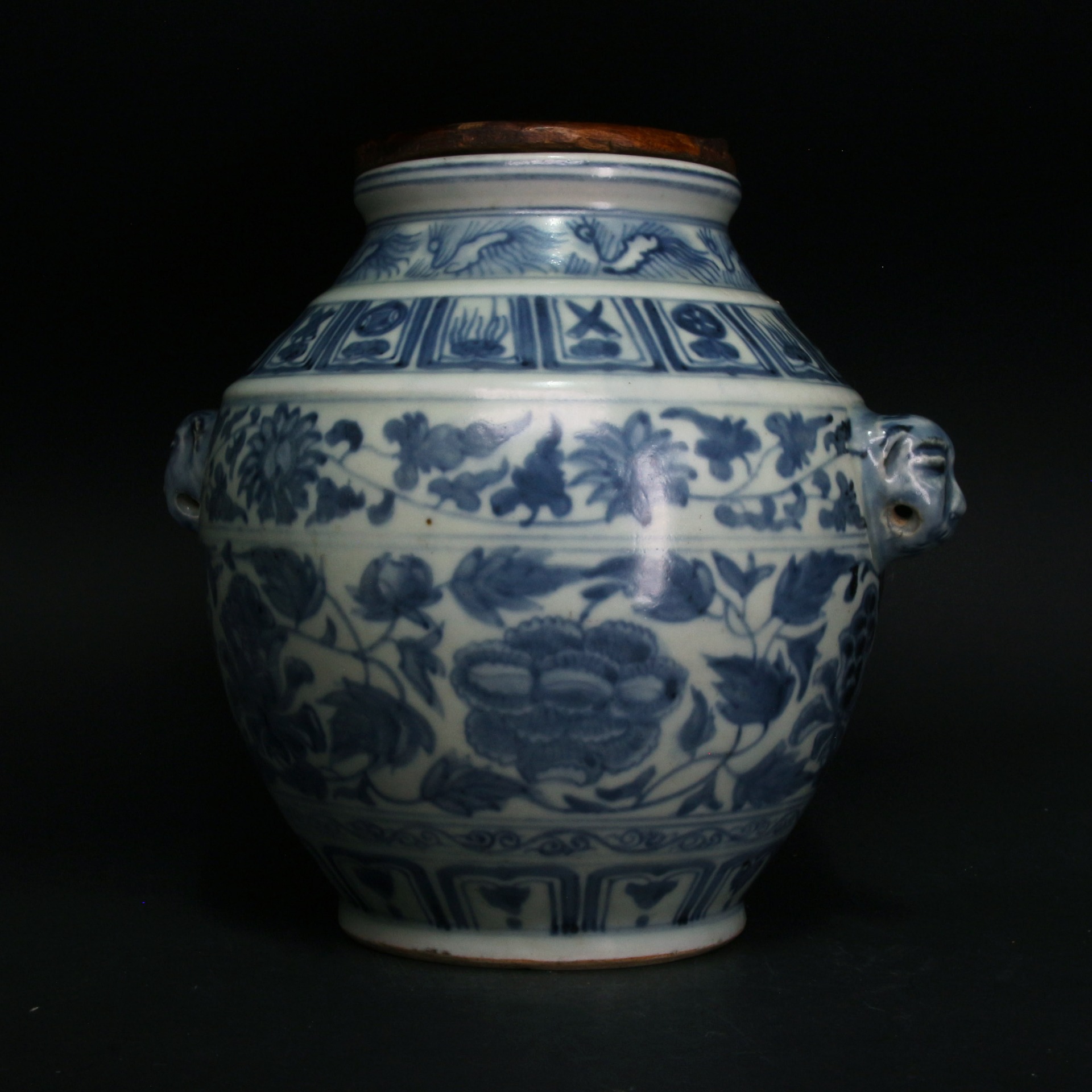 此尊為明代青花瓷之典型器物。器型端莊穩重,收頸、鼓腹,肩部兩側裝飾對稱的獸首銜耳,增添了古樸威嚴的藝術氣息。通體以青花繪製多層裝飾帶:頸部與肩部分別繪有鳳鳥紋及吉祥八寶紋(法輪、法螺、寶傘、白蓋、蓮花、寶瓶、金魚、盤長),腹部主體則滿繪纏枝蓮紋。其青花發色濃郁沉穩,線條流暢,構圖層次分明且不顯擁促,展現了明代瓷器裝飾工藝中對宗教元素與自然紋樣的高度融合。