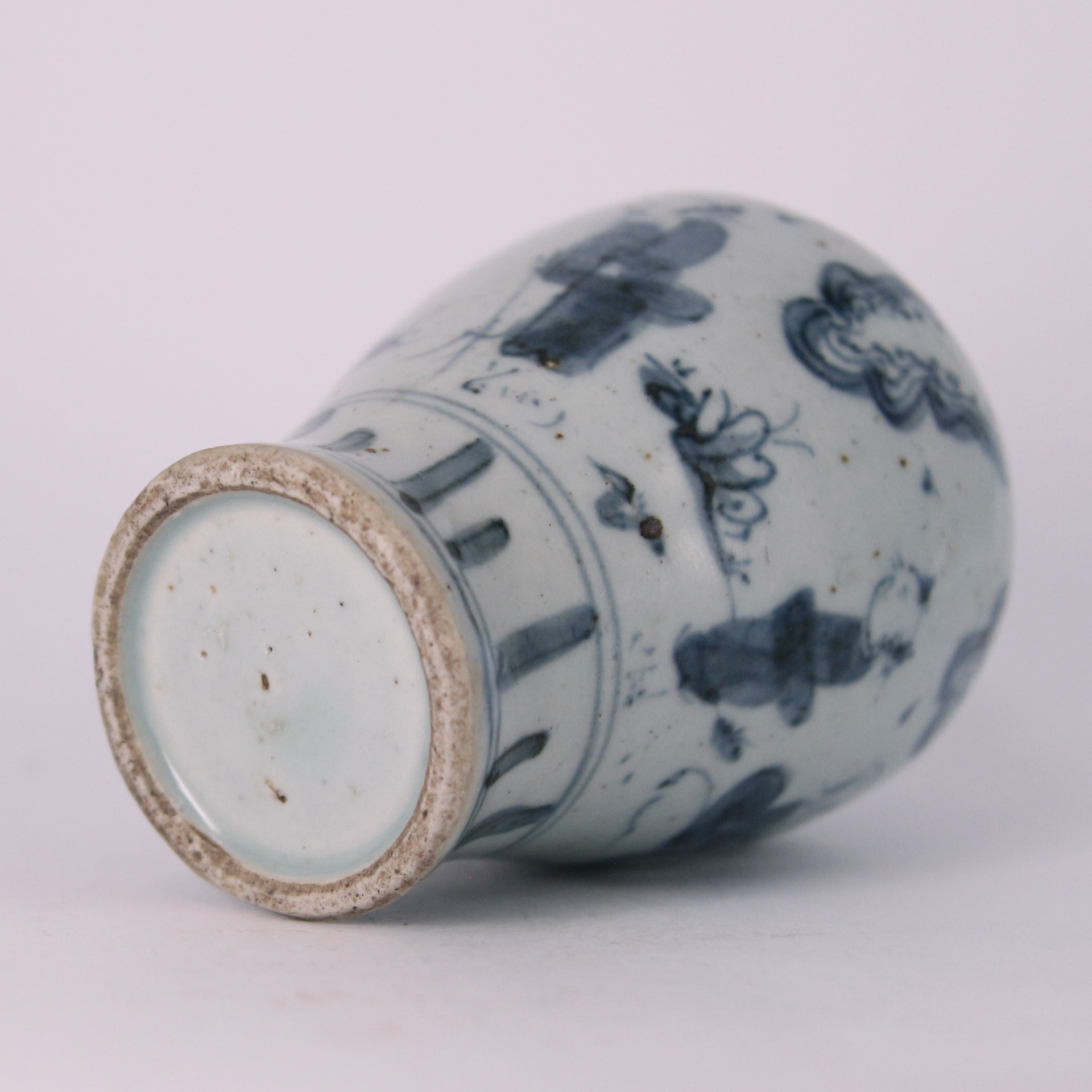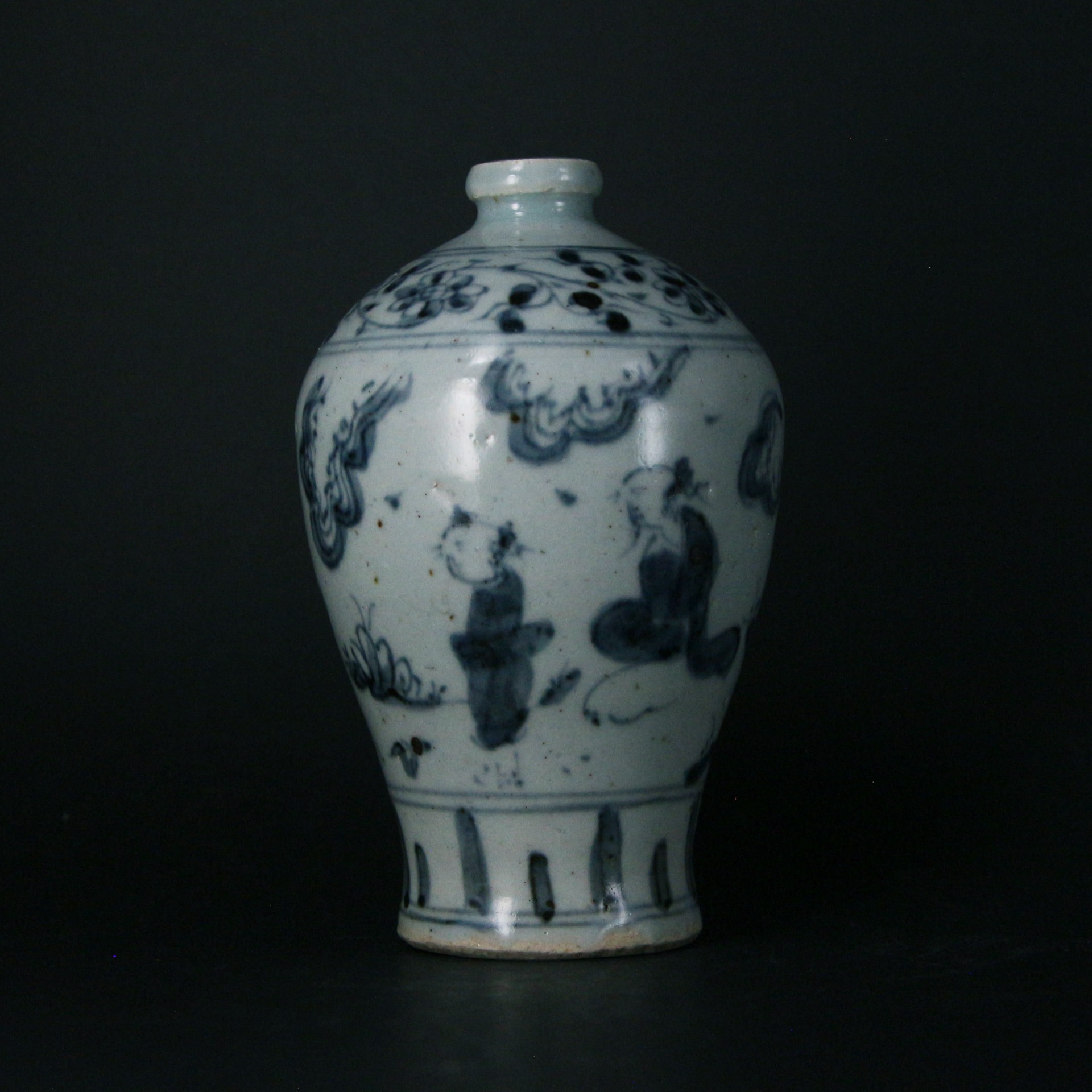 此件為明代青花梅瓶,器形修長挺拔,豐肩束腰,下承圈足,比例勻稱,為梅瓶經典式樣。通體以青花繪高仕人物圖,人物衣紋以寫意筆法勾勒,線條簡練而富動勢,間以雲氣、山石相襯,畫面疏朗有致。青花發色呈灰藍調,層次自然,反映明代中期青花以水墨意趣入瓷的藝術風格。