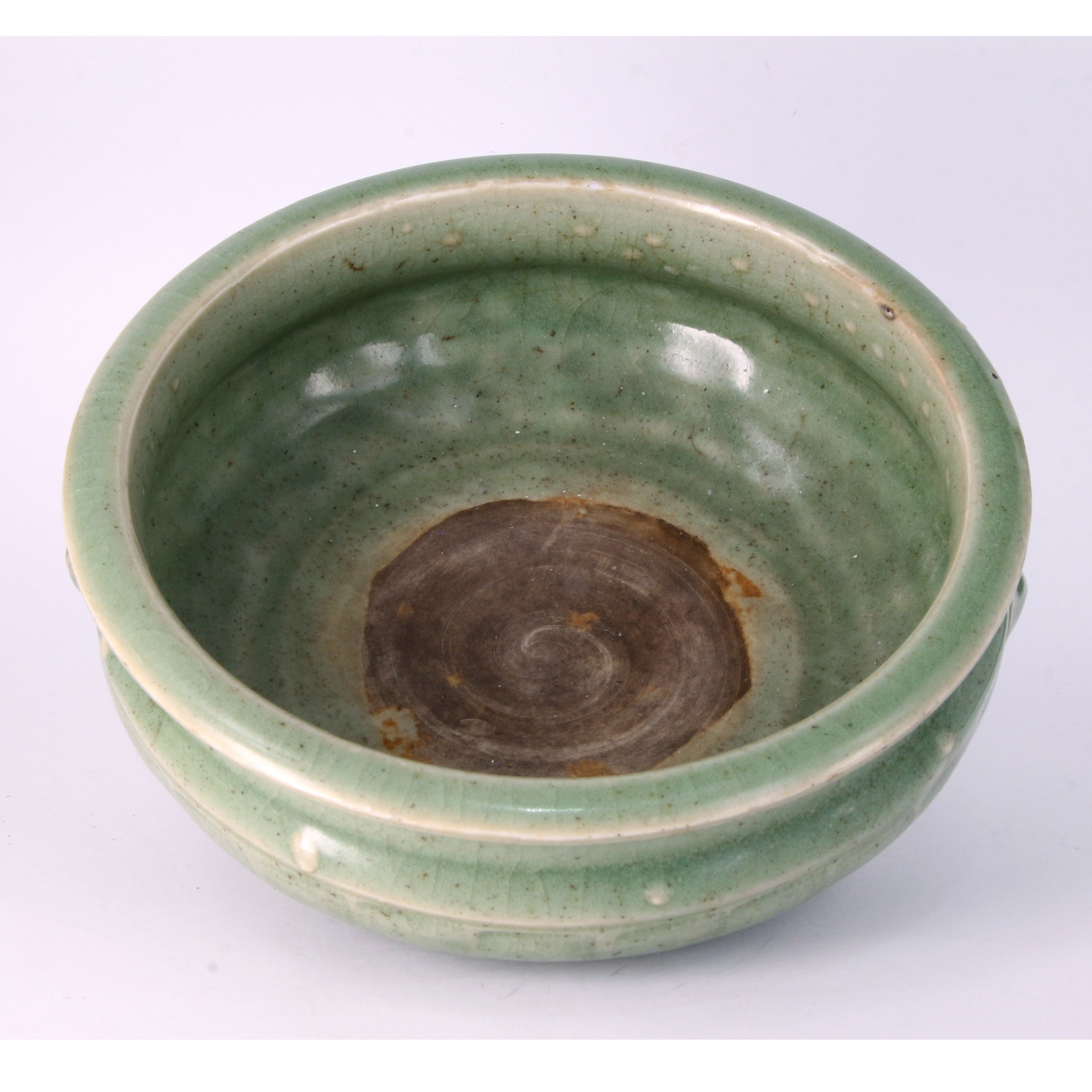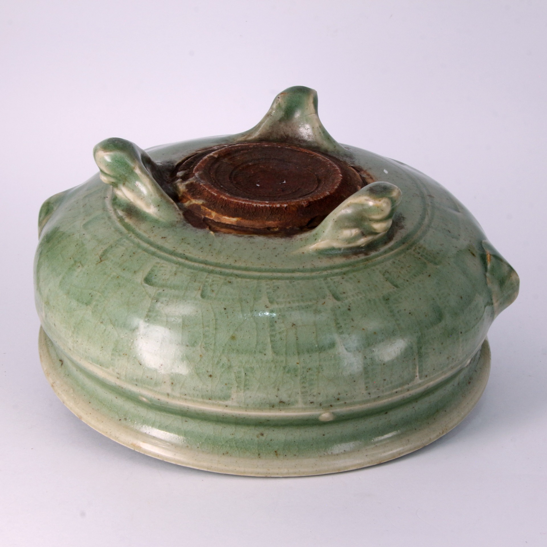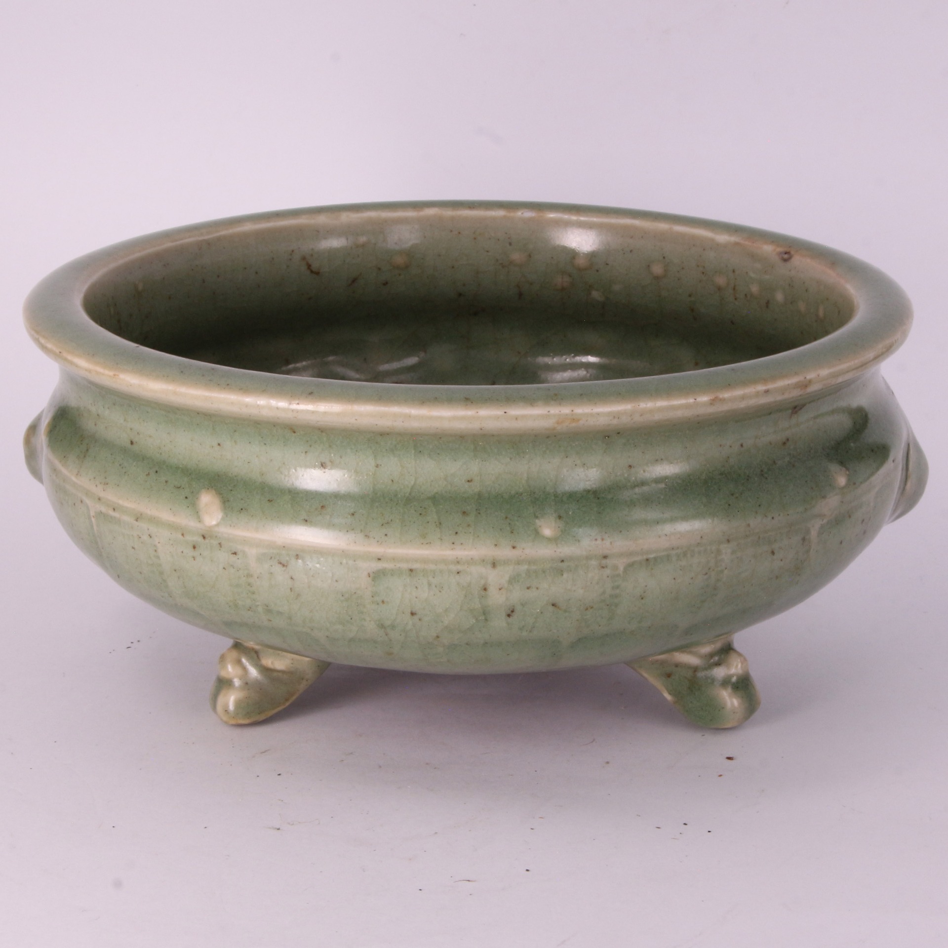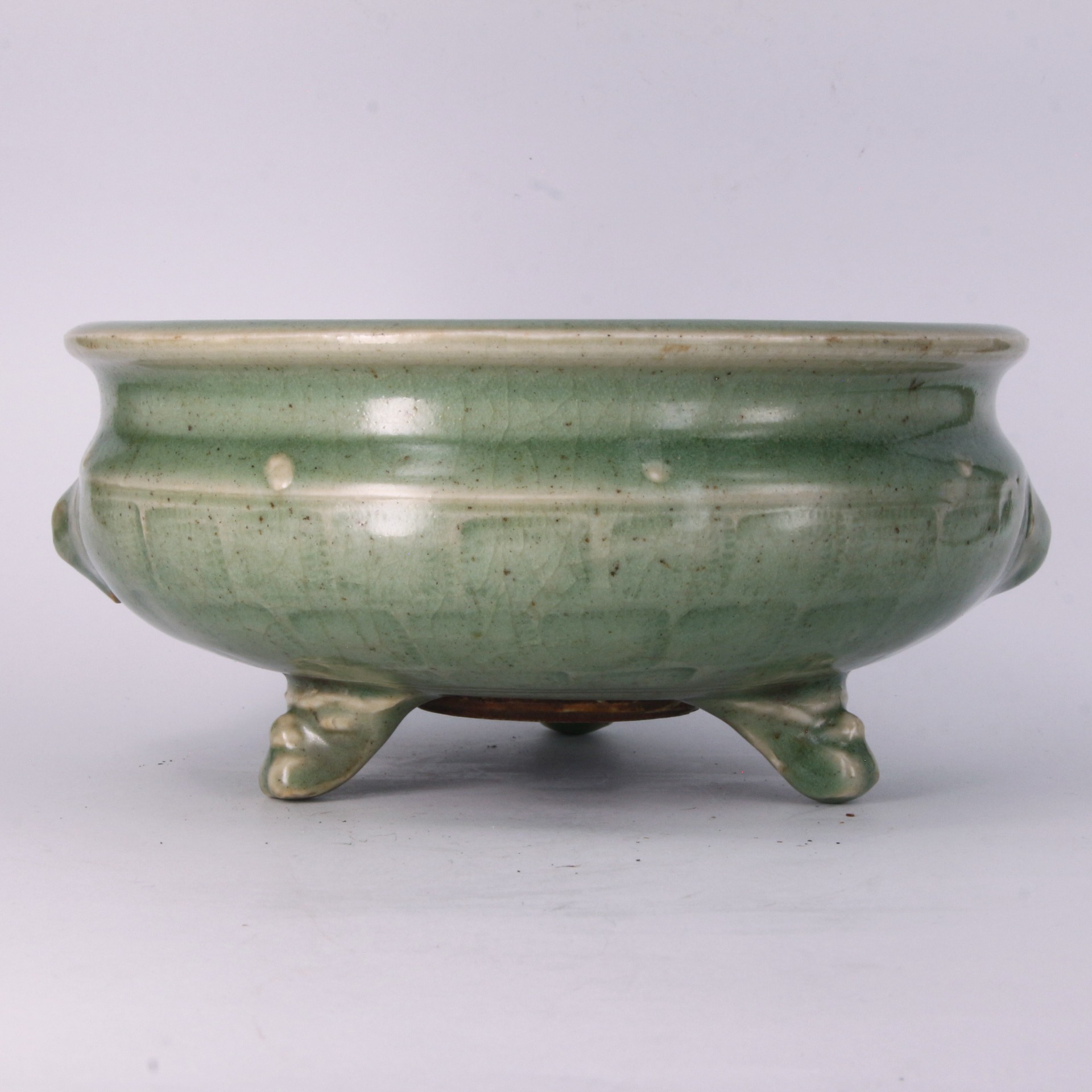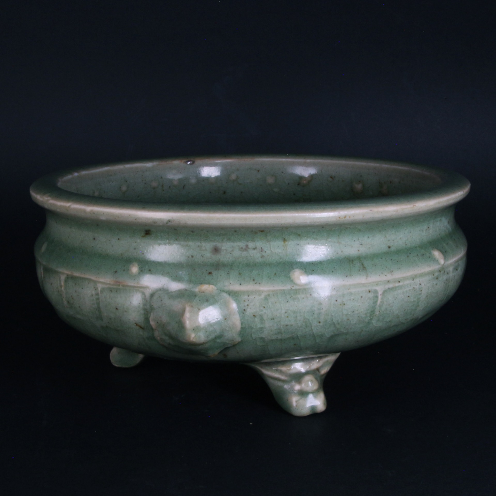 本品為明代龍泉窯出品,器型飽滿敦實,呈斂口、鼓腹狀,整體線條流暢且顯得古樸莊重。器身肩部裝飾獅首(獸面)銜環,刻畫細緻,為器物增添了一份威儀與立體感。腹部外壁飾以經典的「鼓釘紋」(又稱鋪首釘紋),點綴於弦紋之間,排列規整,具有極強的節奏感與裝飾美。底部承以三枚獸足,有力支撐起厚重的器身,保持了整體的視覺平衡。整器施以龍泉窯標誌性的青釉,釉層肥厚且瑩潤,色澤深邃而內斂,釉面呈現自然細膩的開片,與胎骨結合緊密,彰顯了明代官民窯系在瓷器修胎與燒製上的高超水準。