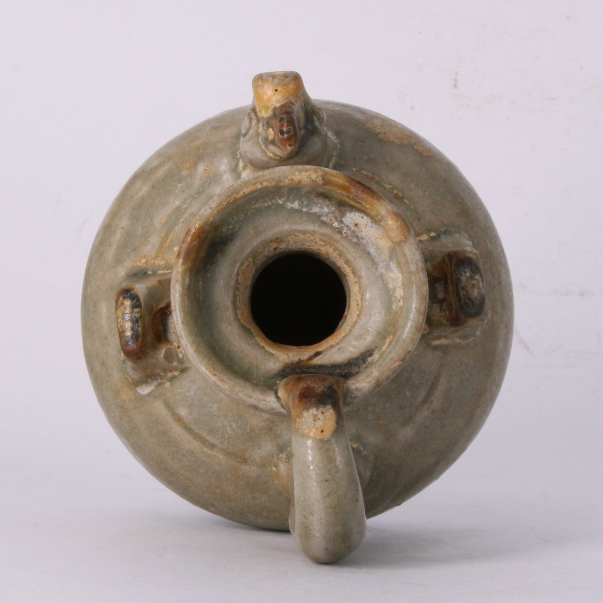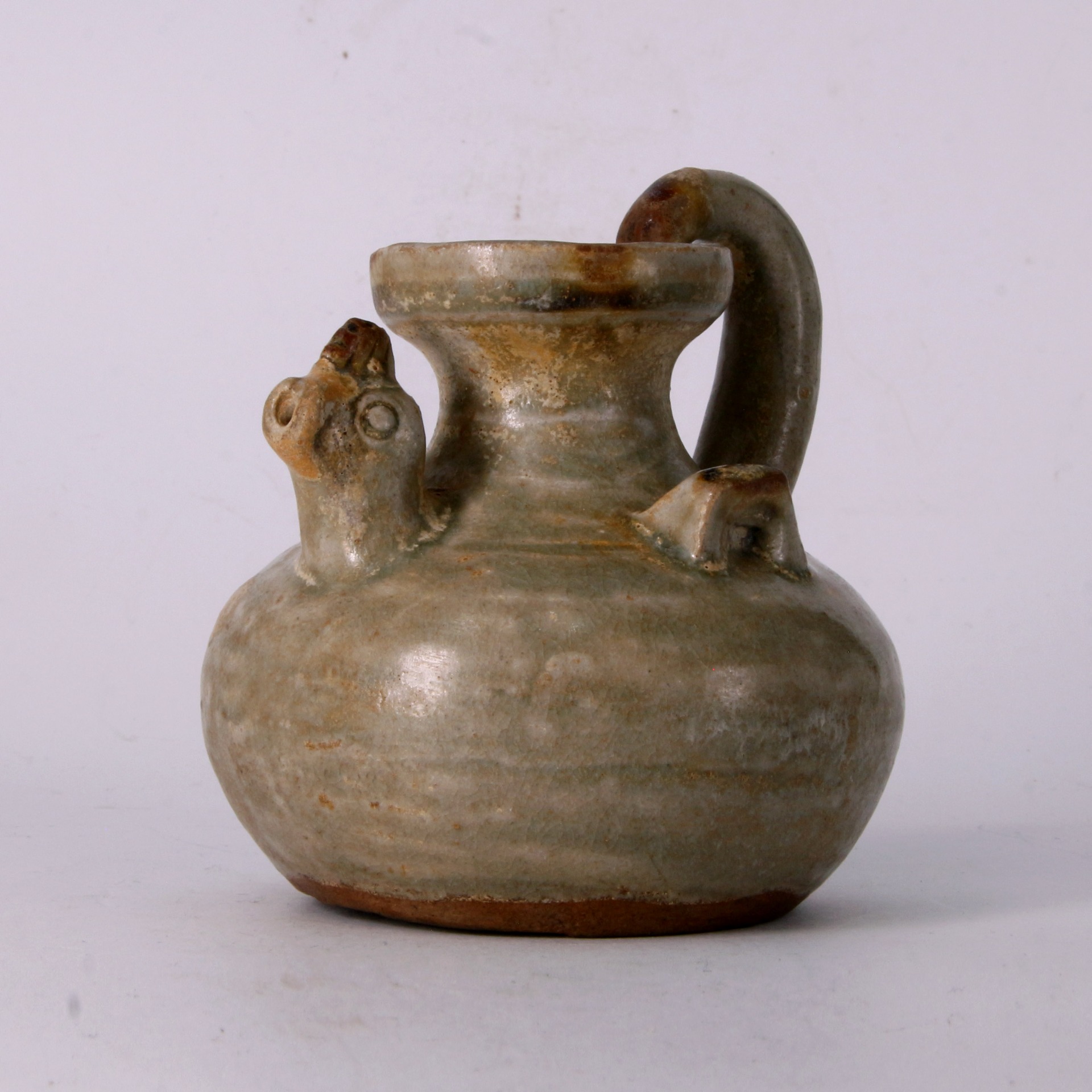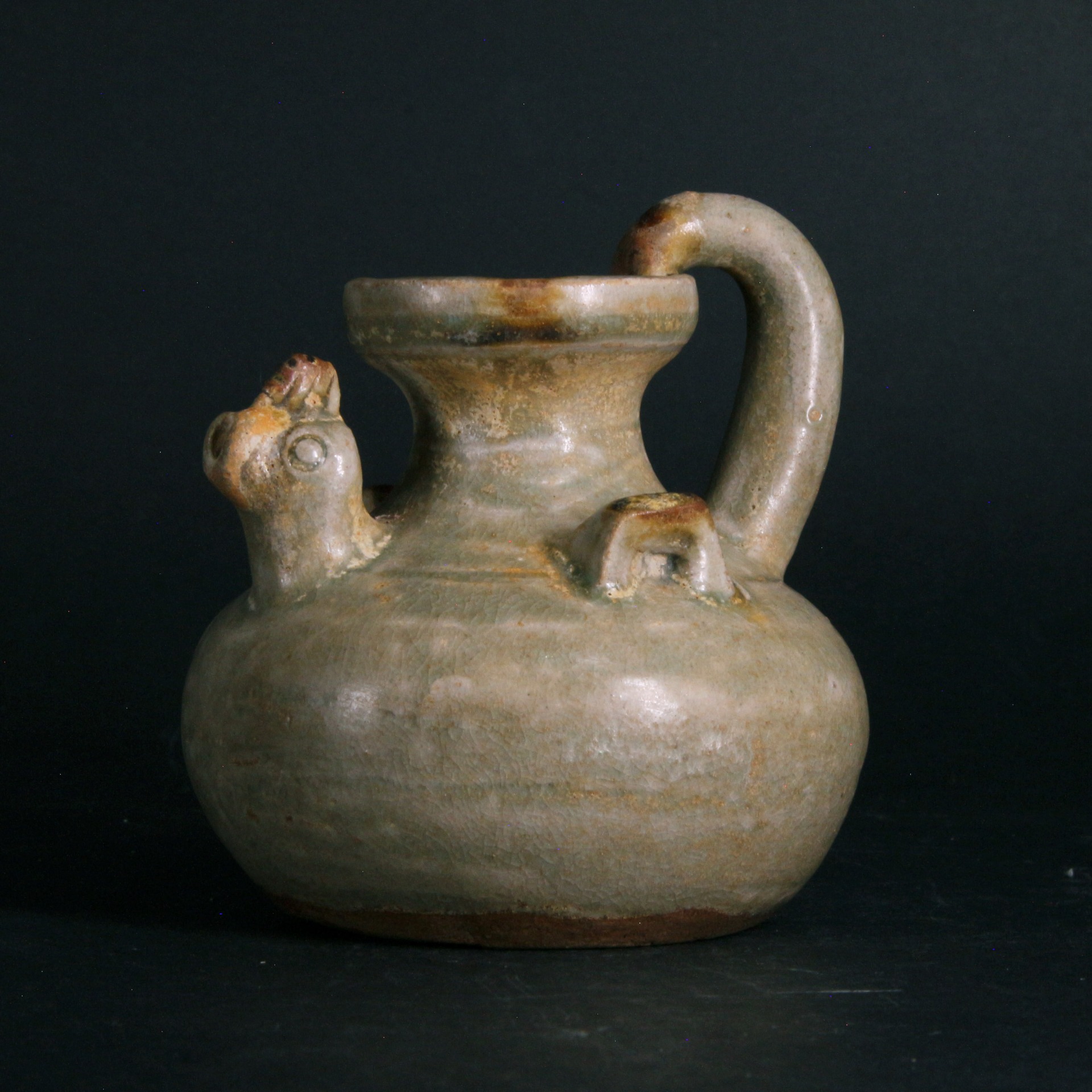 「雞首壺」是六朝青瓷中最具代表性的器類,因「雞」與「吉」諧音,寓意吉祥安寧。此壺體積精巧,應為文房用具或生活中的盛放小器。早期的小雞首多為裝飾性的「盲流」,即雞嘴不通壺腹,反映了從裝飾性過渡到實用注水功能的演變過程。其簡練的線條與溫潤的釉色,生動展現了晉代文人推崇的清淡自然與崇尚古樸的精神內涵,是研究早期越窯演變的重要實物。