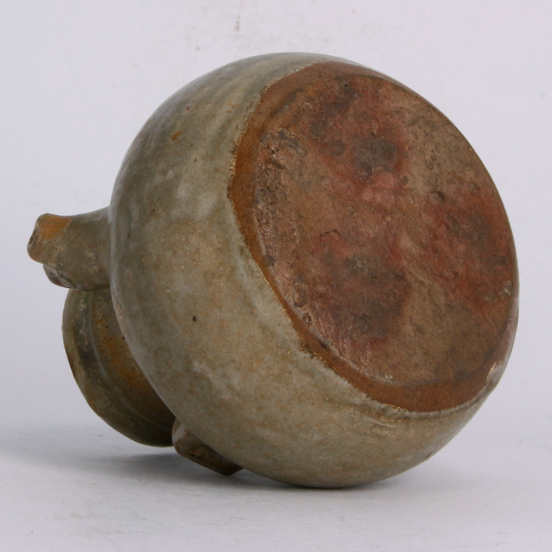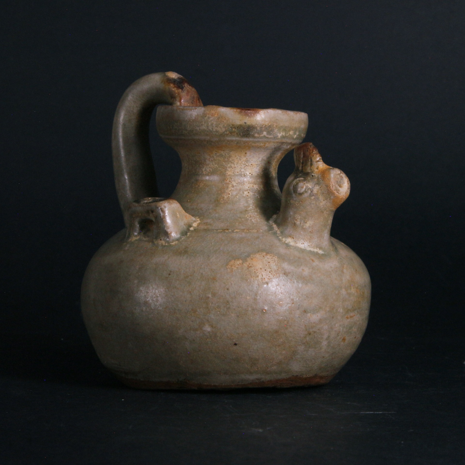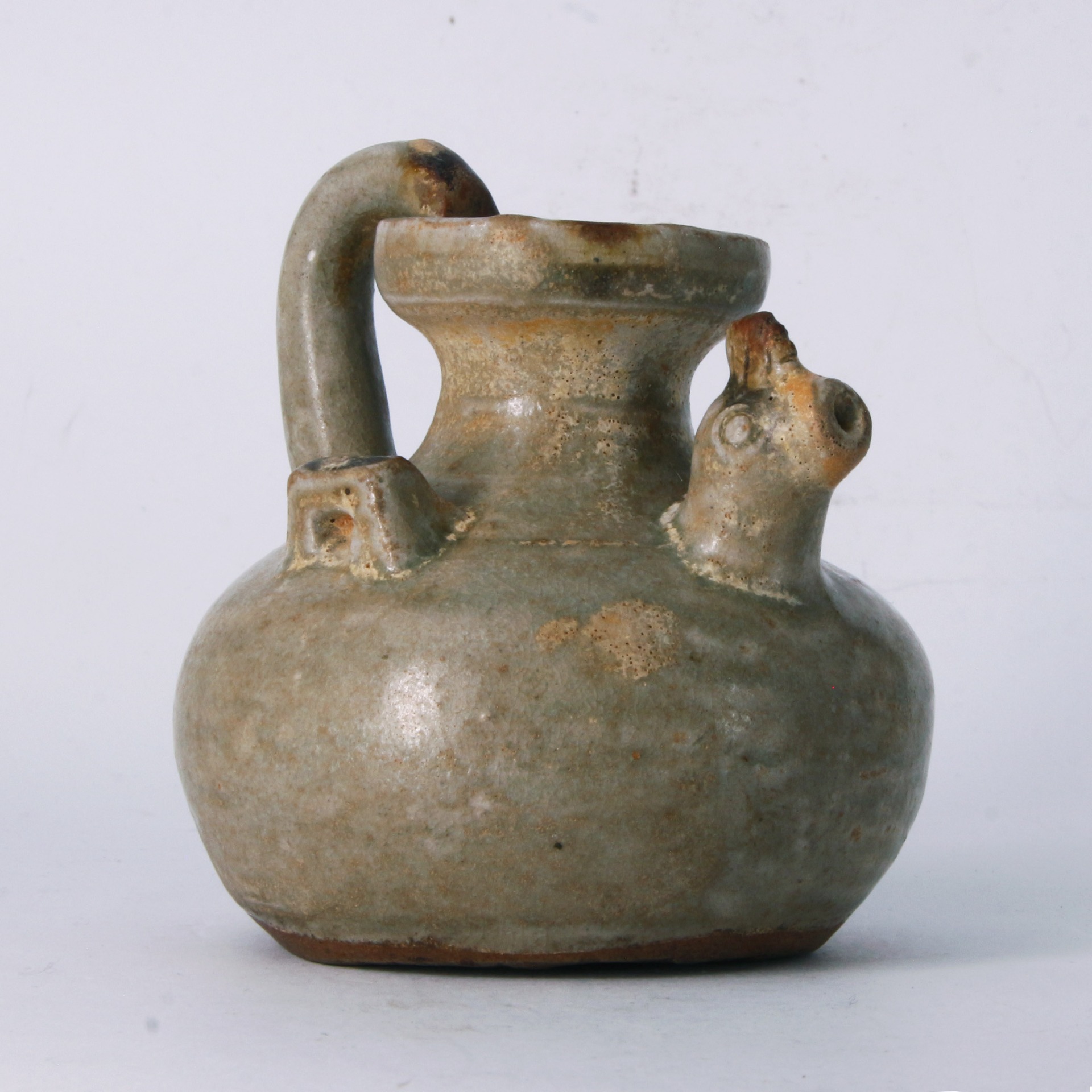 「雞首壺」是六朝青瓷中最具代表性的器類,因「雞」與「吉」諧音,寓意吉祥安寧。此壺體積精巧,應為文房用具或生活中的盛放小器。早期的小雞首多為裝飾性的「盲流」,即雞嘴不通壺腹,反映了從裝飾性過渡到實用注水功能的演變過程。其簡練的線條與溫潤的釉色,生動展現了晉代文人推崇的清淡自然與崇尚古樸的精神內涵,是研究早期越窯演變的重要實物。