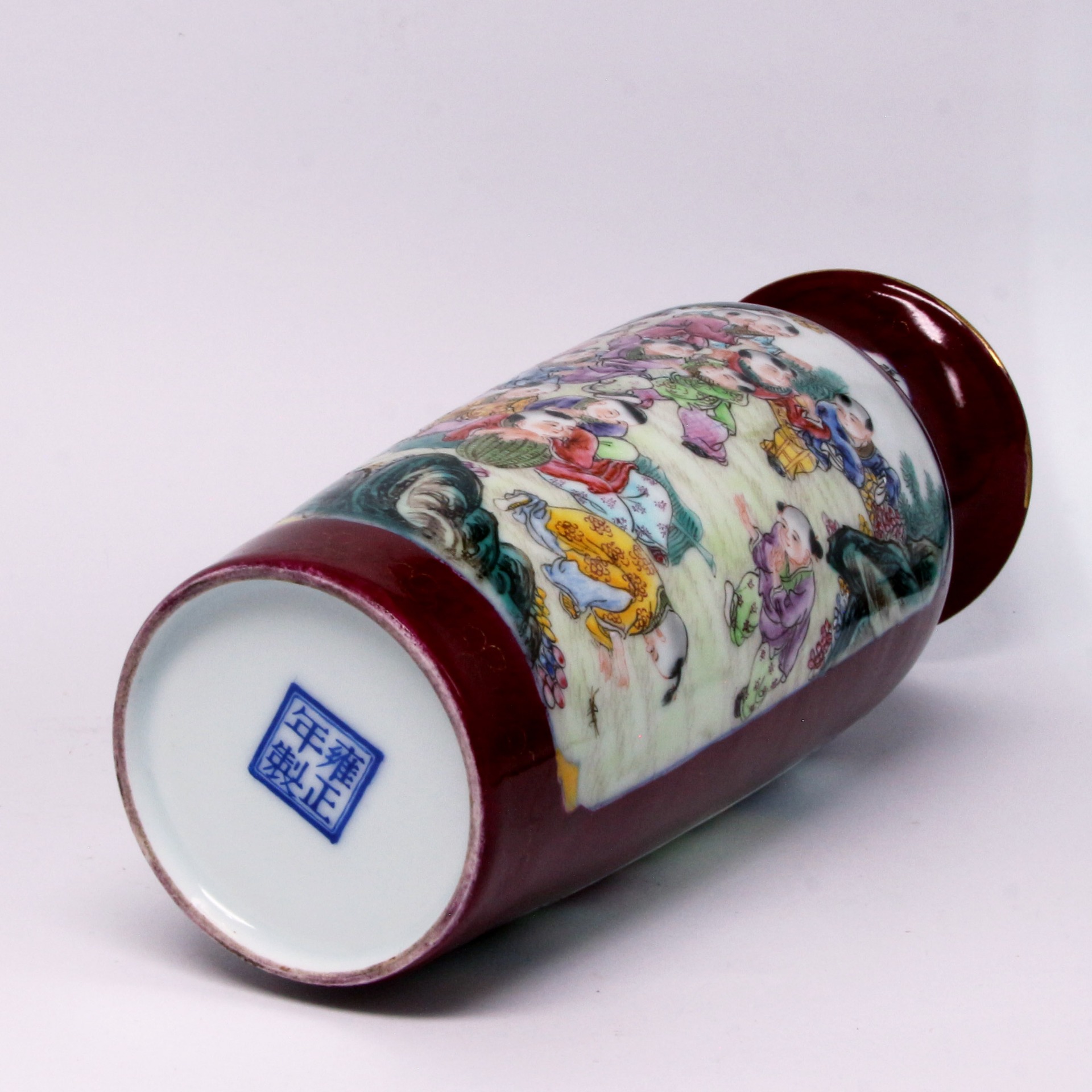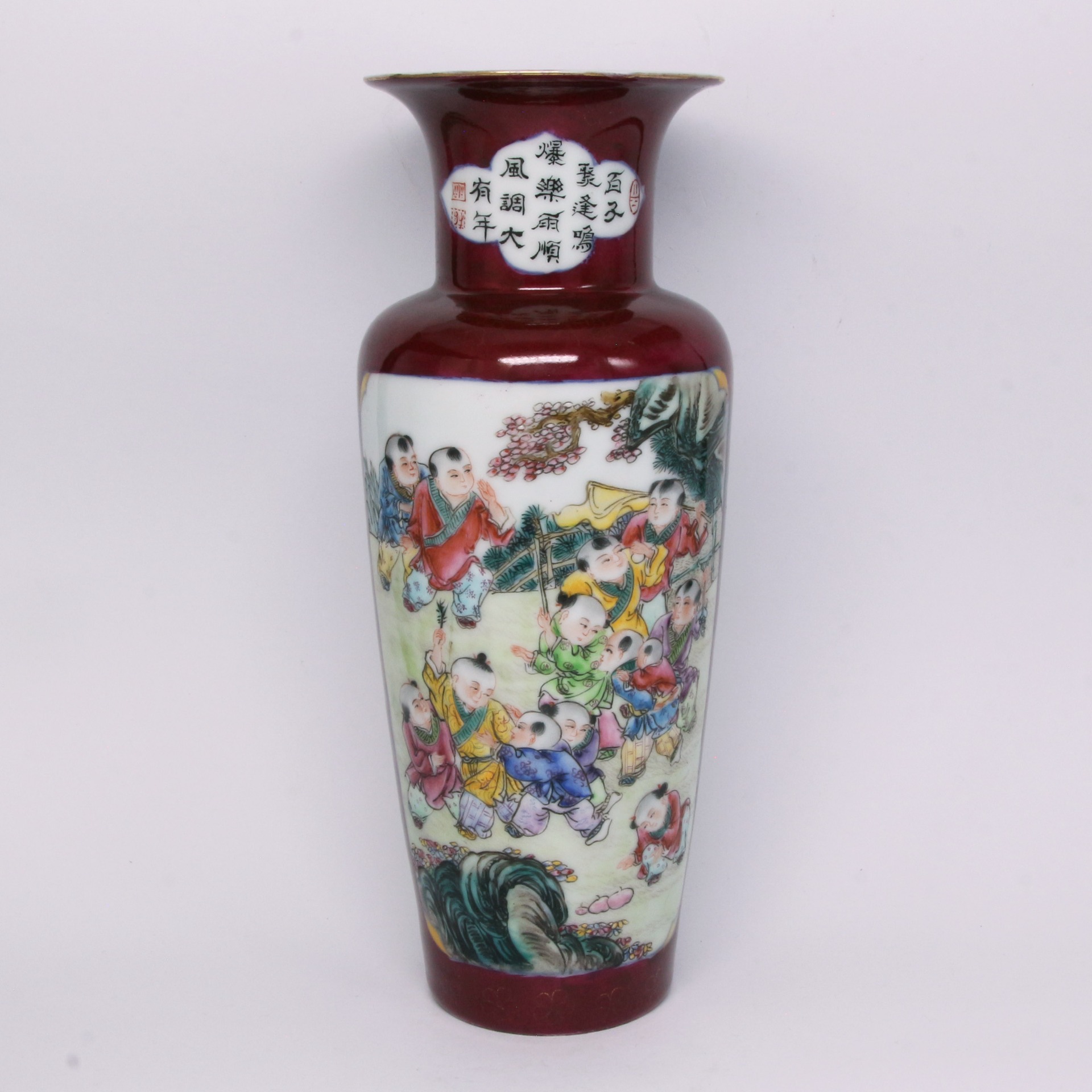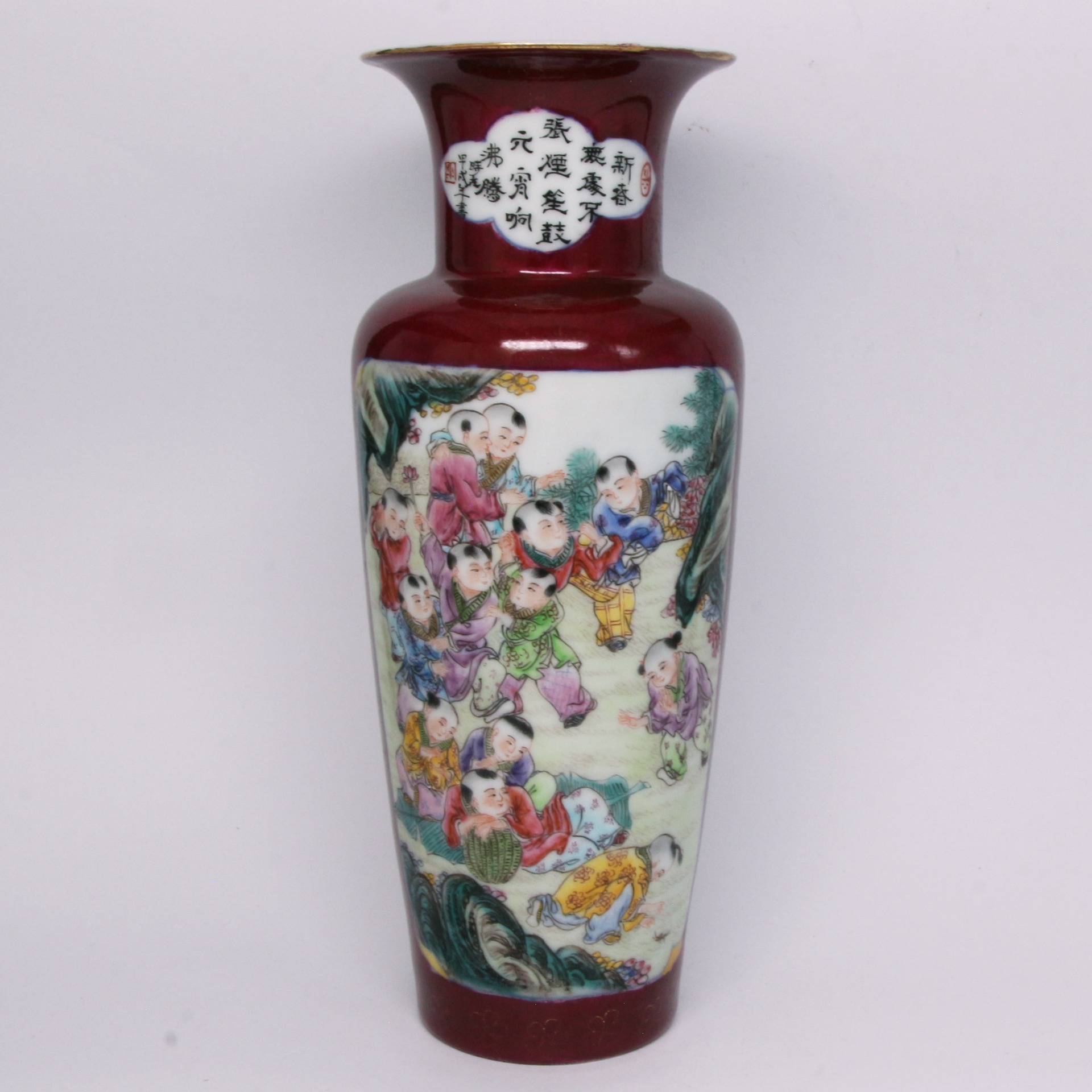 在繪畫與裝飾工藝上,此器展現了極高的水準。腹部以粉彩描繪眾多童子在園林間玩耍,童子神態各異、生動活潑,衣褶線條流暢,設色豐富且層次分明,寓意「多子多福」與「歲歲平安」。頸部開光內書寫書法詩文,文字蒼勁有力,與腹部繁複的畫作形成「詩書畫印」一體的文人趣味。胭脂紅釉與描金紋飾的結合,不僅襯托出粉彩繪畫的鮮活,更展現了民國瓷器在繼承清代宮廷審美的基礎上,走向民間與商貿發展的精緻工藝特徵。