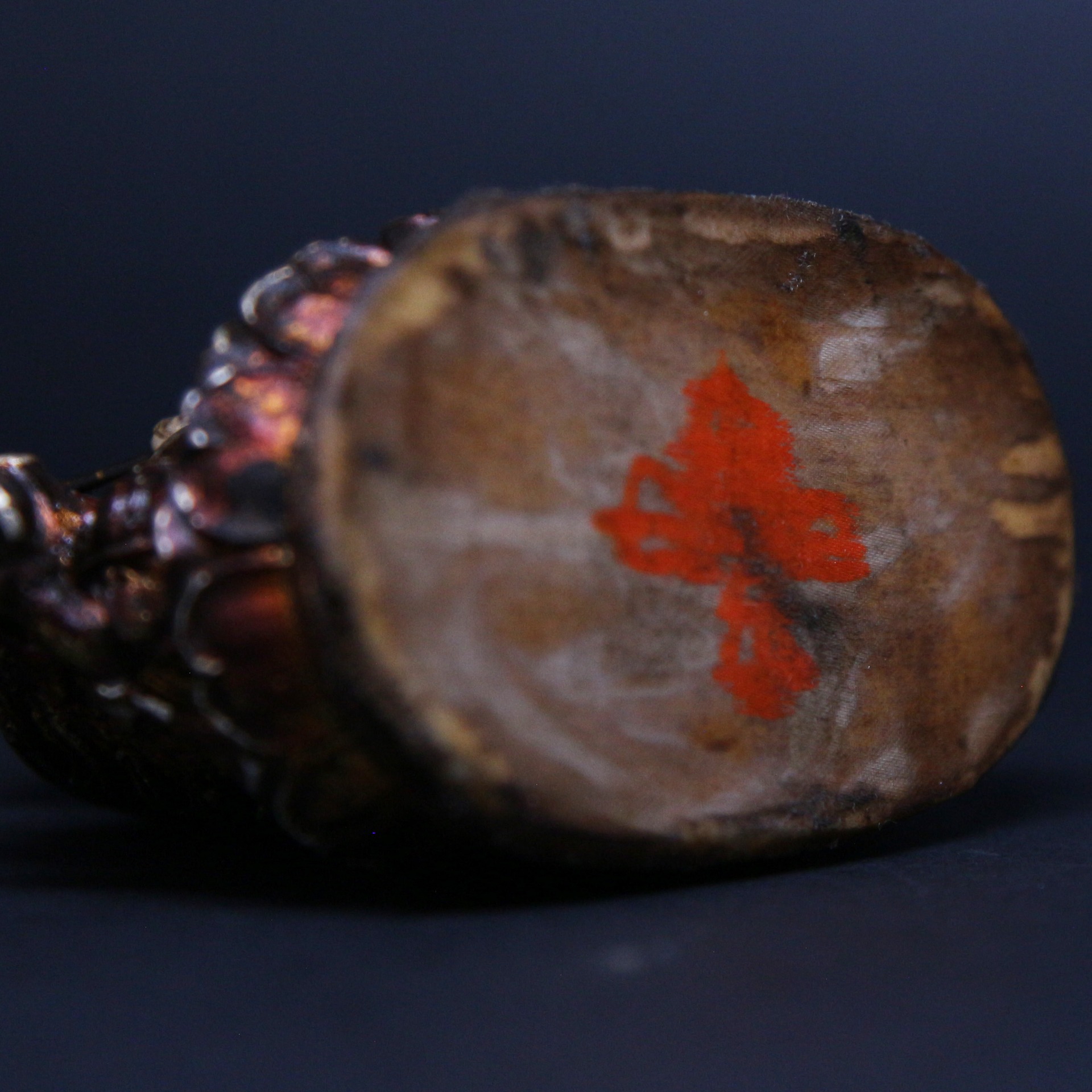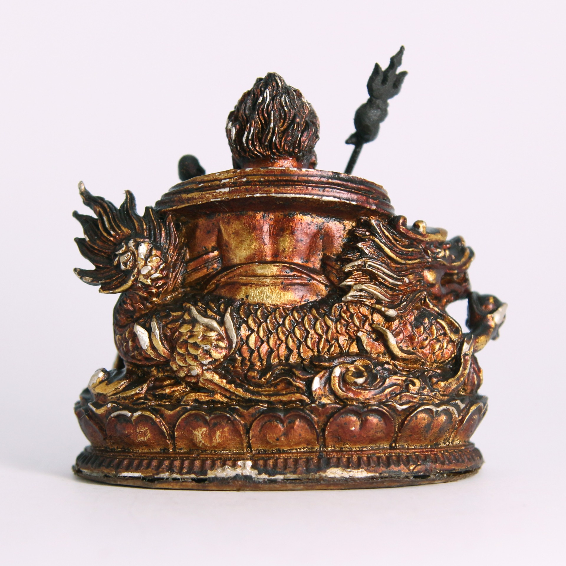 最具特色的是白財神坐騎於氣勢昂揚的龍上——龍象徵至尊威權與護法力量,寓意鎮守財富、驅逐不祥。整件作品底座以蓮瓣紋雕飾,象徵清淨與福德圓滿。銀胎鍍金的小型造像罕見精巧,是一件集信仰意涵與工藝美感於一體的珍貴護法財神像。