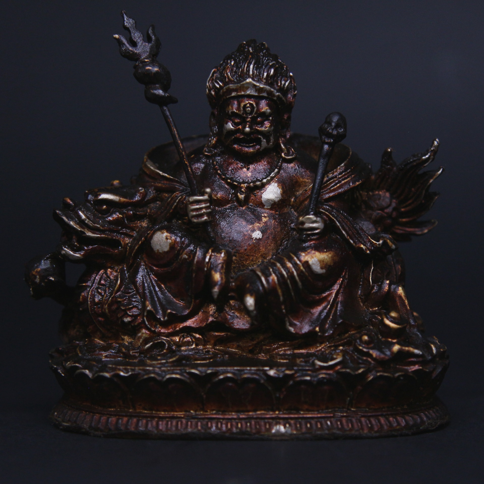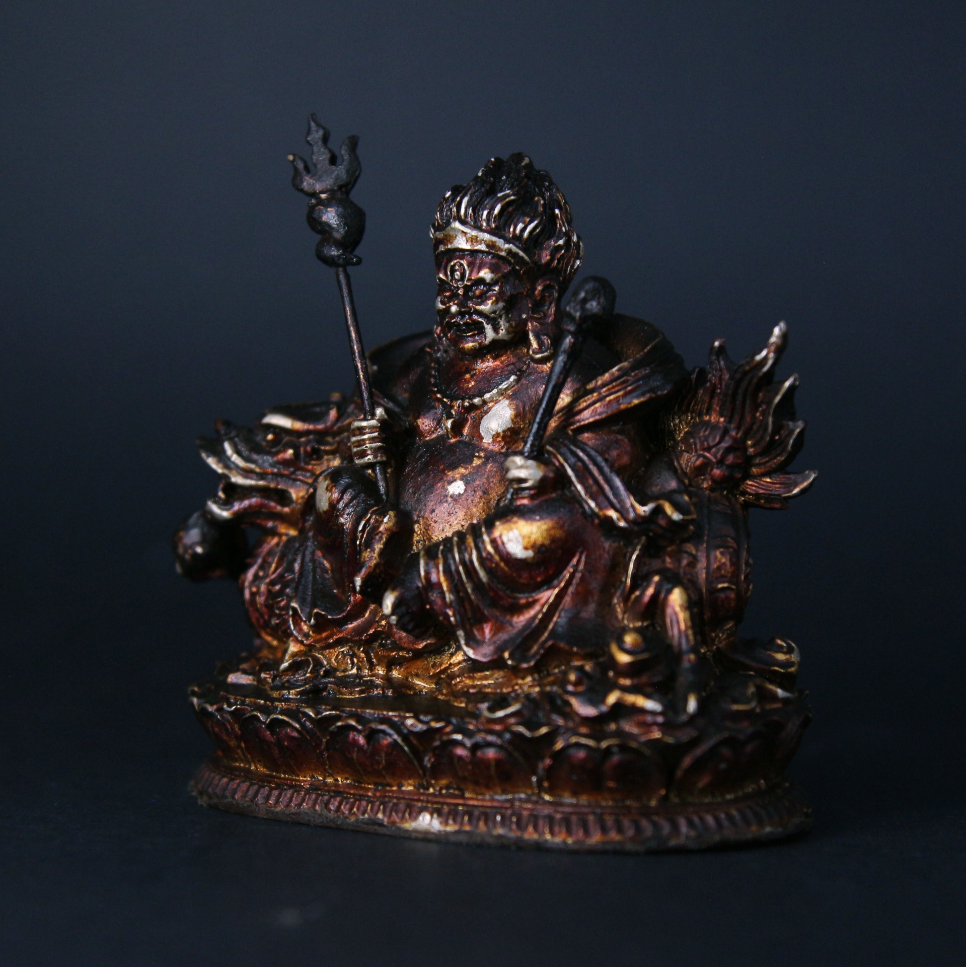 這尊白財神以銀質為體、通體鍍金,色澤溫潤華麗,展現密教財神造像的莊嚴力量。白財神面容威猛,額現法眼,手持權杖與法器,象徵降伏障礙、開啟福運。其衣紋起伏細密,鍍金與殘留彩繪交映,使神像呈現歲月沉澱後的瑰麗光彩。