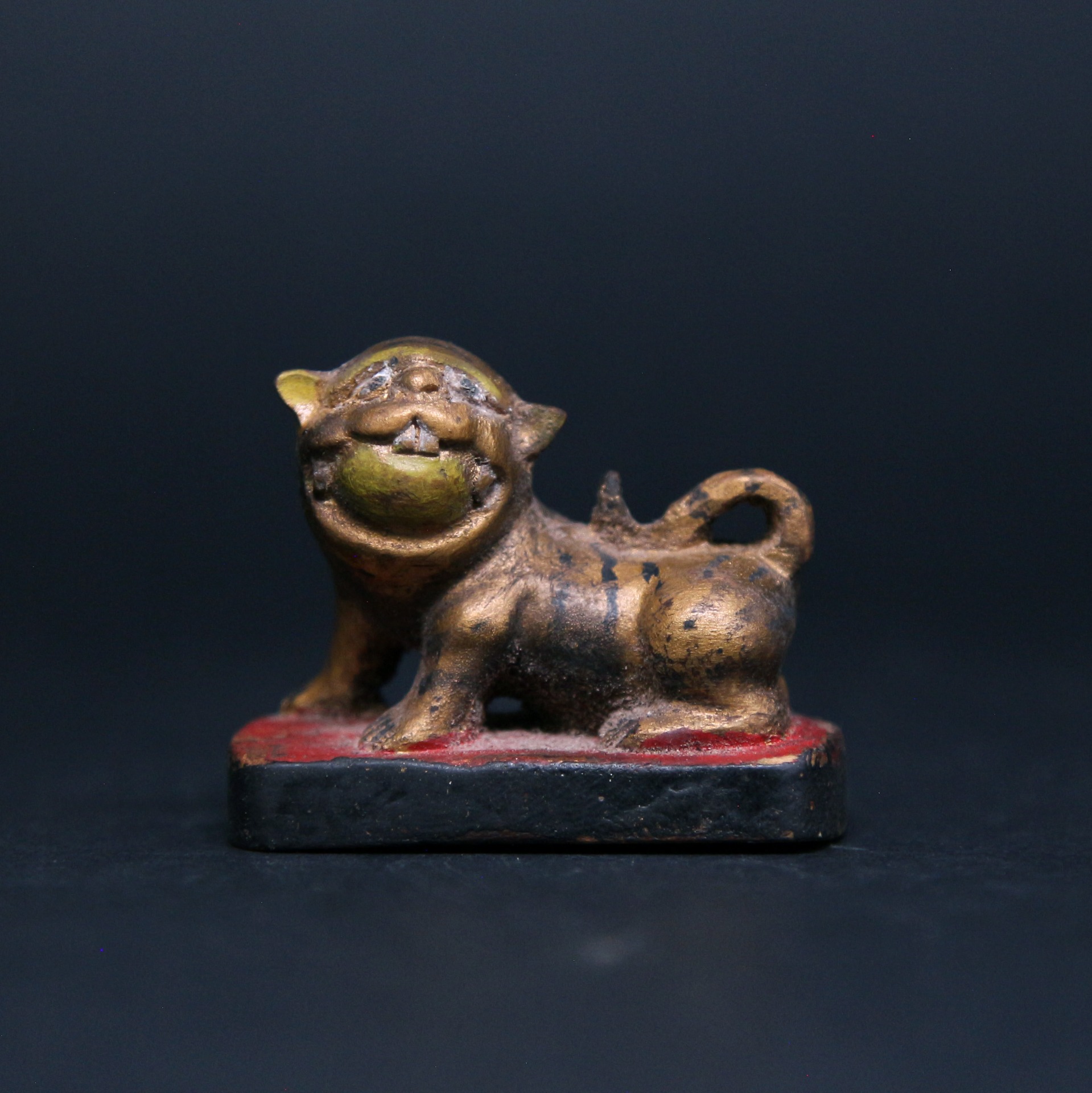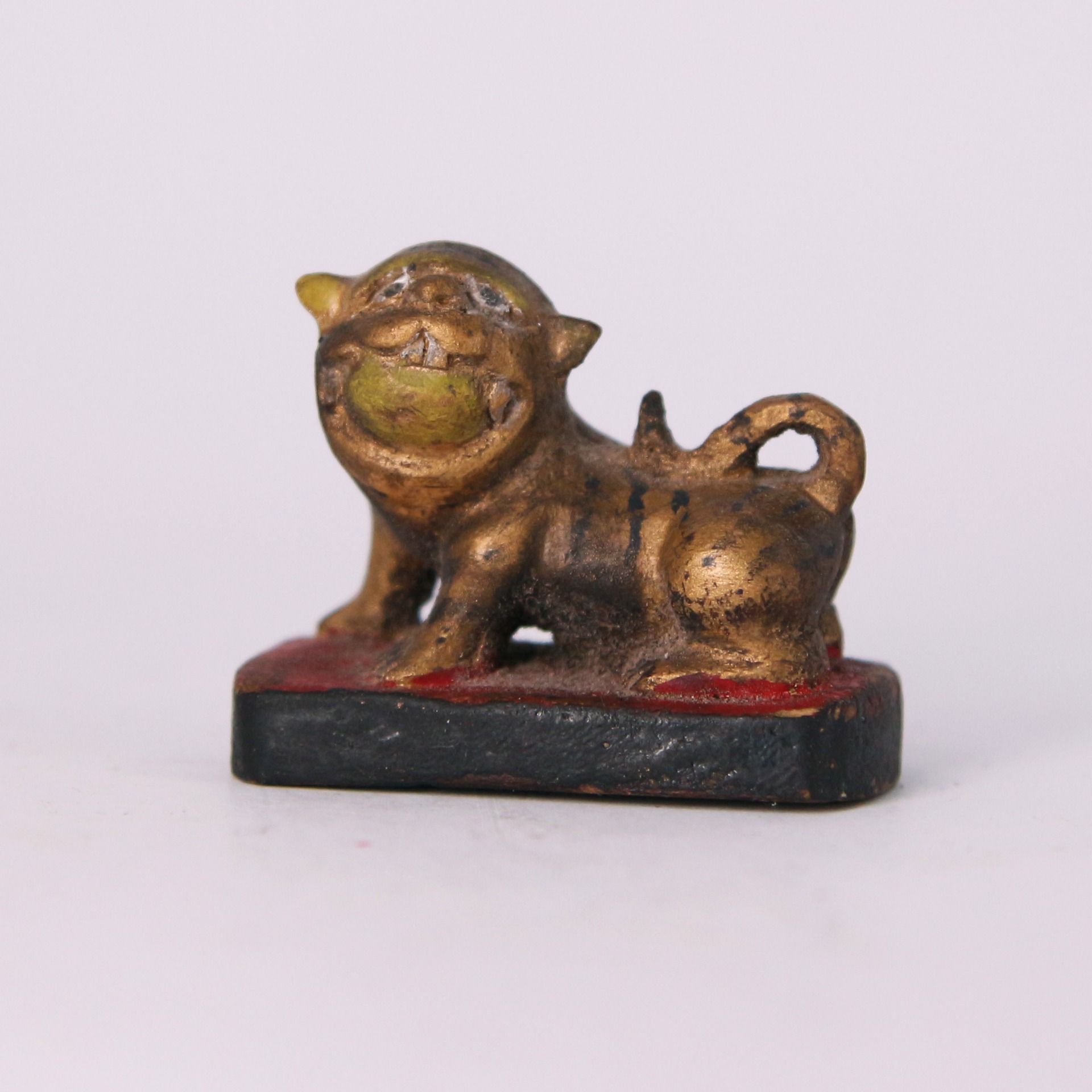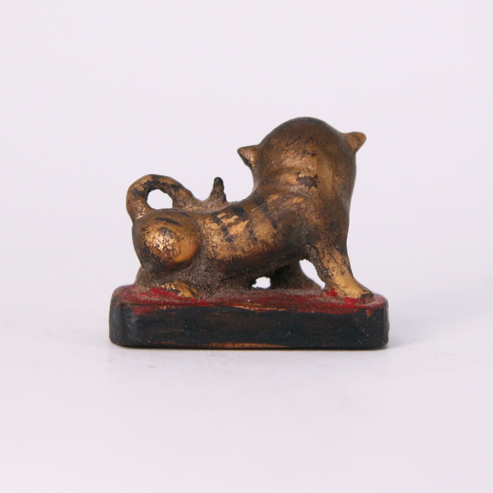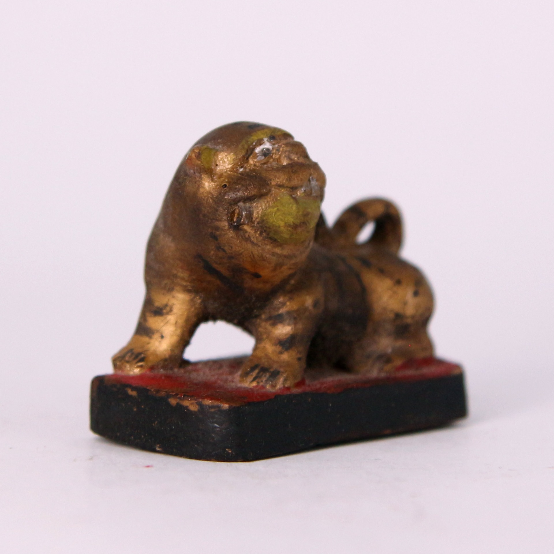 雖然體積微小,但雕刻線條圓潤流暢,充分掌握了老虎伏臥蹲踞的動態。木雕表面可見歲月留下的老漆與斑駁金箔痕跡,這種「熟舊感」賦予了物件深厚的歷史韻味。底座厚實並飾以紅漆,與虎身的古銅色澤形成莊重的色彩對比,是一件極具藝術鑑賞價值與民俗考據意義的袖珍精品。