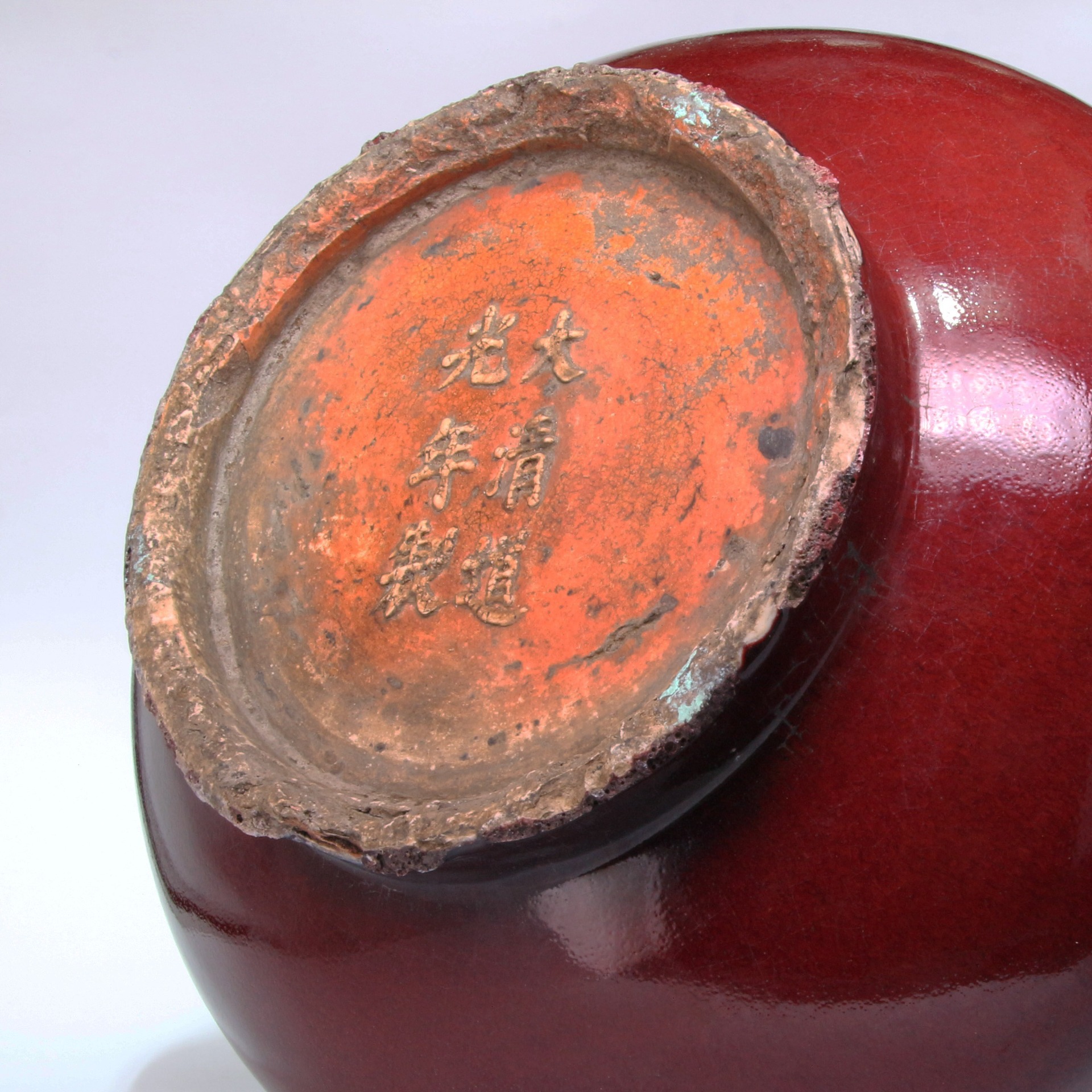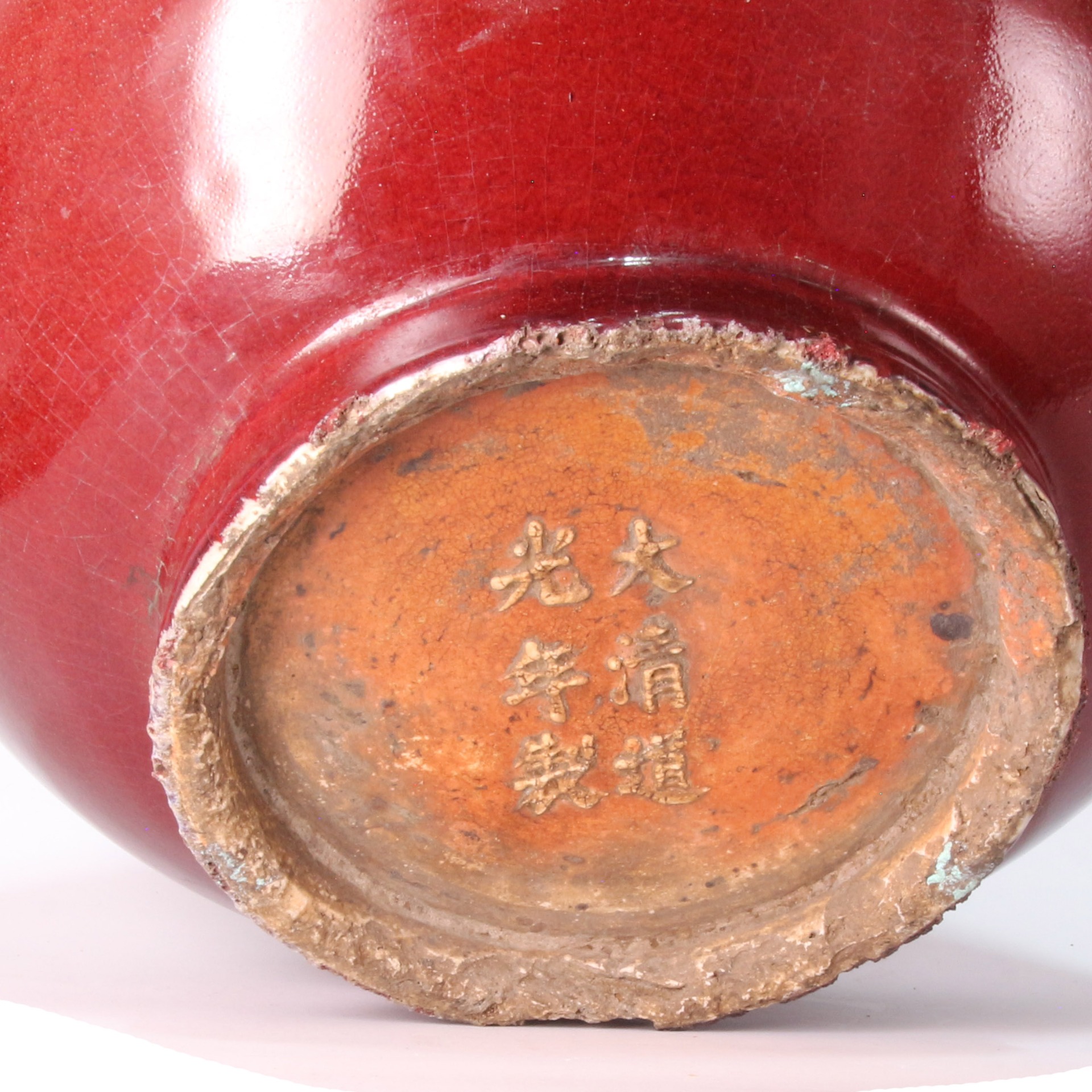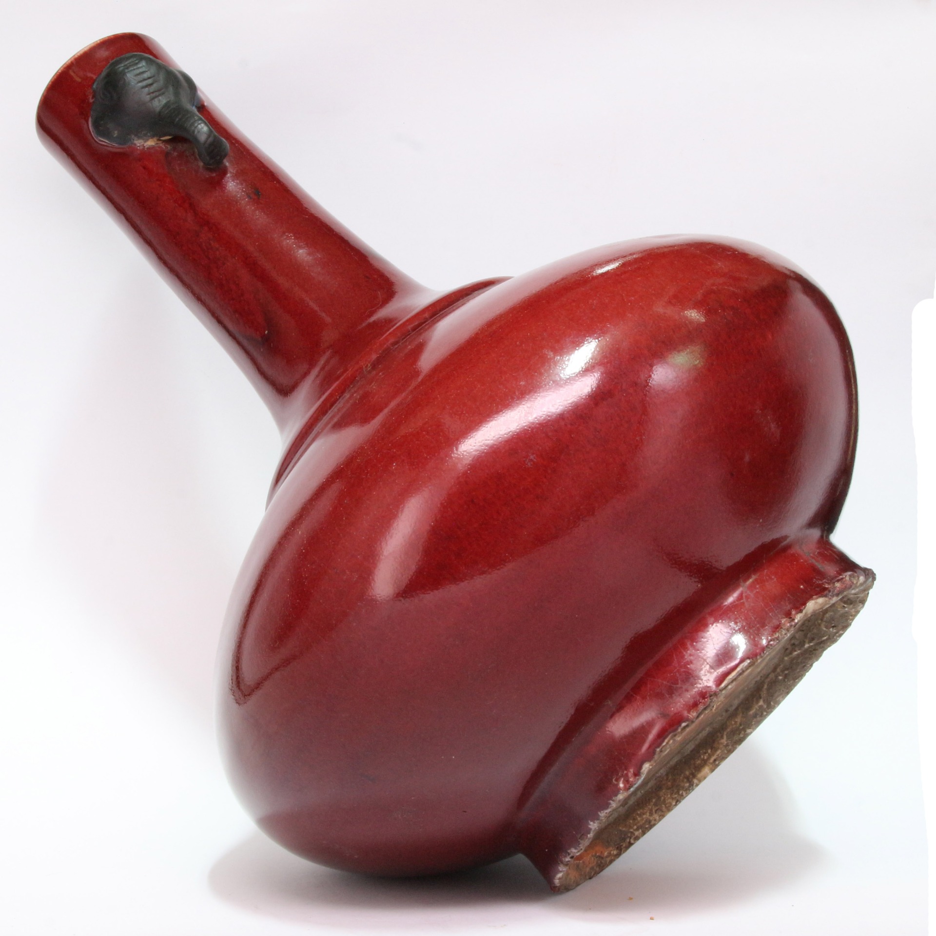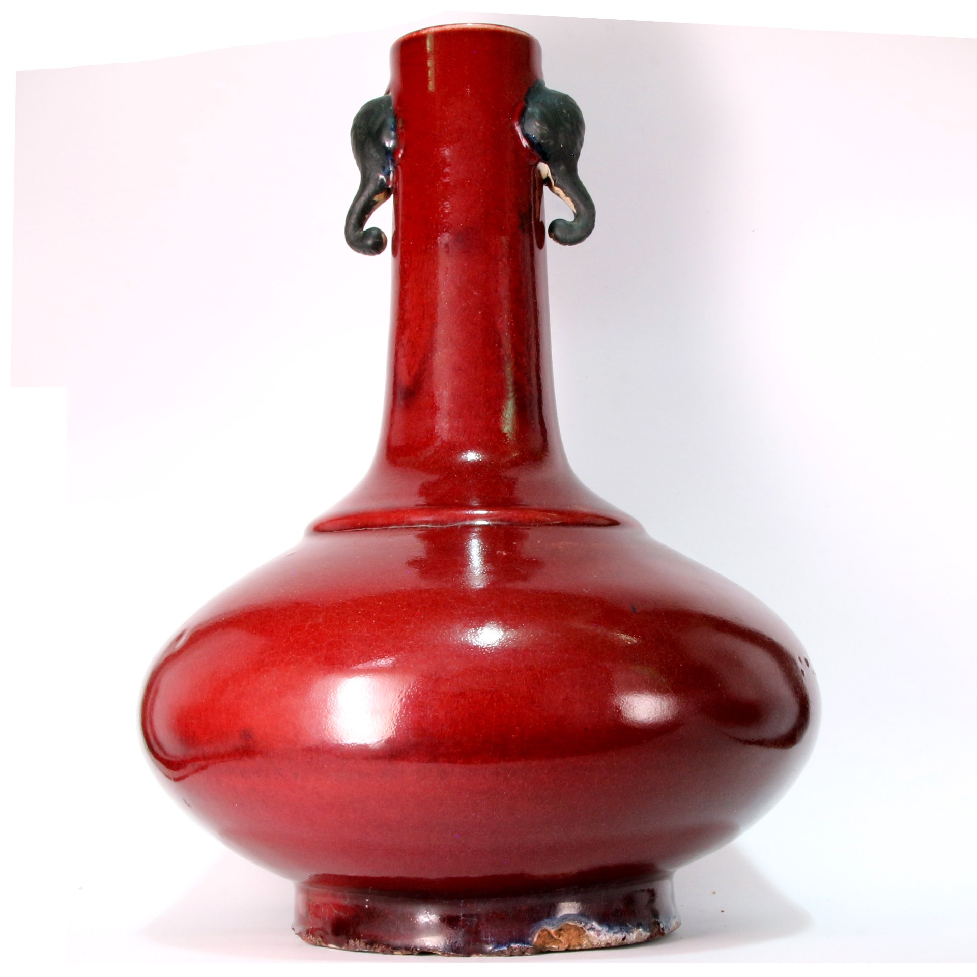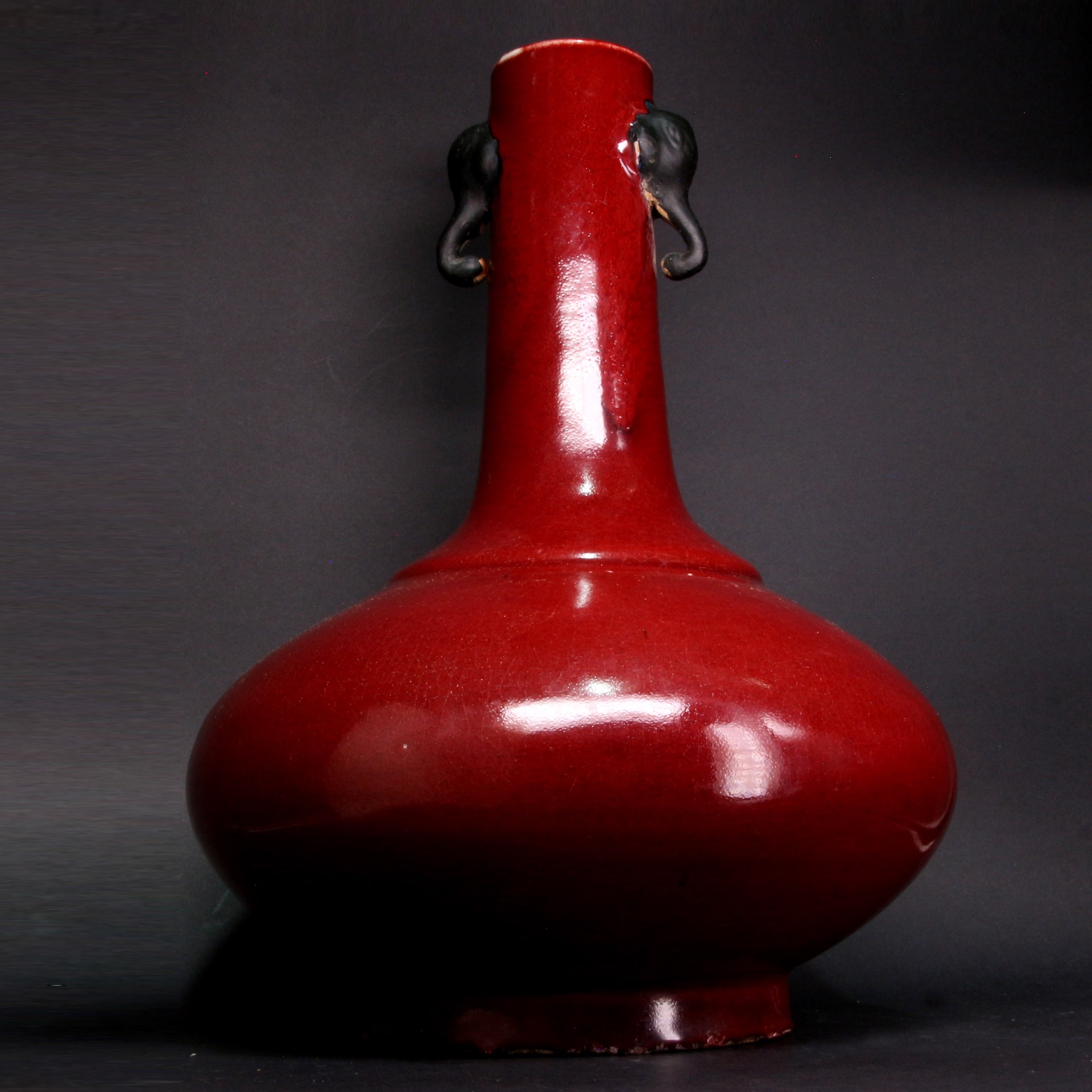 此瓶為清代典型之荸薺瓶器型,因其腹部扁圓,狀如荸薺而得名。器身長頸、扁圓腹、圈足,兩側裝飾對稱的雙象耳,寓意「太平有象」。通體施以濃郁的紅釉,釉質肥厚瑩潤,色澤深沈如凝血,展現了清代單色釉瓷器穩重高雅的審美。底部落有「大清道光年製」六字陽文楷書款,款識佈局規整,其底部露胎處可見胎質堅緻,呈現出清代中晚期精品特有的工藝風貌。