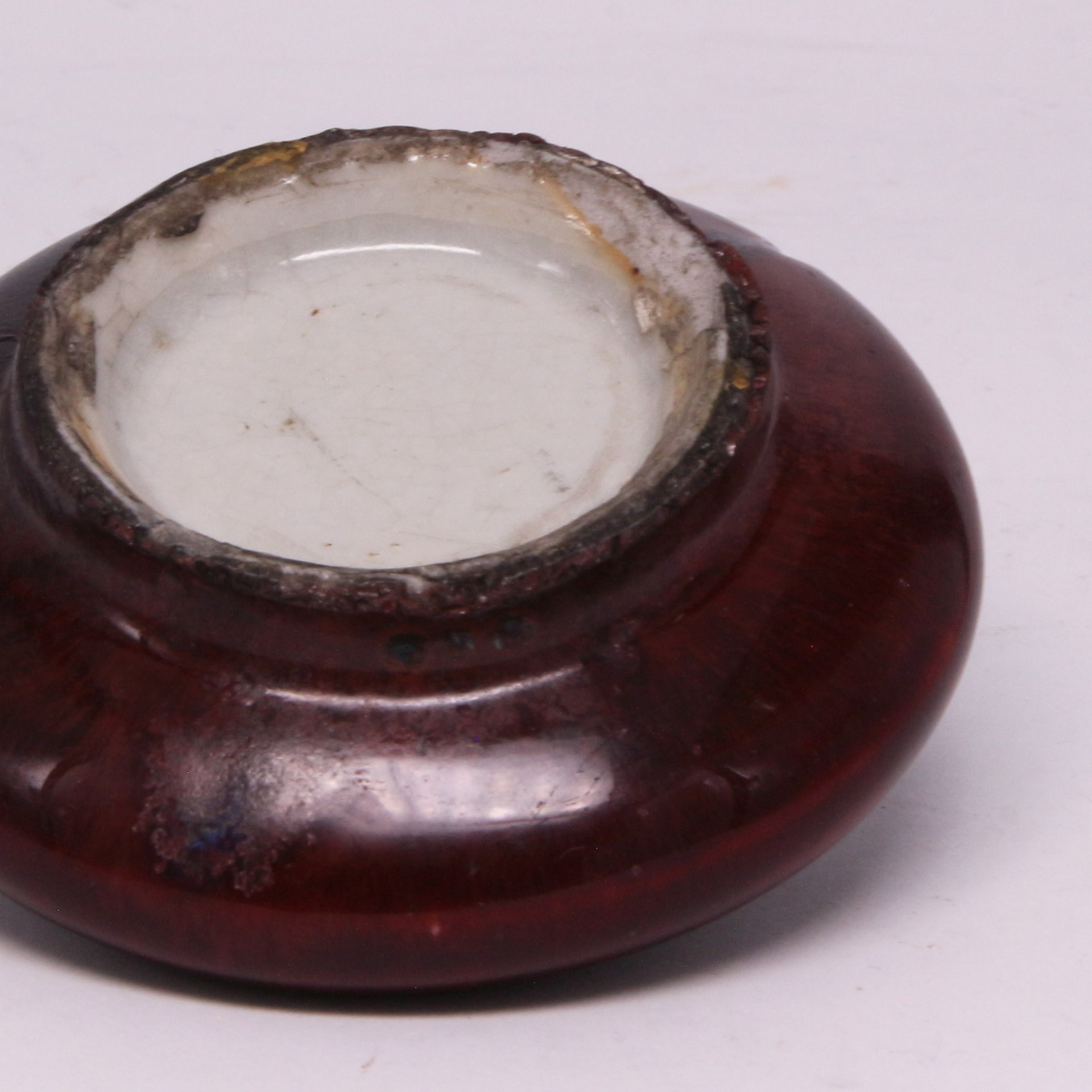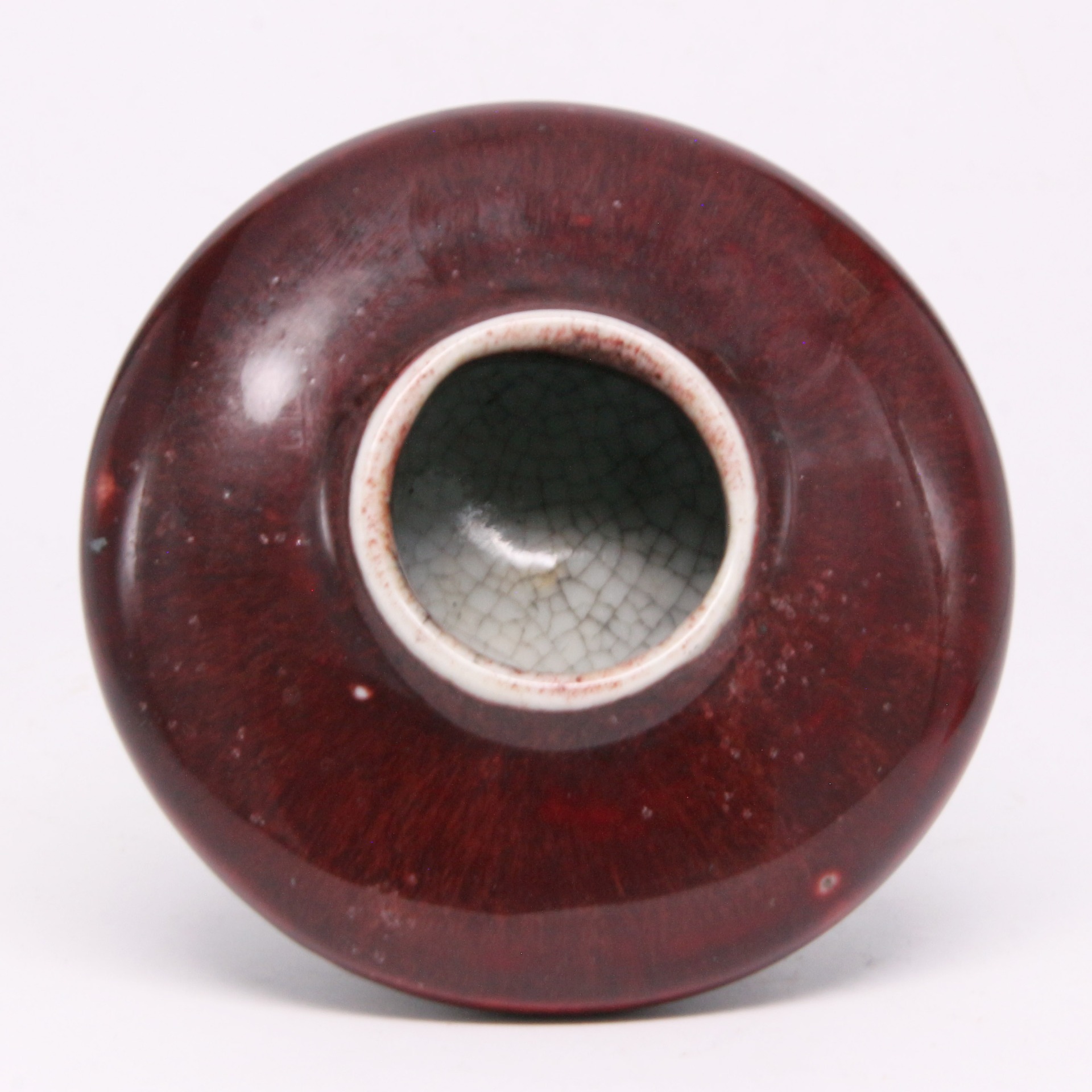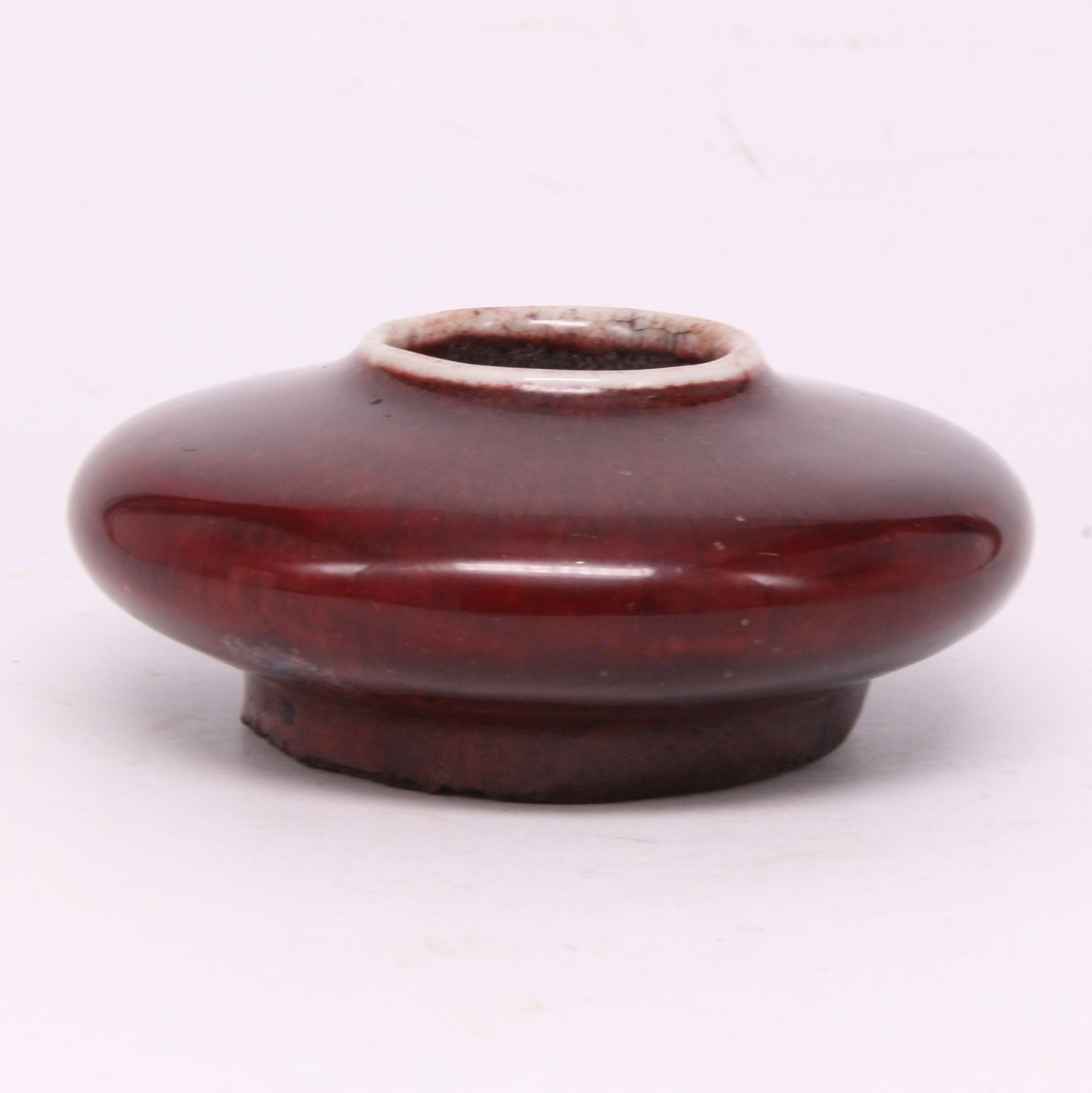 此件文房洗造型小巧精緻,呈扁圓鼓腹狀,線條圓潤流暢,給人以沉穩而內斂的視覺感受。通體施以著名的「郎窯紅」釉,釉色鮮紅濃艷,猶如初凝的牛血,色澤深沉且富有光澤。釉面可見細碎的開片紋理,釉質肥厚,在器物轉折及口沿處釉層流動,呈現出「脫口垂足」的典型特徵,使口沿處透出淡淡的白色胎骨(燈草口),展現出郎窯紅釉色極致的層次感與變化美。
