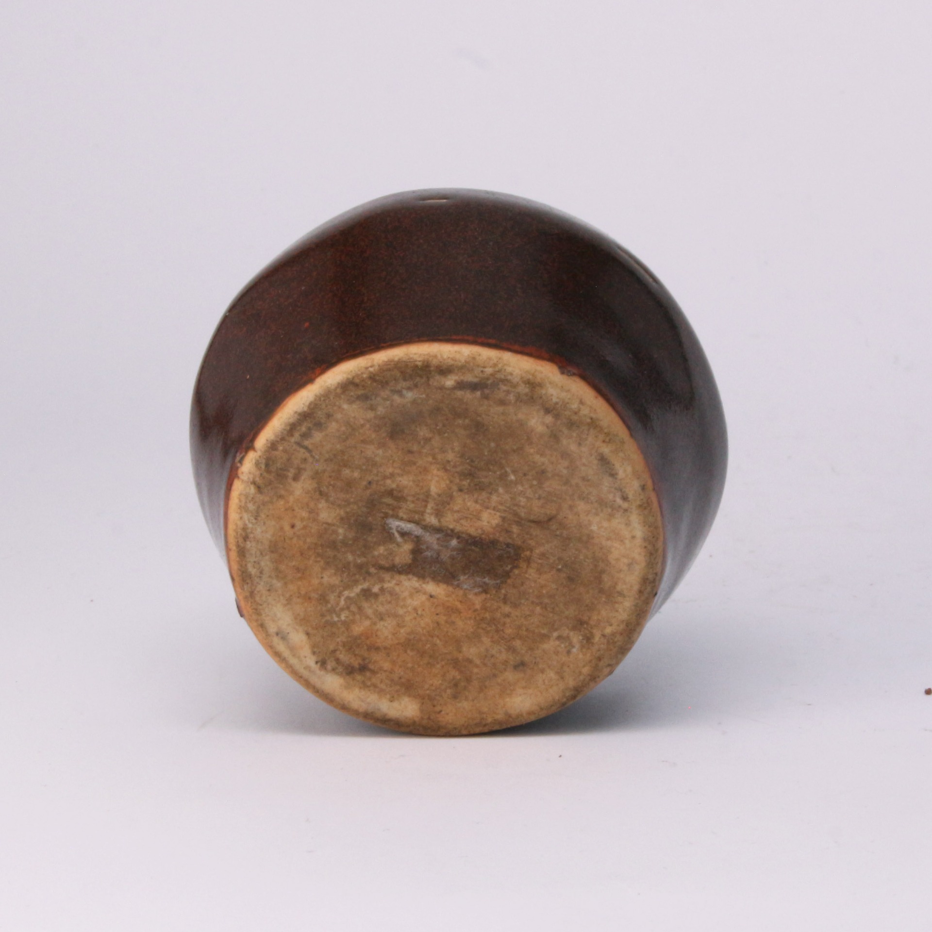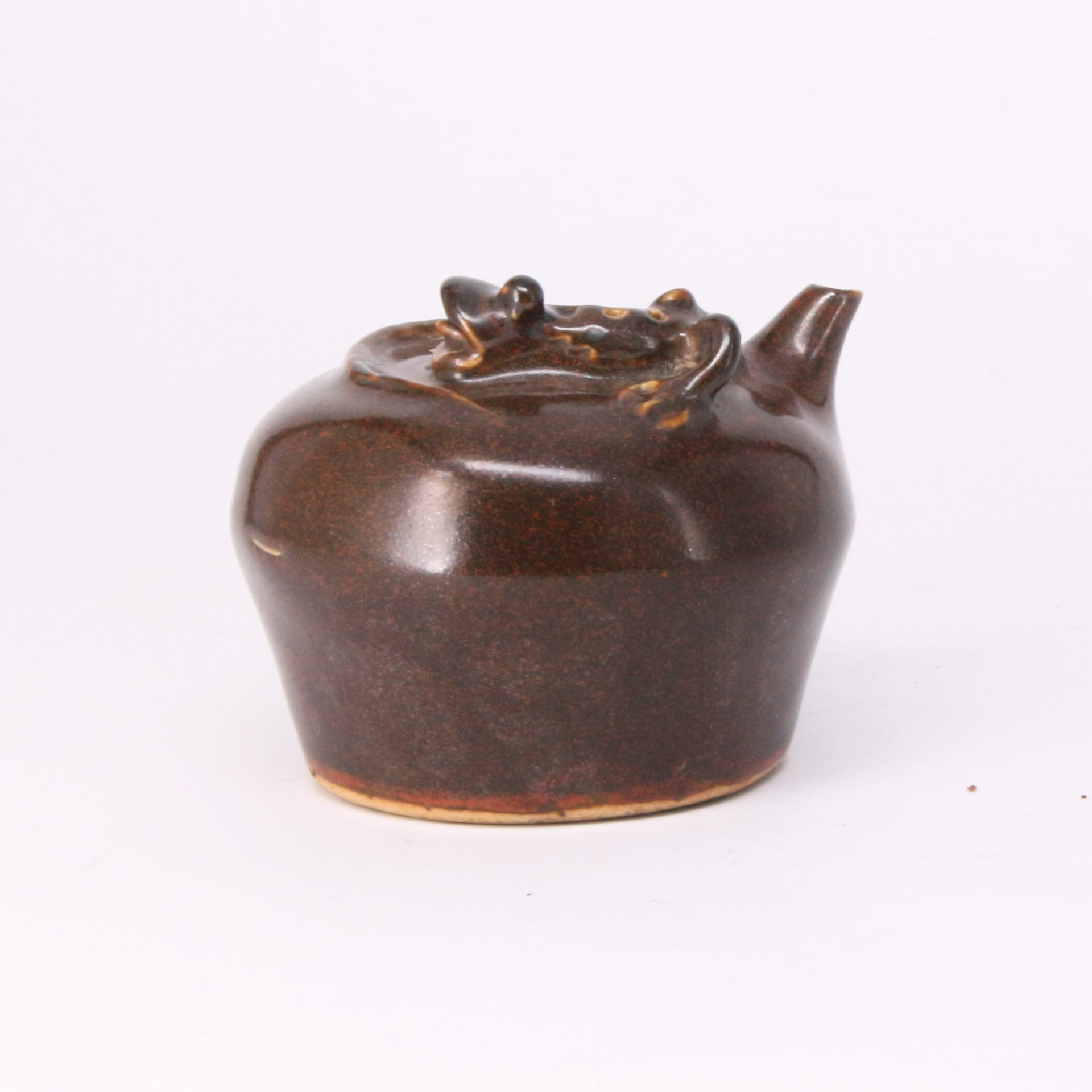 此水滴施以仿鈞窯風格的紅釉,釉色濃郁深沉,呈現出如同成熟果實般的色澤與滋律感。釉面厚潤且分佈有自然微細的開片,展現了清代窯場對宋元鈞瓷「窯變」美學的傳承與再創造。其色調由頂部的深紅向底部逐漸轉為深褐,層次豐富,體現了高溫釉在燒成過程中流動與變化的自然之美。