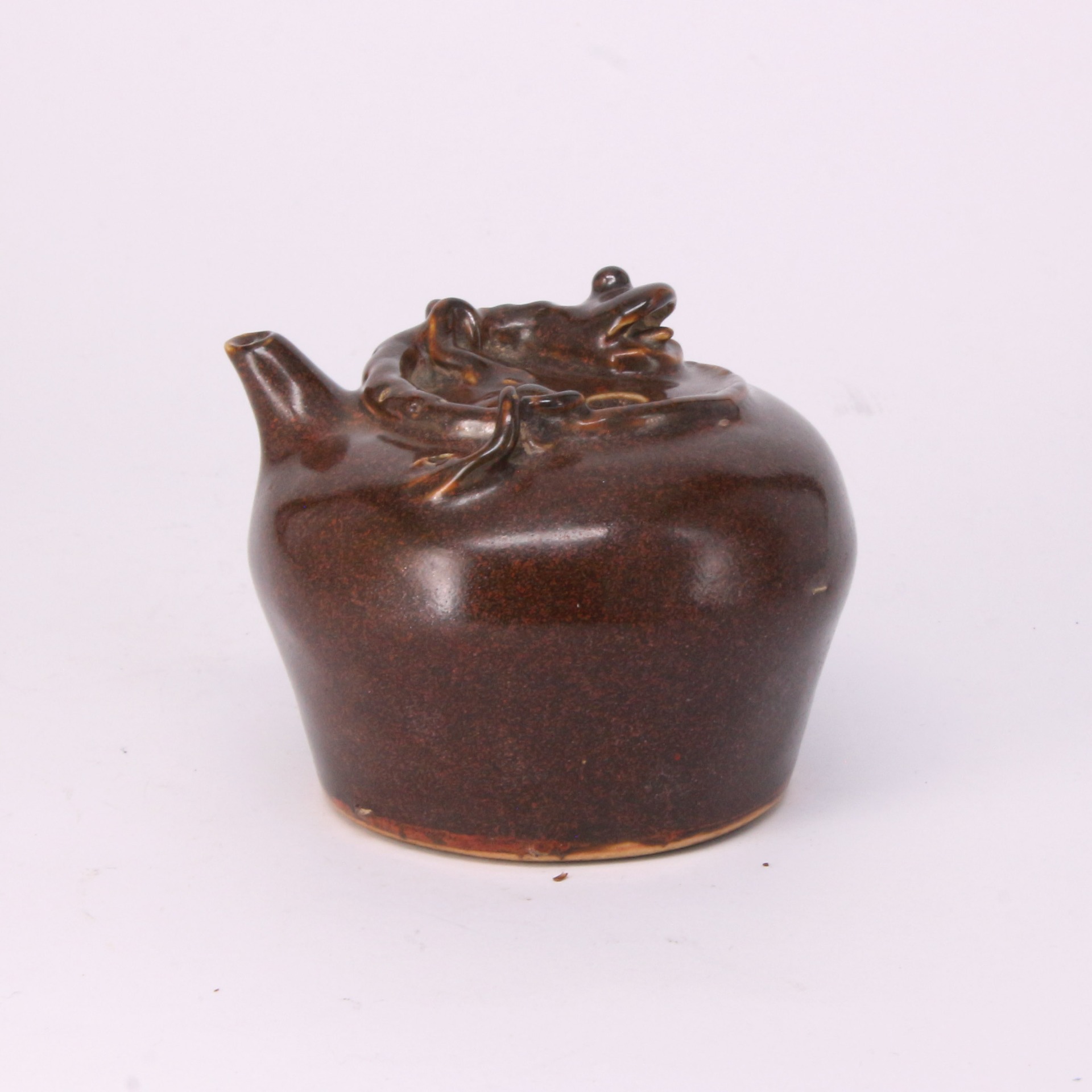 器身造型圓潤工整,頂部巧妙地裝飾一尊蟠龍,龍身盤踞於蓋面,雕琢生動且具力量感,寓意「魚躍龍門」或「龍行天下」等吉祥氣息。作為文房用具中的「水滴」(又稱水注),其流口設計精巧,便於精確控制磨墨時的入水量。這種將神話瑞獸與日常文具結合的設計,充分反映了清代文人對書案雅玩細節的追求。