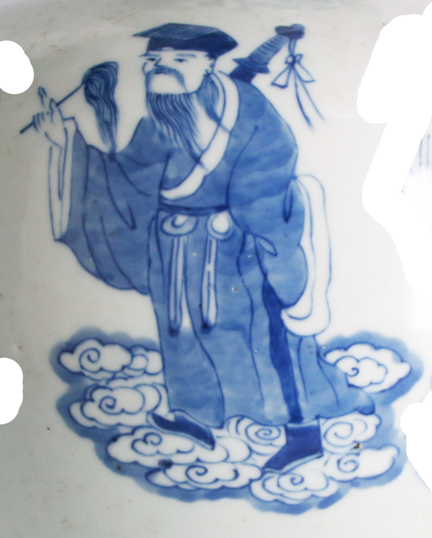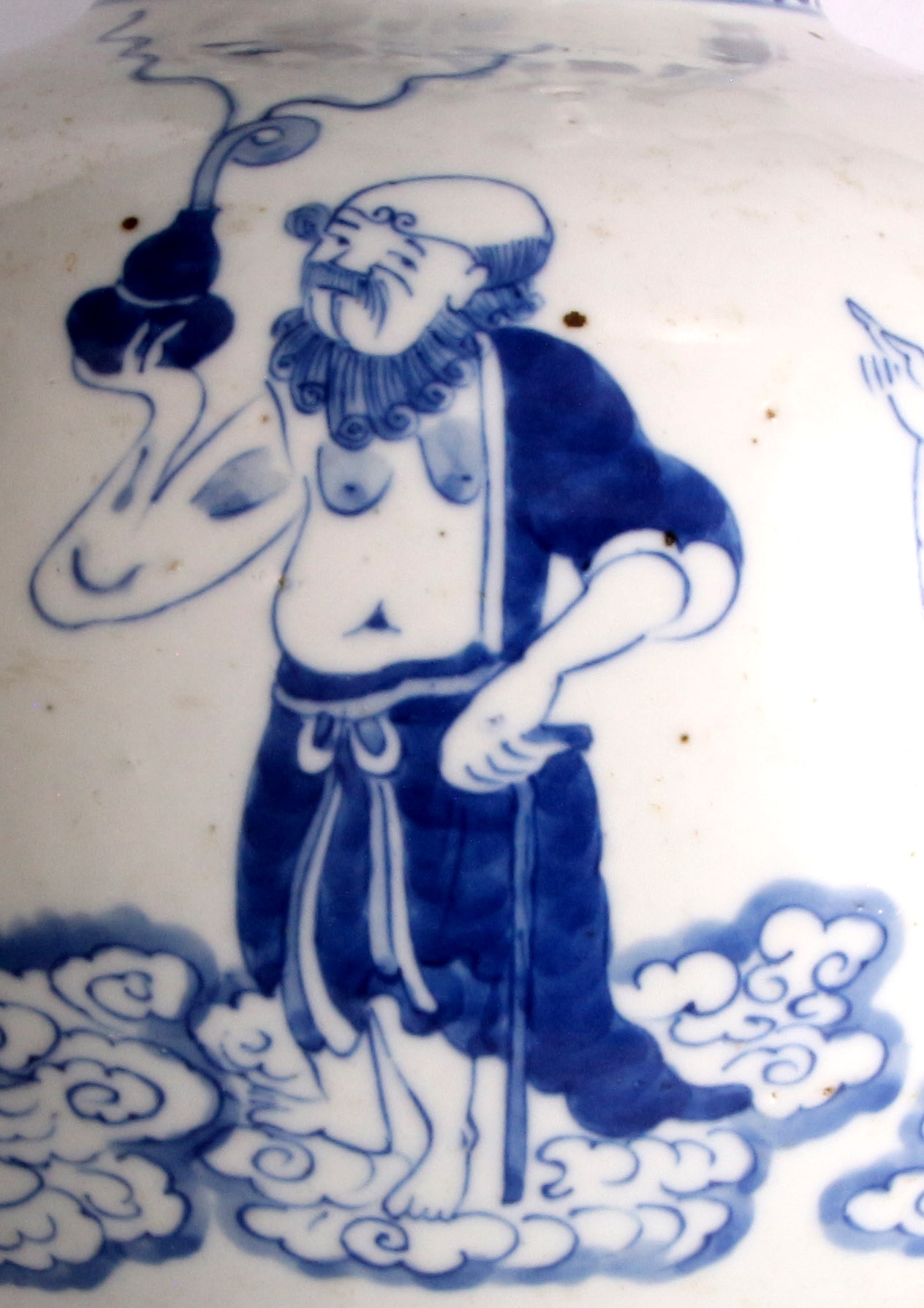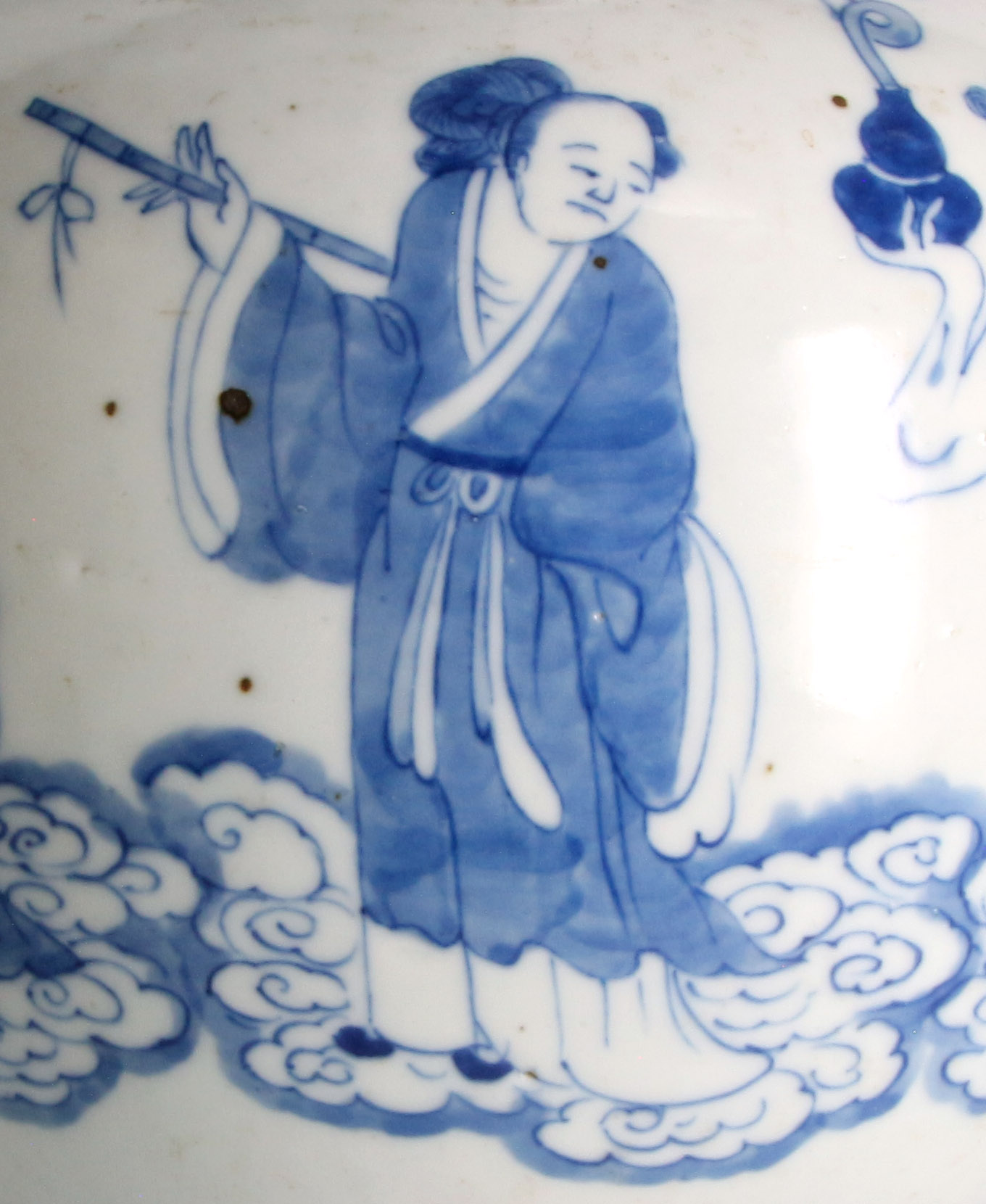 此瓶呈葫蘆造型,線條飽滿圓潤,上小下大,比例協調,展現了葫蘆瓶特有的「福祿」之姿。瓶身以釉下青花繪製「八仙過海」圖,青花發色沉穩,色階層次分明。畫中八仙姿態各異,人物神情刻畫生動,衣褶線條流暢灑脫,於祥雲繚繞之間隱現,展現出藝匠嫻熟的繪畫功底。瓶頸處點綴簡潔紋飾,與飽滿的腹部形成視覺上的虛實對比,整體器物顯得雅致大方,不僅保留了傳統青花的典雅之美,更體現了清代瓷器講究寓意與裝飾結合的工藝傳統。