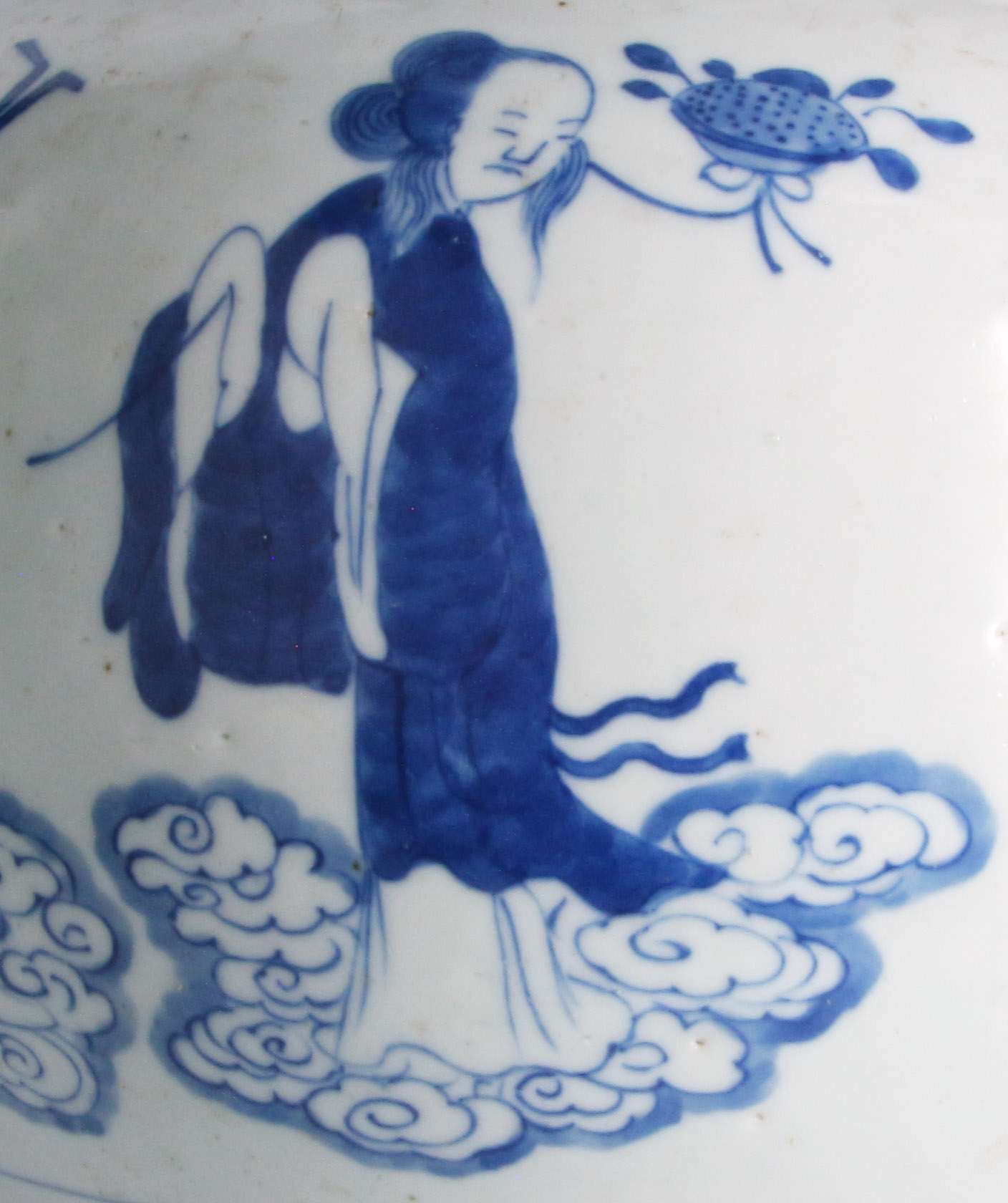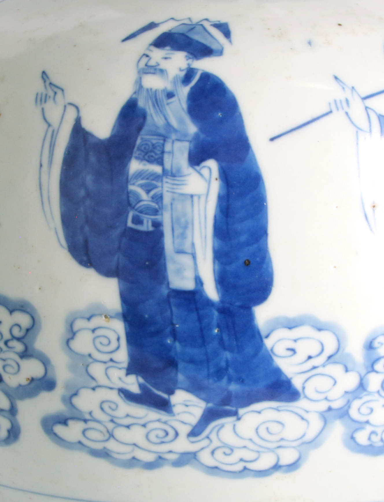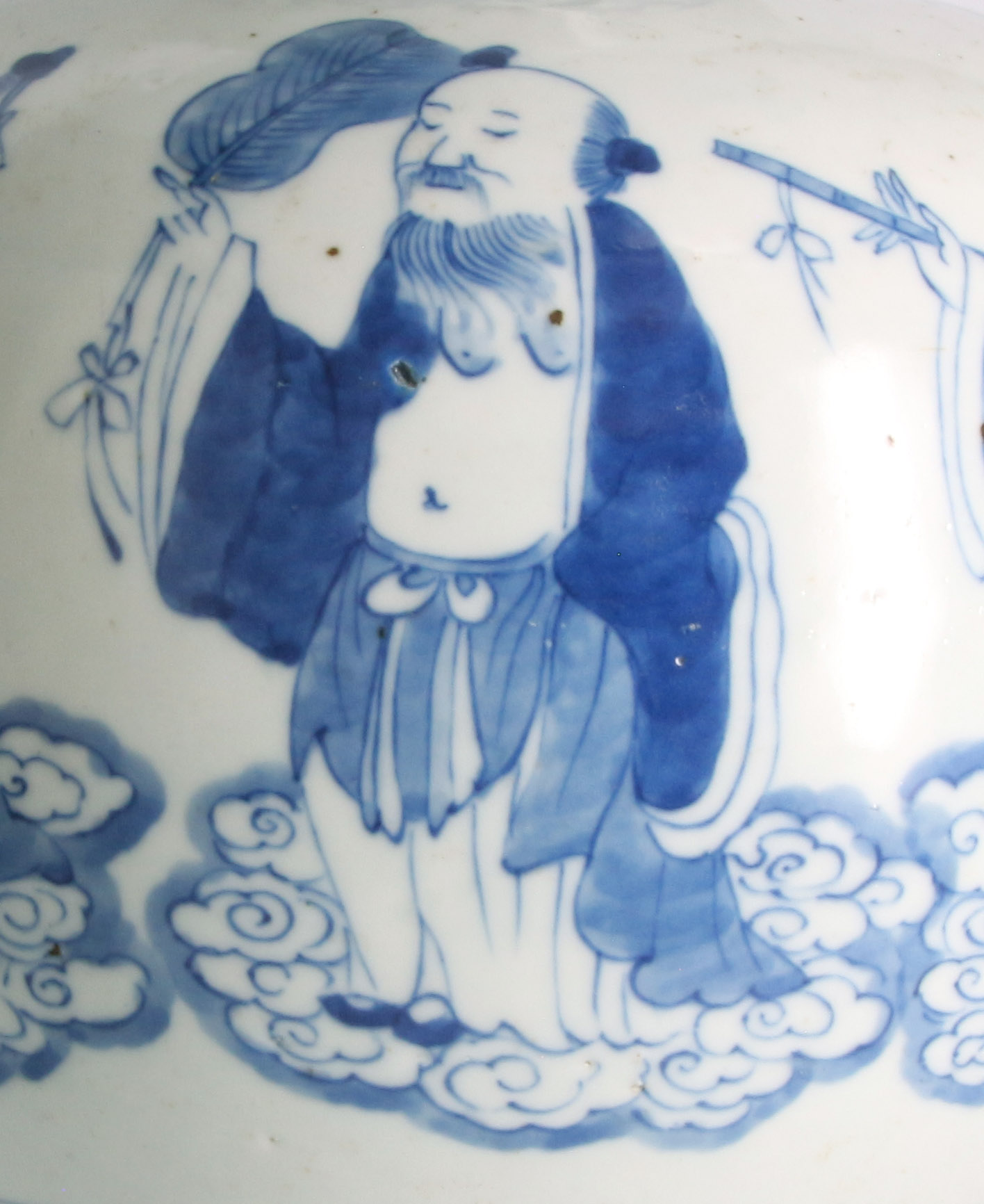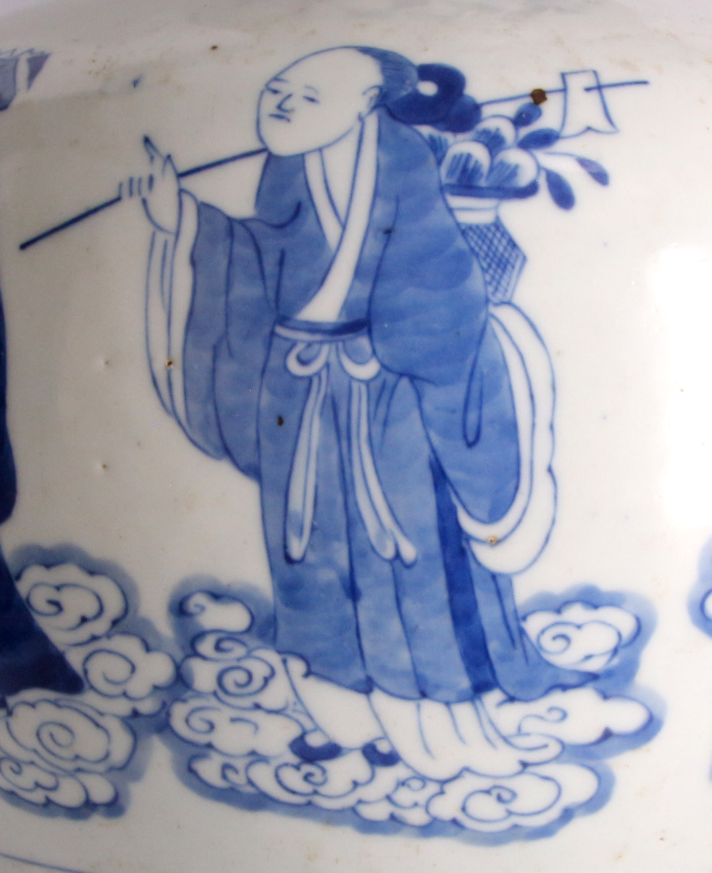 此瓶呈葫蘆造型,線條飽滿圓潤,上小下大,比例協調,展現了葫蘆瓶特有的「福祿」之姿。瓶身以釉下青花繪製「八仙過海」圖,青花發色沉穩,色階層次分明。畫中八仙姿態各異,人物神情刻畫生動,衣褶線條流暢灑脫,於祥雲繚繞之間隱現,展現出藝匠嫻熟的繪畫功底。瓶頸處點綴簡潔紋飾,與飽滿的腹部形成視覺上的虛實對比,整體器物顯得雅致大方,不僅保留了傳統青花的典雅之美,更體現了清代瓷器講究寓意與裝飾結合的工藝傳統。