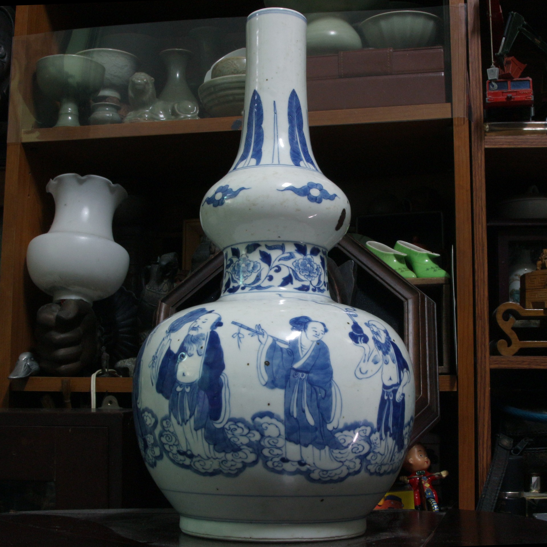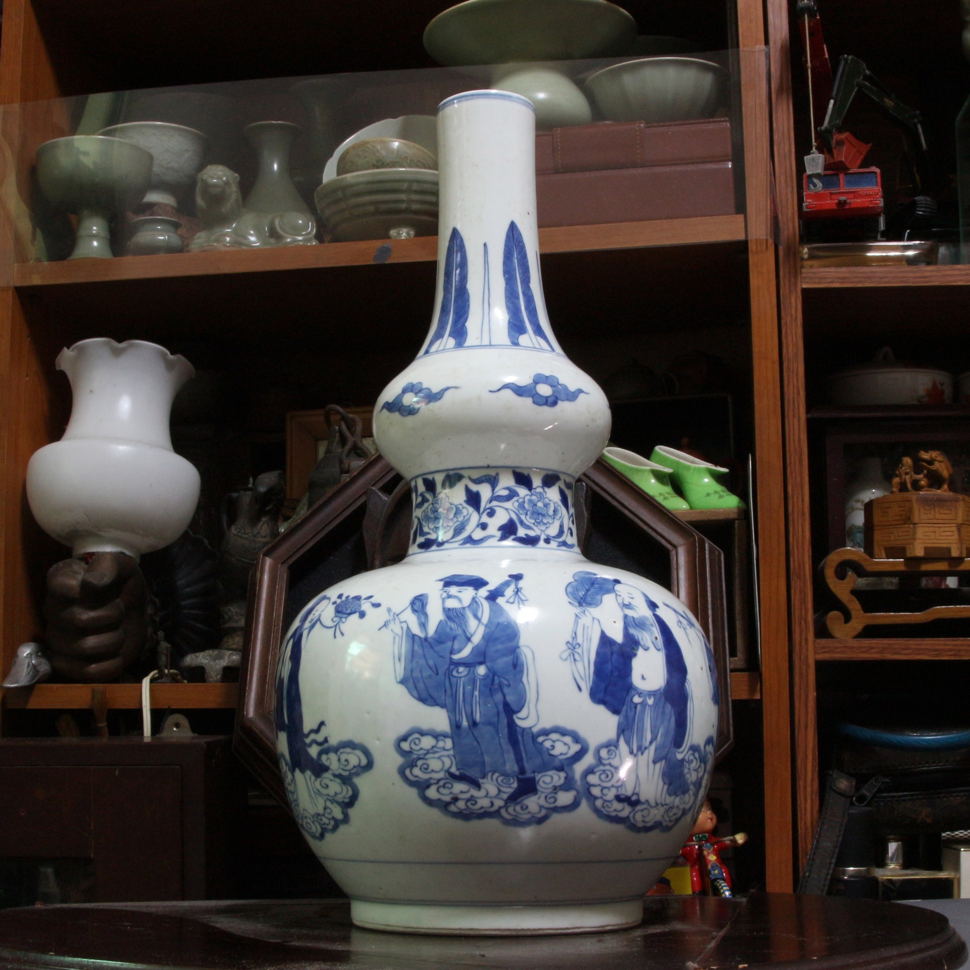 葫蘆瓶在中國傳統文化中,因其形似「吉」字,且多子多福,被視為吉祥之器;而「八仙」作為道教傳說中的福壽代表,寓意「八仙賜福、長壽安康」。此瓶將兩者結合,不僅是一件精美的裝飾瓷器,更寄託了辟邪納福、福祿綿長的美好祈願。器表釉面光潔,保存狀態良好,紋飾佈局疏密有致,極具歷史與文化價值。無論是作為私人收藏增添室內雅趣,亦或作為傳承有序的陳設重器,皆能展現出擁有者對於傳統文化品味的獨到眼光。