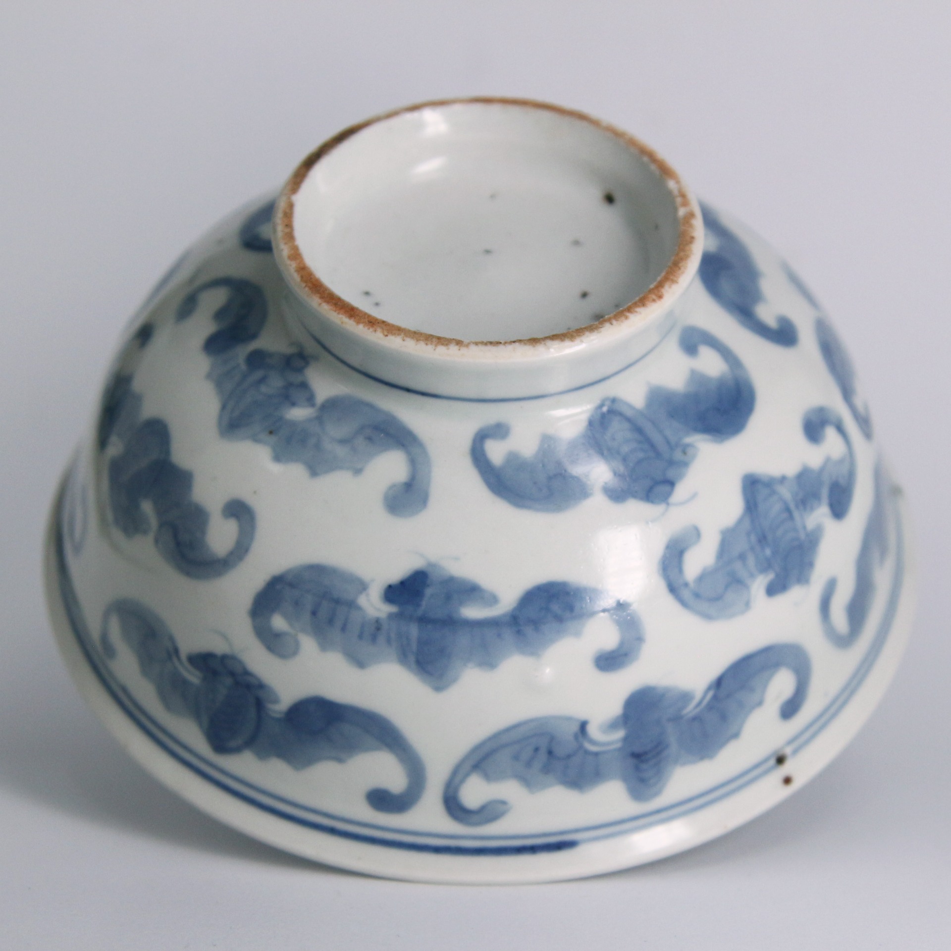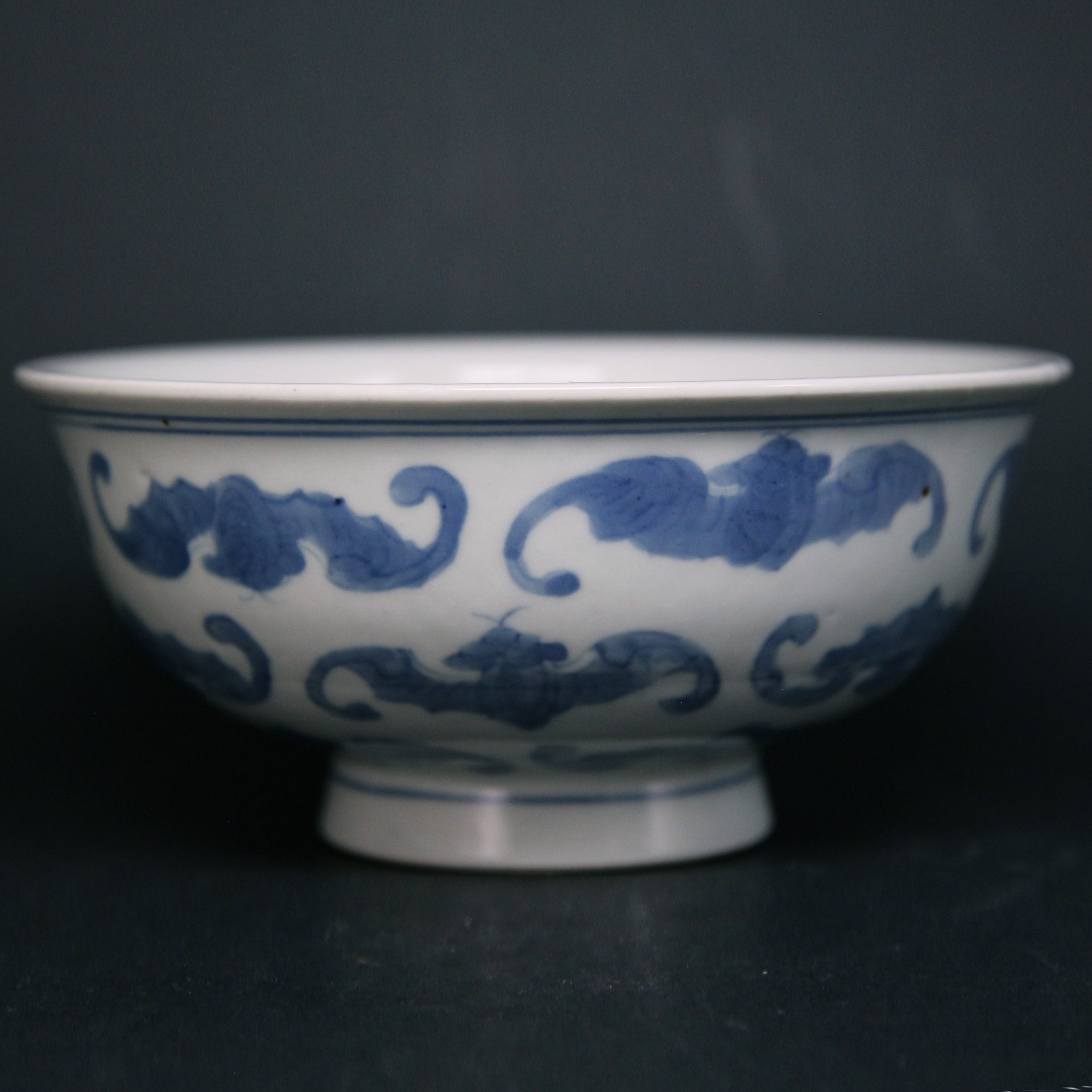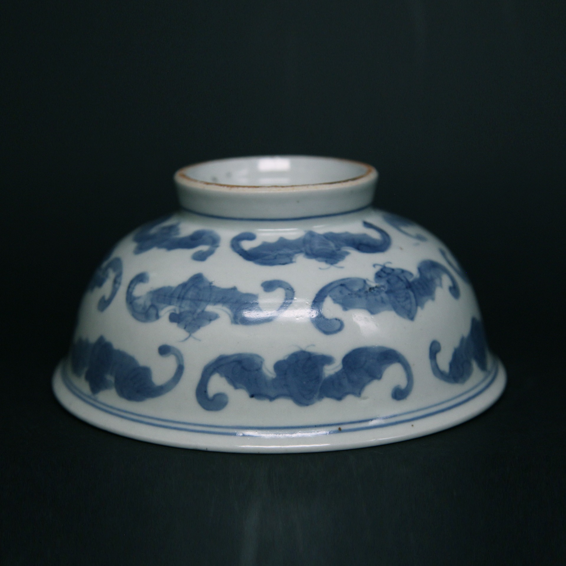 蝙蝠紋在清代瓷器中承載著豐富的吉祥寓意。因「蝠」諧音「福」,「遍蝠」諧音「遍福」,寓意遍地是福、幸福無邊;多隻蝙蝠飛舞則象徵「洪福齊天」或「百福呈祥」。在清代,這類多蝠紋飾的瓷碗不僅是常見的官窯或民窯生活器用,更是清代追求「圖必有意,意必吉祥」裝飾風格的具體縮影,反映了當時人們對美好生活的祈求與祝福。