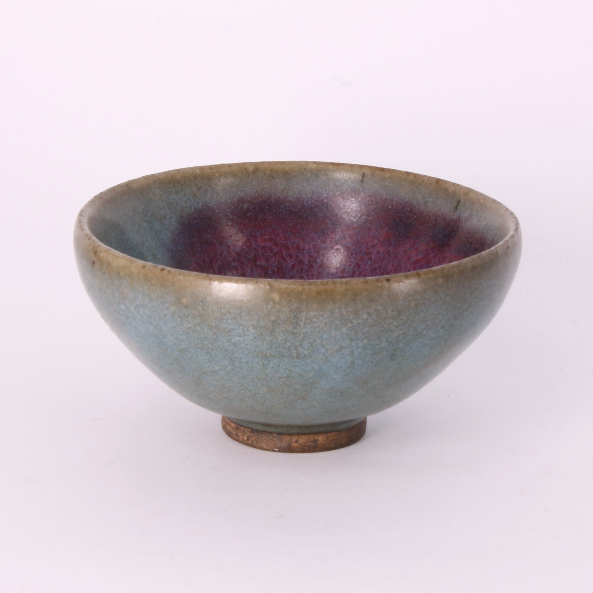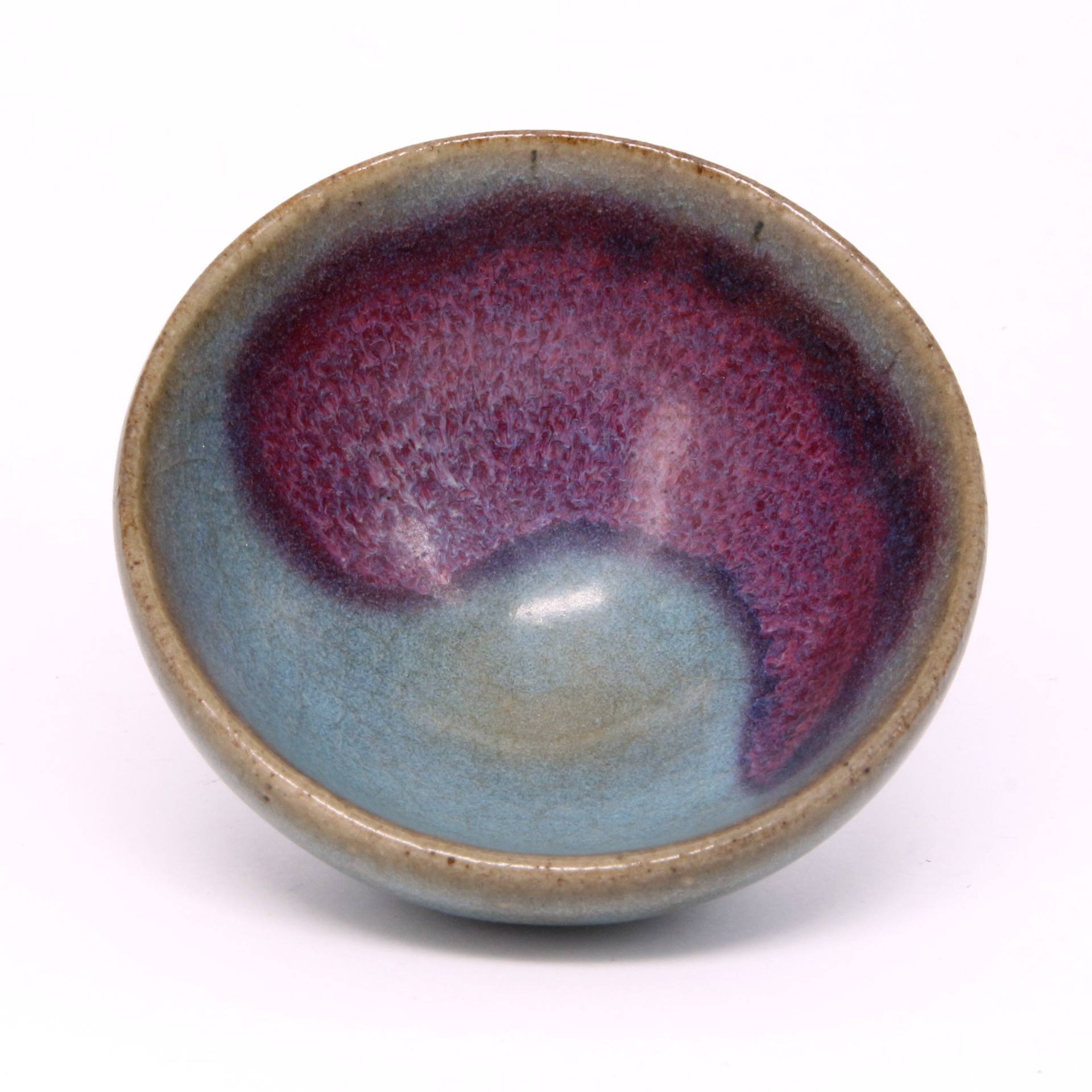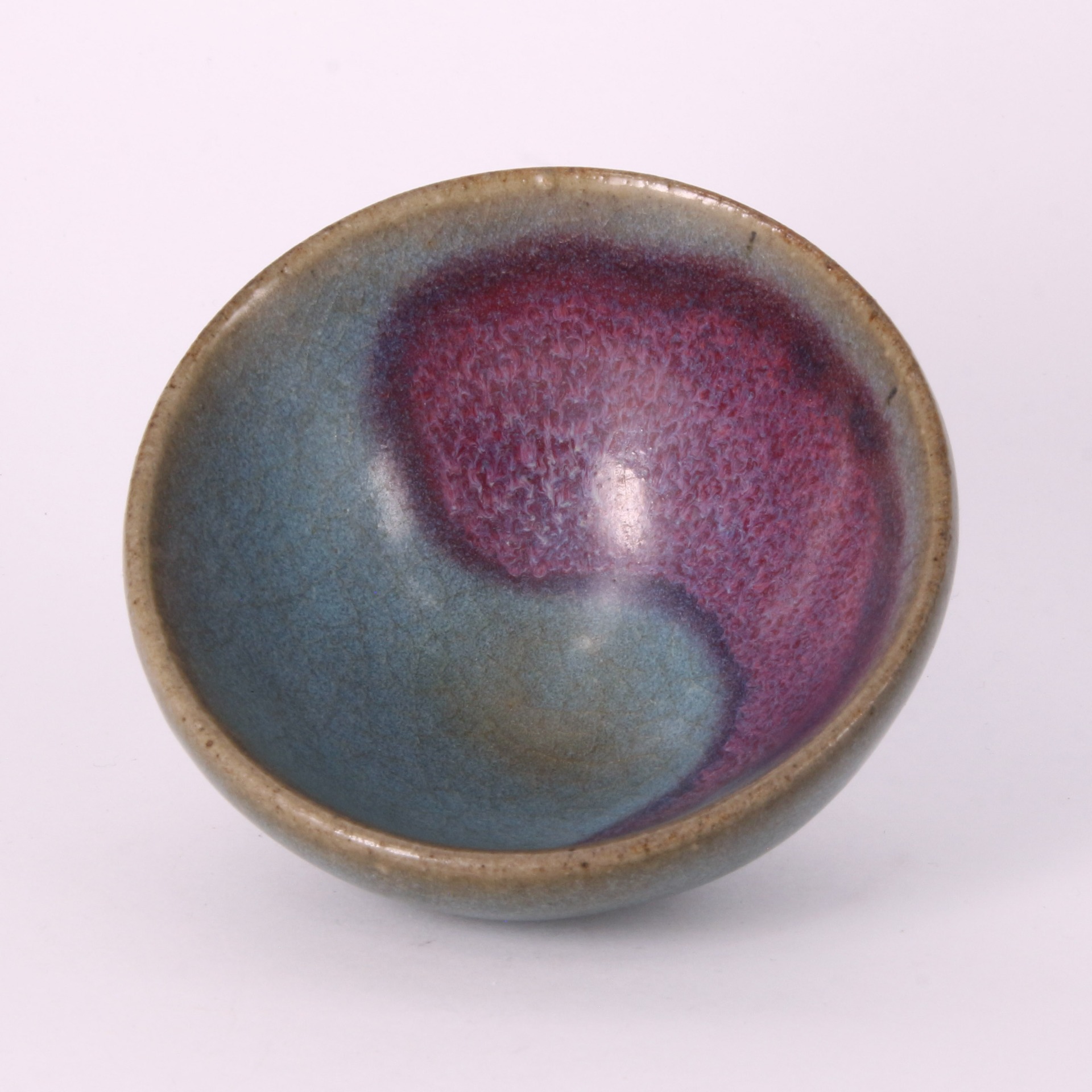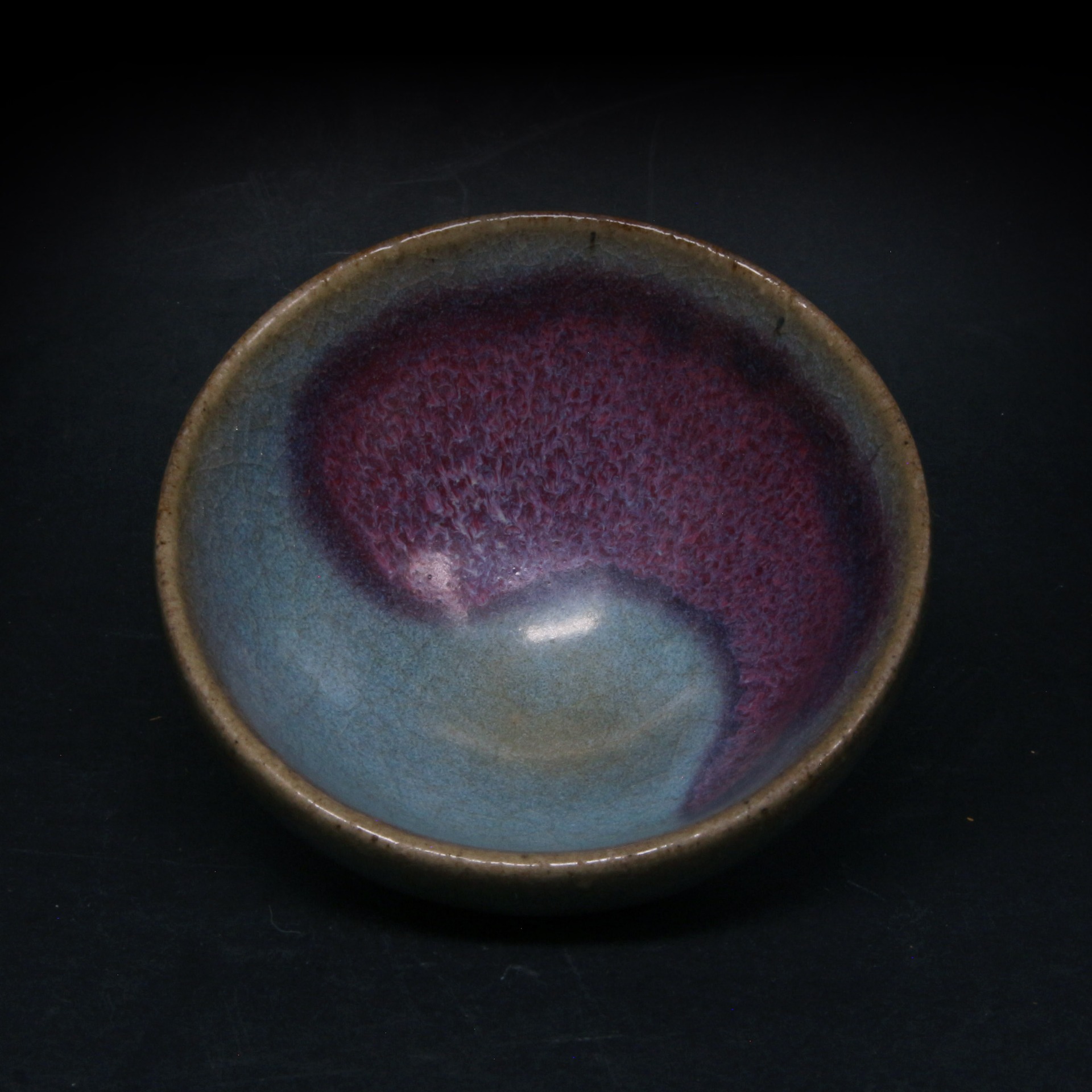 此件泡泡盞為金代鈞窯之精品。盞口微斂,斜腹收底,器形精巧飽滿,正如「泡泡」之名,握於掌中圓潤可人。其最引人入勝之處,在於內壁釉面自然形成的「太極」紋樣:深邃的月白色與瑰麗的紅斑交織錯落,猶如陰陽相生,氣韻生動。紅紫色斑塊色澤濃郁,邊緣暈散自然,與天藍釉底色形成強烈的視覺對比,體現了鈞窯「入窯一色,出窯萬彩」的瑰麗神韻。