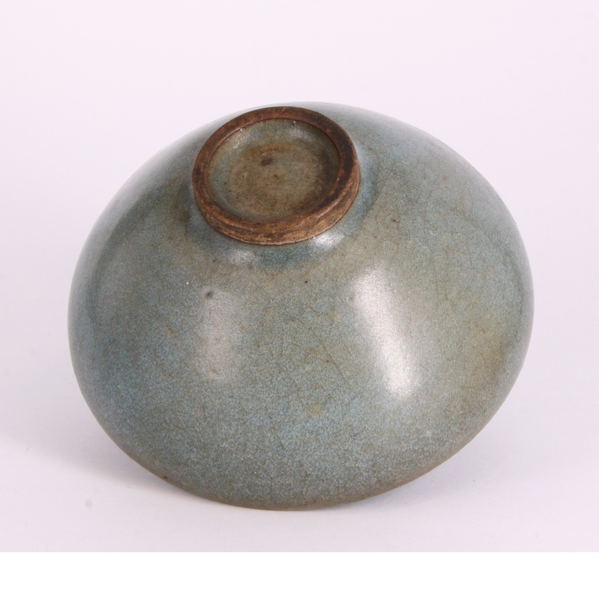 在工藝表現上,此盞釉質肥厚瑩潤,釉面上分布著細密的棕眼與自然開片,呈現出如美玉般的溫潤質感。紫紅斑的形成乃是受原礦物中銅元素的還原作用,在窯火淬煉下幻化而成,不假人工雕飾,呈現出一種流動、深邃的藝術美感。底足露胎處可見胎質堅實,色澤沉穩,展現了金代鈞窯器物大氣與細膩並存的時代特點。其獨特的太極紋飾不僅增添了道家哲思的意境,更是收藏家眼中可